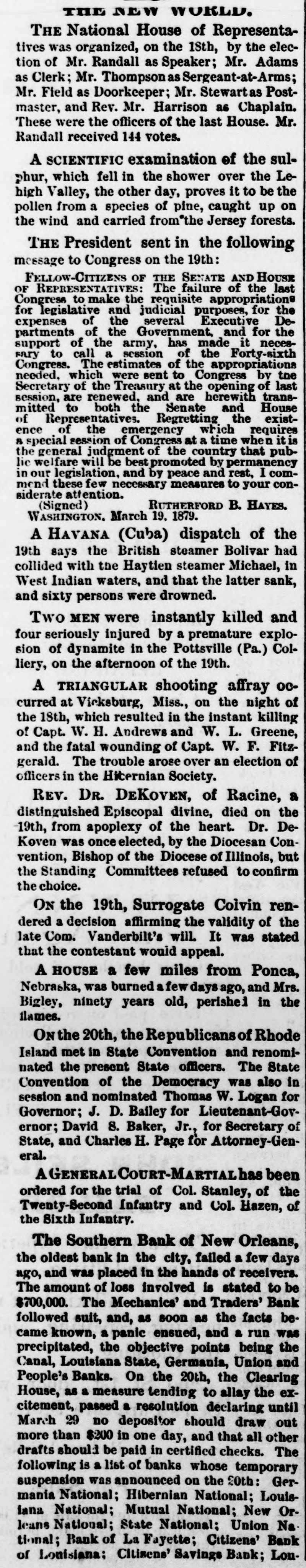 THE NEW WORLD. THE National House of Representatives was organized, on the 18th, by the election of Mr. Randall as Speaker; Mr. Adams as Clerk; Mr. Thompson as Sergeant-at-Arms; Mr. Field as Doorkeeper; Mr. Stewarta Postmaster, and Rev. Mr. Harrison as Chaplain. These were the officers of the last House. Mr. Randall received 144 votes. A SCIENTIFIC examination of the sulphur, which fell in the shower over the Lehigh Valley, the other day, proves it to be the pollen from a species of pine, caught up on the wind and carried from*the Jersey forests. THE President sent in the following message to Congress on the 19th: FELLOW-CITIZENS OF THE SENATE AND HOUSE OF REPRESENTATIVES: The failure of the last Congress to make the requisite appropriations for legislative and judicial purposes, for the expenses of the several Executive Departments of the Government, and for the support of the army, has made it necessary to call a session of the Forty-sixth Congress. The estimates of the appropriations needed, which were sent to Congress by the Secretary of the Treasury at the opening of last session, are renewed. and are herewith transmitted to both the Senate and House of Representatives. Regretting the existence of the emergency which requires a special session of Congress at a time when it is the general judgment of the country that public welfare will be best promoted by permanency in our legislation, and by peace and rest, I commend these few necessary measures to your considerate attention. RUTHERFORD B. HAYES. (Signed) WASHINGTON. March 19. 1879. A HAVANA (Cuba) dispatch of the 19th says the British steamer Bolivar had collided with the Haytien steamer Michael, in West Indian waters, and that the latter sank, and sixty persons were drowned. Two MEN were instantly killed and four seriously injured by a premature explosion of dynamite in the Pottsville (Pa.) Colliery, on the afternoon of the 19th. A TRIANGULAR shooting affray occurred at Vicksburg, Miss., on the night of the 18th, which resulted in the instant killing of Capt. W. H. Andrews and W. L. Greene, and the fatal wounding of Capt. W. F. Fitzgerald. The trouble arose over an election of officers in the Hiternian Society. REV. DR. DEKOVEN, of Racine, a distinguished Episcopal divine, died on the 19th, from apoplexy of the heart. Dr. DeKoven was once elected, by the Diocesan Convention, Bishop of the Diocese of Illinois, but the Standing Committees refused to confirm the choice. ON the 19th, Surrogate Colvin rendered a decision affirming the validity of the late Com. Vanderbilt's will. It was stated that the contestant would appeal. A HOUSE a few miles from Ponca, Nebraska, was burned a few days ago, and Mrs. Bigley, ninety years old, perished in the flames. ON the 20th, the Republicans of Rhode Island met in State Convention and renominated the present State officers. The State Convention of the Democracy was also in session and nominated Thomas W. Logan for Governor; J. D. Bailey for Lieutenant-Governor; David S. Baker, Jr., for Secretary of State, and Charles H. Page for Attorney-General. AGENERALCOURT-MARTIALhas been ordered for the trial of Col. Stanley, of the Twenty-Second Infantry and Col. Hazen, of the Sixth Infantry. The Southern Bank of New Orleans, the oldest bank in the city, failed a few days ago, and was placed in the hands of receivers. The amount of loss involved is stated to be $700,000. The Mechanics' and Traders' Bank followed suit, and, as soon as the facts became known, a panic ensued, and a run was precipitated, the objective points being the Canal, Louisiana State, Germania, Union and People's Banks. On the 20th, the Clearing House, as a measure tending to allay the excitement, passed a resolution declaring until March 29 no depositor should draw out more than $200 in one day, and that all other drafts should be paid in certified checks. The following is a list of banks whose temporary suspension was announced on the 20th: Germania National; Hibernian National; Louisfana National; Mutual National; New Orleans National; State National; Union Na. tional; Bank of La Fayette; Citizens' Bank of Louisiana: Citizens' Savings Bank; Lou-