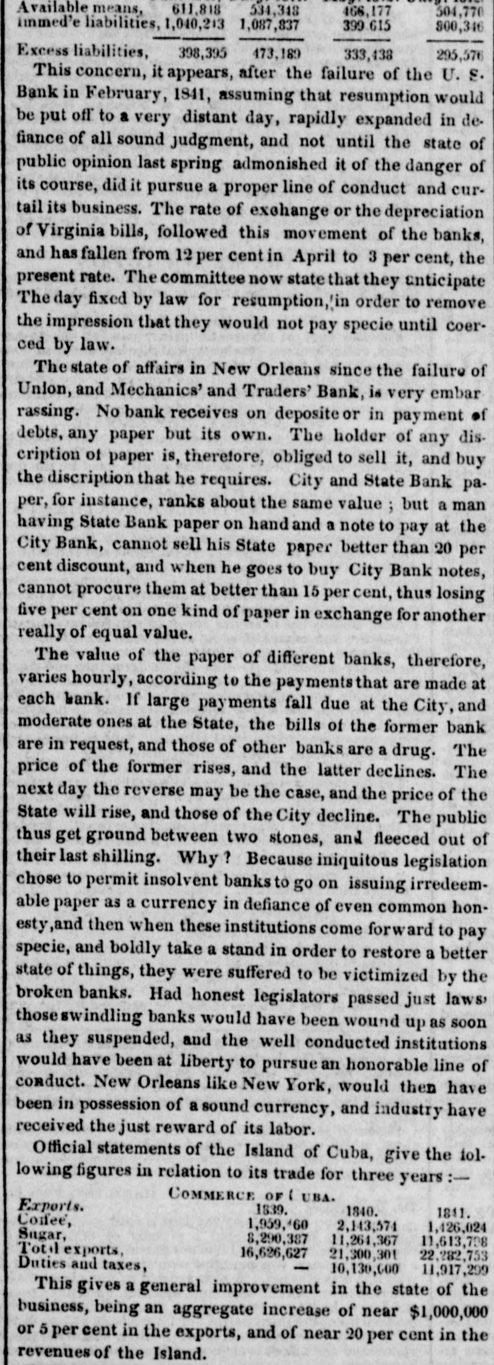 Available means, 611,818 534,348 466,177 504,770 immed'e liabilities, 1,040,213 1,087,837 399.615 800,346 Excess liabilities, 398,395 473,189 333,438 295,576 This concern, it appears, after the failure of the U. S. Bank in February, 1841, assuming that resumption would be put off to a very distant day, rapidly expanded in defiance of all sound judgment, and not until the state of public opinion last spring admonished it of the danger of its course, did it pursue a proper line of conduct and curtail its business. The rate of exchange or the depreciation of Virginia bills, followed this movement of the banks, and has fallen from 12 per cent in April to 3 per cent, the present rate. The committee now state that they anticipate The day fixed by law for resumption, in order to remove the impression that they would not pay specie until coerced by law. The state of affairs in New Orleans since the failure of Union, and Mechanics' and Traders' Bank, is very embarrassing. No bank receives on deposite or in payment of debts, any paper but its own. The holder of any discription of paper is, therefore, obliged to sell it, and buy the discription that he requires. City and State Bank paper, for instance, ranks about the same value; but a man having State Bank paper on hand and a note to pay at the City Bank, cannot sell his State paper better than 20 per cent discount, and when he goes to buy City Bank notes, cannot procure them at better than 15 per cent, thus losing five per cent on one kind of paper in exchange for another really of equal value. The value of the paper of different banks, therefore, varies hourly, according to the payments that are made at each bank. If large payments fall due at the City, and moderate ones at the State, the bills of the former bank are in request, and those of other banks are a drug. The price of the former rises, and the latter declines. The next day the reverse may be the case, and the price of the State will rise, and those of the City decline. The public thus get ground between two stones, and fleeced out of their last shilling. Why? Because iniquitous legislation chose to permit insolvent banks to go on issuing irredeemable paper as a currency in defiance of even common honesty, and then when these institutions come forward to pay specie, and boldly take a stand in order to restore a better state of things, they were suffered to be victimized by the broken banks. Had honest legislators passed just laws, those swindling banks would have been wound up as soon as they suspended, and the well conducted institutions would have been at liberty to pursue an honorable line of conduct. New Orleans like New York, would then have been in possession of a sound currency, and industry have received the just reward of its labor. Official statements of the Island of Cuba, give the following figures in relation to its trade for three years :- Exports. Coffee, Sugar, Total exports, Duties and taxes, COMMERCE OF CUBA. 1839. 1840. 1841. 1,959,460 2,143,574 1,426,024 8,290,387 11,264,367 11,613,798 16,626,627 21,300,301 22,282,753 10,130,000 11,917,299 This gives a general improvement in the state of the business, being an aggregate increase of near $1,000,000 or 5 per cent in the exports, and of near 20 per cent in the revenues of the Island.