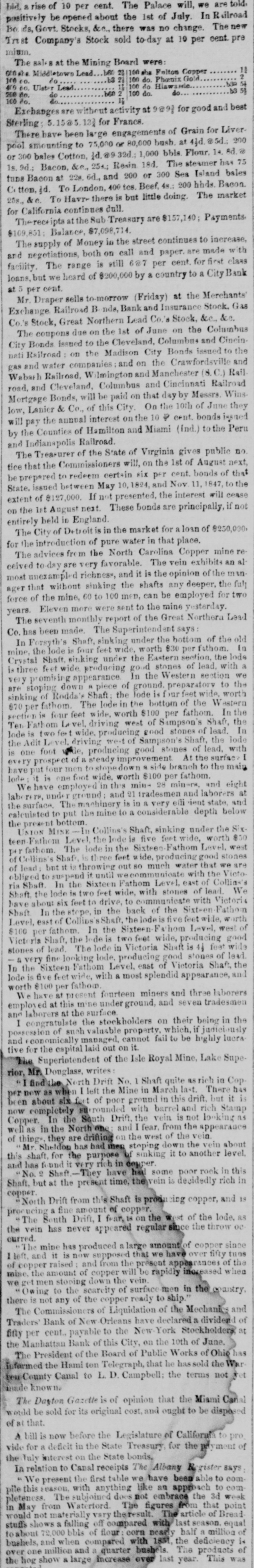 bid, & rise of 10 per cent. The Palace will, we are told, positively be opened about the 1st of July. In Hilroad Bo ds, Govt. Stocks, &c., there was no change. The new In st Company's Stock sold to-day at 10 per cent. pre mium. The sale at the Mining Board were: 11 Middletown Lead 160 % she Falton Copper 21 13 100 do. Phoenix Gold 530 100 Hiawawie Ulster Lead b3 51 b60 100 do. do. 11 100 do. Exchanges are without activity at 9@9} for good and best Sterling: 5.15@5. 131 for Francs. There have been large engagements of Grain for Liverpool amounting to 75,000 or 80,000 bush. at 43d @5d.: 200 or 300 bales Cotton, 1d. @9 32d.; 1,000 bbls. Flour. 14. 8d @ 1s. 9d.: Bacon, &e., 254; Resin 18d. The steamer has 75 tuns Bacon at 22a. 6d., and 200 or 300 Sea Island bales C tton, d. To London, 400 tes. Beef, 48.: 200 hhds. Bacon. 258, &c. To Havr+ there is but little doing. The market for California continues dull. Thereceipts at the Sub Treasury are $157,140; Payments $109,851; Balance, $7,098,714. The supply of Money in the street continues to increase, and negotiations, both on call and paper. are made with facility. The range is still 6@7 per cent for first class loans, but we heard of $200,000 by a country to a City Bank at 5 per cent. Mr. Draper sells to-morrow (Friday) at the Merchants Exchange Railroad B nds, Bank and Insurance Stock. Gas Co.'s Stock, Great Northern Lead Co. Stock, &c., &c. The coupons due on the 1st of June on the Columbus City Bonds issued to the Cleveland, Columbus and Cincinnati Railroad on the Madison City Bonds issued to the gas and water companies and on the Crawfordsville and Wabath Railroad, Vilmington and Manchester (S. C.) Rail road. and Cleveland, Columbus and Cincinnati Railroad Mortgage Bonds, will be paid on that day by Messrs. Wins low, Lanier & Co., of this City. On the 10th of June they will pay the annual interest on the 10 P cent. bonds issued by the Counties of Hamilton and Miami (Ind.) to the Peru and Indianapolis Railroad. The Treasurer of the State of Virginia gives public no tice that the Commissioners will, on the 1st of August next, be prepared to redeem certain six per cent. bonds of that State. issued between May 10, 1824, and Nov 11, 1847, to the extent of $127,000. If not presented, the interest will cease on the 1st August next. These bonds are principally, if not entirely held in England. The City of Detroit is in the market for a loan of $250,000 for the introduction of pure water in that place. The advices fro m the North Carolina Copper mine received to day are very favorable. The vein exhibits an al most unexampled richness, and it is the opinion of the manager that without sinking the shafts any deeper, the full force of the mine, 60 to 100 men, can be employed for two years. Eleven more were sent to the mine yesterday. The seventh monthly report of the Great Northern Lead Co. has been made. The Superintendent says In Forsyth's Shaft, sinking under the bottom of the old mine, the lode is four feet wide, worth $30 per fathom. In Crystal Shaft sinking under the Eastern section, the lode is three feet wide producing good stones of lead, with a very promising appearance. In the Western section we are stoping down piece of ground preparatory to the sinking of Rodda Shaft the Tode is four feet wide, worth 670 per fathom. The lode in the bottom of the W estern section is four feet wide, worth $100 per fathom. In the Ten Fathom vel. driving went of Sampson's Shaft, the lode is two fe+ wide. producing good stones of lead. In the Adit Level. driving west of Sampson's Shaft, the lode producing good stones of lead, with is one foot every prospect of a steady improvement At the surface I have put four men to 9 side branch to the main lode it is one foot wide, worth $100 per fathom. We have employed in this min- 28 miners, and eight labe under ground and 21 tradesmen and laborers at the surface. The machinery is in & very effi ient state, and calculated to put the mine to a considerable depth below the present bottom. UNION MINE In Collins's Shaft, sinking under the Sixteen Fathom Level, the Inde is five feet wide, worth $50 per fathom. The lode in the Sixteen Fathom Level. west f Collins's Shaft is three feet wide, producing good stones of lead; but it is throwing out 80 much water that we are obliged to suspend it until wecommunicate with the Victoria Shaft. In the Sixteen Fathom Level, east of Collins's Shaft the lode is two feet wide, with stones of lead. We have about six feet to drive, to communicate with Victoria Shaft In the stope, in the back of the Sixteen Fathom Level, east of Collins Shaft, the lode is five feet wide, W with $100 per fathom. In the Sixteen Fx hom Level, west of Vict ria Shaft, the lede is two feet wide, producing good stones of lead. The lode in Victoria Shaft is 4, feet wide a very fine looking lode. producing good stones of lead. In the Sixteen Fathom Level, east of Victoria Shaft, the lode is five feet wide, with & most splendid appearance, and worth $100 per fathom. We have at present fourteen miners and three laborers employ ed at this mine under ground, and seven tradesmen and laborers at the surface I congratulate the stockholders on their being in the possession of such valuable property, which, if judiciously and economically managed, cannot fail to be highly lucra tive for the capital laid out on it. The Superistendent of the Isle Royal Mine, Lake Superior, Mr. Douglass, writes: "I find the North Drift No. 1 Shaft quite as rich in Cop. per new as when I left the Mine in March last. There has been about six_feet of poor ground in this drift. but it is now completely su rounded with barrel and rich Stamp Copper. In the South Drift, the vein is not looking as well as in the North and I fear. from the appearance of thing* they are drifting on the west of the vein Mr Sheldon has had men stoping down the vein about this shaft, for the purpose of sinking it to another level. and has found it very rich in copper No. 2 Sha