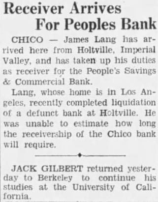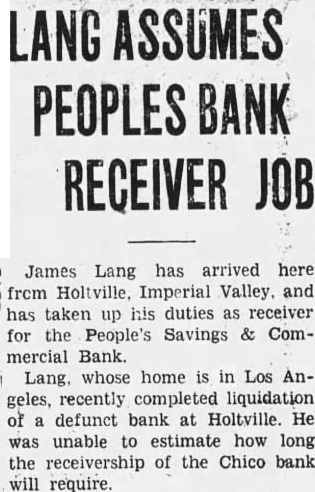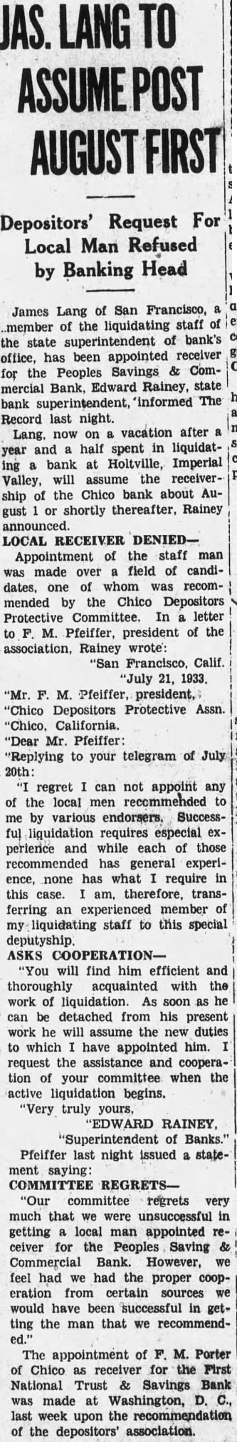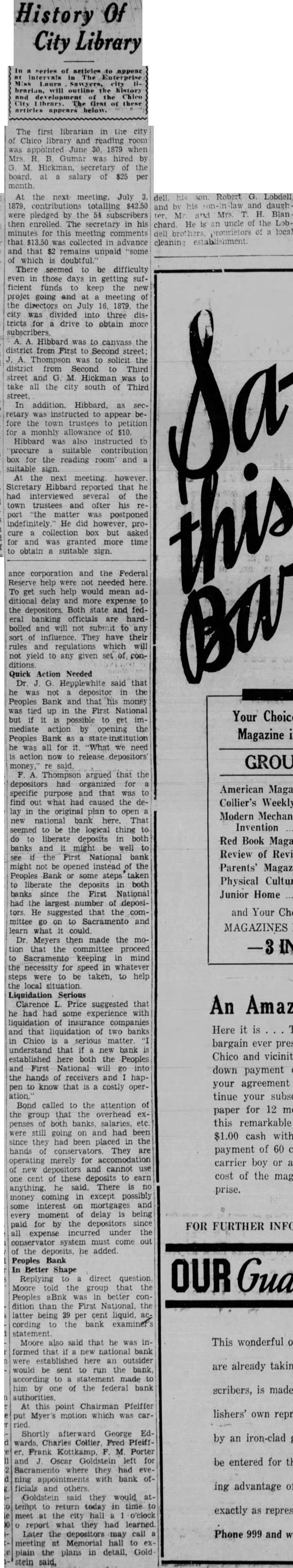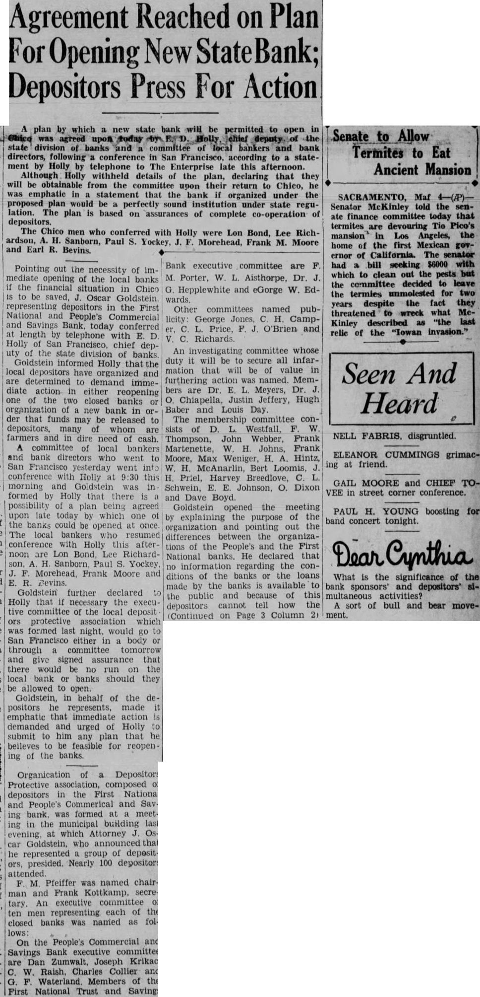 Pointing out the necessity of immediate opening of the local banks the financial situation Chico in to be saved, Oscar Goldstein representing depositors in the First National and People's Commercial and Savings Bank. today conferred length by telephone with E. Holly of San Francisco, chief deputy of the state division of banks. Goldstein informed Holly that the local depositors have organized and determined to demand immediate action either reopening one of the two closed banks organization of new bank in order that funds may be released to depositors, many of whom are farmers and in dire need of cash. committee of local bankers bank directors who went to San Francisco yesterday went conference with Holly at this morning and Goldstein was in formed by Holly that there possibility of plan being agreed upon late today by which one of the banks could be opened once The local bankers who resumed conference Holly this afternoon are Lon Bond, Lee RichardMorehead, Frank Moore and R. Goldstein further declared Holly that necessary the execu tive committee of the local deposit ors protective association which formed last night, would go San Francisco either in body or through committee tomorrow and give signed assurance that there would be on the local bank or banks should they be allowed to open. Goldstein, in behalf of the depositors represents, made emphatic that immediate action demanded and urged of Holly submit to him any plan that he beileves to be feasible for reopen ing of the banks.