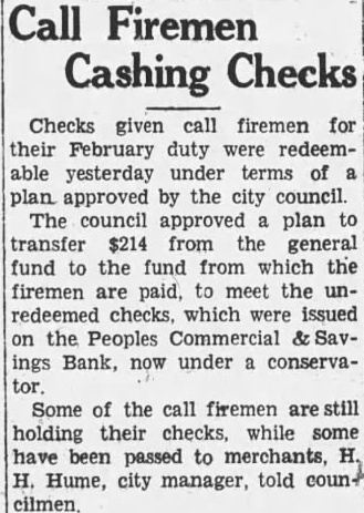 Organication of Depositors Protective association, composed of depositors in the First National and People's and Saving bank, was formed at meeting in the municipal building last evening, at which Attorney Oscar Goldstein, who announced that he represented group of depositors, presided. Nearly 100 depositors Pfeiffer was named chairman and Frank Kottkamp. secretary. An executive committee ten men representing each of the closed banks was named as follows: On the People's Commercial and Savings Bank executive committee are Dan Zumwalt. Joseph Krikac, W. Charles Collier and Waterland. Members of the First National Trust and Savings
