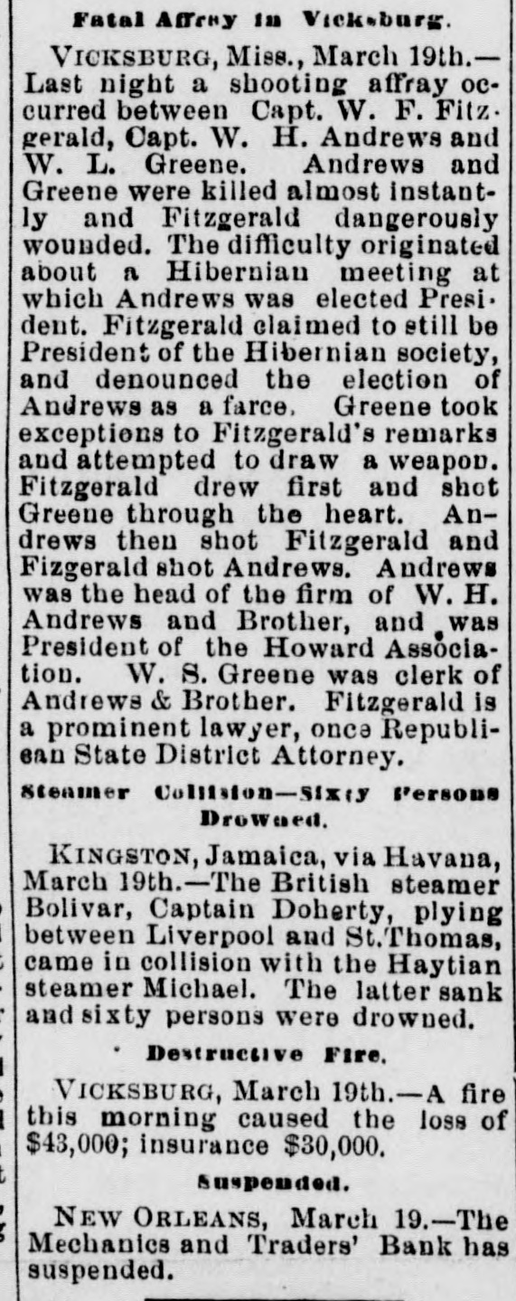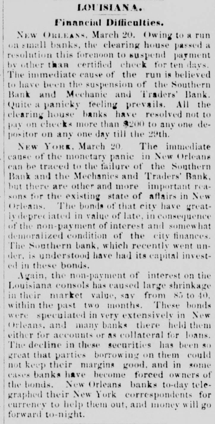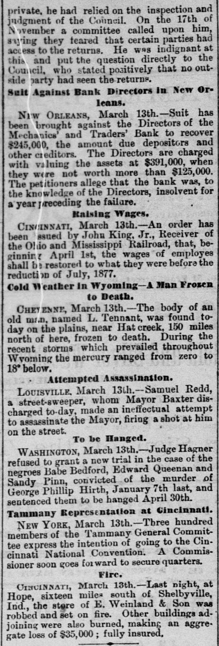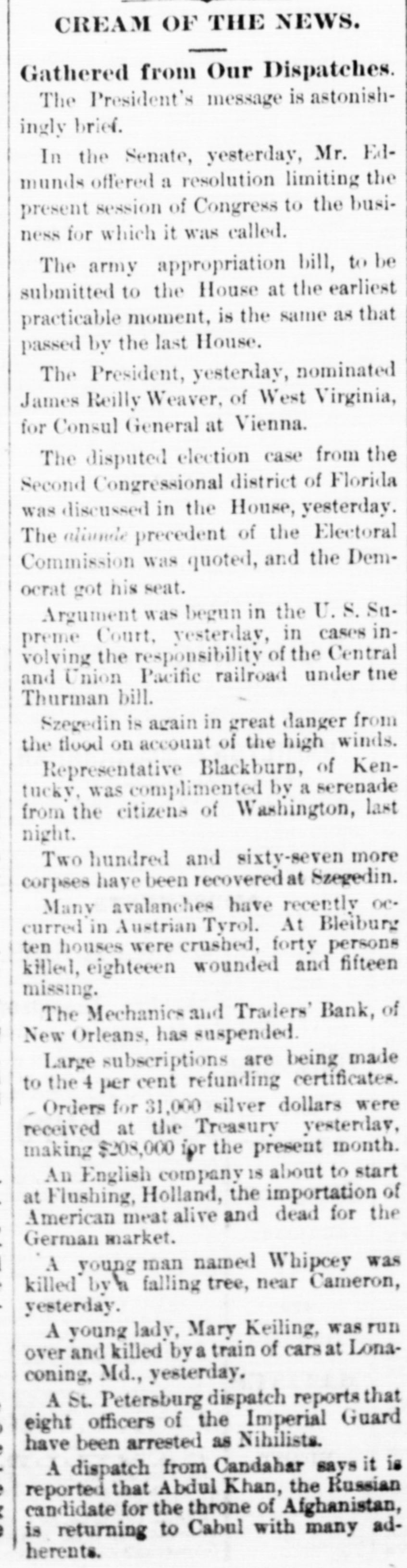 THE NEW WORLD. THE National House of Representatives was organized, on the 18th, by the election of Mr. Randall as Speaker; Mr. Adams as Clerk; Mr. Thompson as Sergeant-at-Arms; Mr. Field as Doorkeeper; Mr. Stewarta Postmaster, and Rev. Mr. Harrison as Chaplain. These were the officers of the last House. Mr. Randall received 144 votes. A SCIENTIFIC examination of the sulphur, which fell in the shower over the Lehigh Valley, the other day, proves it to be the pollen from a species of pine, caught up on the wind and carried from*the Jersey forests. THE President sent in the following message to Congress on the 19th: FELLOW-CITIZENS OF THE SENATE AND HOUSE OF REPRESENTATIVES: The failure of the last Congress to make the requisite appropriations for legislative and judicial purposes, for the expenses of the several Executive Departments of the Government, and for the support of the army, has made it necessary to call a session of the Forty-sixth Congress. The estimates of the appropriations needed, which were sent to Congress by the Secretary of the Treasury at the opening of last session, are renewed. and are herewith transmitted to both the Senate and House of Representatives. Regretting the existence of the emergency which requires a special session of Congress at a time when it is the general judgment of the country that public welfare will be best promoted by permanency in our legislation, and by peace and rest, I commend these few necessary measures to your considerate attention. RUTHERFORD B. HAYES. (Signed) WASHINGTON. March 19. 1879. A HAVANA (Cuba) dispatch of the 19th says the British steamer Bolivar had collided with the Haytien steamer Michael, in West Indian waters, and that the latter sank, and sixty persons were drowned. Two MEN were instantly killed and four seriously injured by a premature explosion of dynamite in the Pottsville (Pa.) Colliery, on the afternoon of the 19th. A TRIANGULAR shooting affray occurred at Vicksburg, Miss., on the night of the 18th, which resulted in the instant killing of Capt. W. H. Andrews and W. L. Greene, and the fatal wounding of Capt. W. F. Fitzgerald. The trouble arose over an election of officers in the Hiternian Society. REV. DR. DEKOVEN, of Racine, a distinguished Episcopal divine, died on the 19th, from apoplexy of the heart. Dr. DeKoven was once elected, by the Diocesan Convention, Bishop of the Diocese of Illinois, but the Standing Committees refused to confirm the choice. ON the 19th, Surrogate Colvin rendered a decision affirming the validity of the late Com. Vanderbilt's will. It was stated that the contestant would appeal. A HOUSE a few miles from Ponca, Nebraska, was burned a few days ago, and Mrs. Bigley, ninety years old, perished in the flames. ON the 20th, the Republicans of Rhode Island met in State Convention and renominated the present State officers. The State Convention of the Democracy was also in session and nominated Thomas W. Logan for Governor; J. D. Bailey for Lieutenant-Governor; David S. Baker, Jr., for Secretary of State, and Charles H. Page for Attorney-General. AGENERALCOURT-MARTIALhas been ordered for the trial of Col. Stanley, of the Twenty-Second Infantry and Col. Hazen, of the Sixth Infantry. The Southern Bank of New Orleans, the oldest bank in the city, failed a few days ago, and was placed in the hands of receivers. The amount of loss involved is stated to be $700,000. The Mechanics' and Traders' Bank followed suit, and, as soon as the facts became known, a panic ensued, and a run was precipitated, the objective points being the Canal, Louisiana State, Germania, Union and People's Banks. On the 20th, the Clearing House, as a measure tending to allay the excitement, passed a resolution declaring until March 29 no depositor should draw out more than $200 in one day, and that all other drafts should be paid in certified checks. The following is a list of banks whose temporary suspension was announced on the 20th: Germania National; Hibernian National; Louisfana National; Mutual National; New Orleans National; State National; Union Na. tional; Bank of La Fayette; Citizens' Bank of Louisiana: Citizens' Savings Bank; Lou-