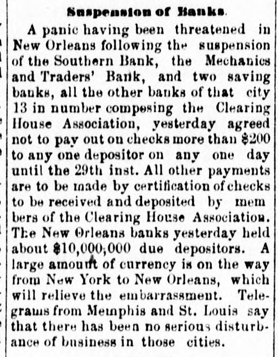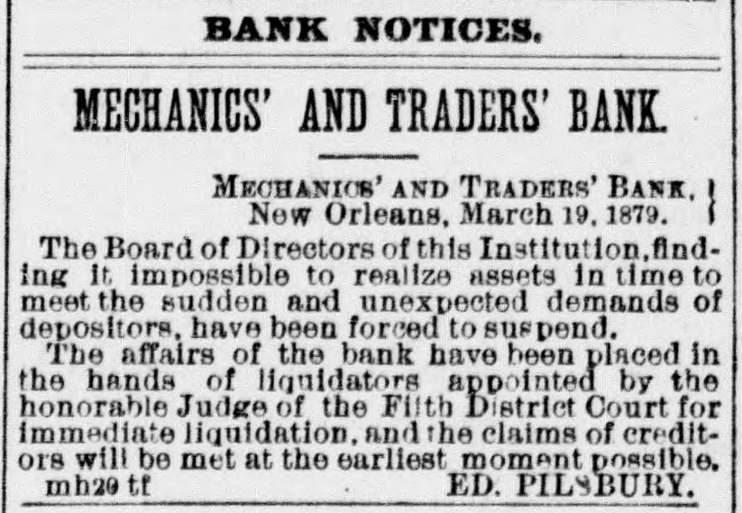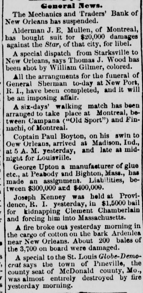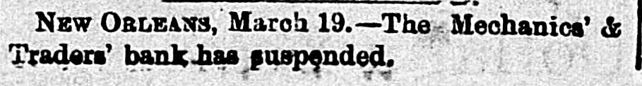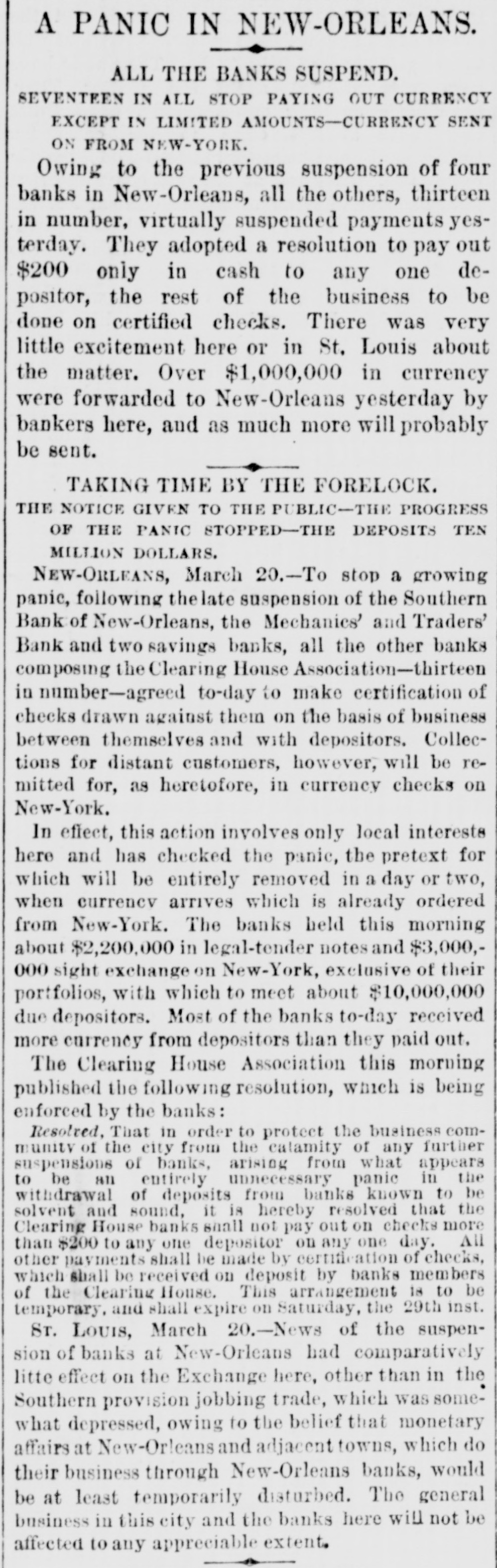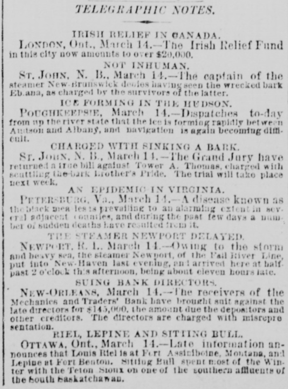 THE NEW WORLD. THE National House of Representatives was organized, on the 18th, by the election of Mr. Randall as Speaker; Mr. Adams as Clerk; Mr. Thompson as Sergeant-at-Arms; Mr. Field as Doorkeeper; Mr. Stewarta Postmaster, and Rev. Mr. Harrison as Chaplain. These were the officers of the last House. Mr. Randall received 144 votes. A SCIENTIFIC examination of the sulphur, which fell in the shower over the Lehigh Valley, the other day, proves it to be the pollen from a species of pine, caught up on the wind and carried from*the Jersey forests. THE President sent in the following message to Congress on the 19th: FELLOW-CITIZENS OF THE SENATE AND HOUSE OF REPRESENTATIVES: The failure of the last Congress to make the requisite appropriations for legislative and judicial purposes, for the expenses of the several Executive Departments of the Government, and for the support of the army, has made it necessary to call a session of the Forty-sixth Congress. The estimates of the appropriations needed, which were sent to Congress by the Secretary of the Treasury at the opening of last session, are renewed. and are herewith transmitted to both the Senate and House of Representatives. Regretting the existence of the emergency which requires a special session of Congress at a time when it is the general judgment of the country that public welfare will be best promoted by permanency in our legislation, and by peace and rest, I commend these few necessary measures to your considerate attention. RUTHERFORD B. HAYES. (Signed) WASHINGTON. March 19. 1879. A HAVANA (Cuba) dispatch of the 19th says the British steamer Bolivar had collided with the Haytien steamer Michael, in West Indian waters, and that the latter sank, and sixty persons were drowned. Two MEN were instantly killed and four seriously injured by a premature explosion of dynamite in the Pottsville (Pa.) Colliery, on the afternoon of the 19th. A TRIANGULAR shooting affray occurred at Vicksburg, Miss., on the night of the 18th, which resulted in the instant killing of Capt. W. H. Andrews and W. L. Greene, and the fatal wounding of Capt. W. F. Fitzgerald. The trouble arose over an election of officers in the Hiternian Society. REV. DR. DEKOVEN, of Racine, a distinguished Episcopal divine, died on the 19th, from apoplexy of the heart. Dr. DeKoven was once elected, by the Diocesan Convention, Bishop of the Diocese of Illinois, but the Standing Committees refused to confirm the choice. ON the 19th, Surrogate Colvin rendered a decision affirming the validity of the late Com. Vanderbilt's will. It was stated that the contestant would appeal. A HOUSE a few miles from Ponca, Nebraska, was burned a few days ago, and Mrs. Bigley, ninety years old, perished in the flames. ON the 20th, the Republicans of Rhode Island met in State Convention and renominated the present State officers. The State Convention of the Democracy was also in session and nominated Thomas W. Logan for Governor; J. D. Bailey for Lieutenant-Governor; David S. Baker, Jr., for Secretary of State, and Charles H. Page for Attorney-General. AGENERALCOURT-MARTIALhas been ordered for the trial of Col. Stanley, of the Twenty-Second Infantry and Col. Hazen, of the Sixth Infantry. The Southern Bank of New Orleans, the oldest bank in the city, failed a few days ago, and was placed in the hands of receivers. The amount of loss involved is stated to be $700,000. The Mechanics' and Traders' Bank followed suit, and, as soon as the facts became known, a panic ensued, and a run was precipitated, the objective points being the Canal, Louisiana State, Germania, Union and People's Banks. On the 20th, the Clearing House, as a measure tending to allay the excitement, passed a resolution declaring until March 29 no depositor should draw out more than $200 in one day, and that all other drafts should be paid in certified checks. The following is a list of banks whose temporary suspension was announced on the 20th: Germania National; Hibernian National; Louisfana National; Mutual National; New Orleans National; State National; Union Na. tional; Bank of La Fayette; Citizens' Bank of Louisiana: Citizens' Savings Bank; Lou-