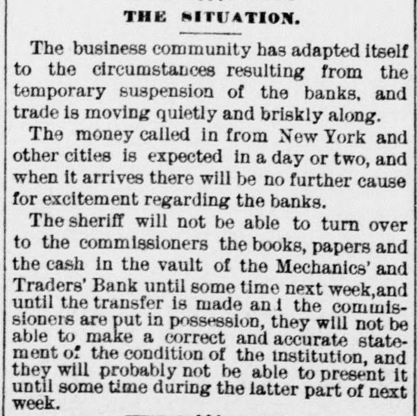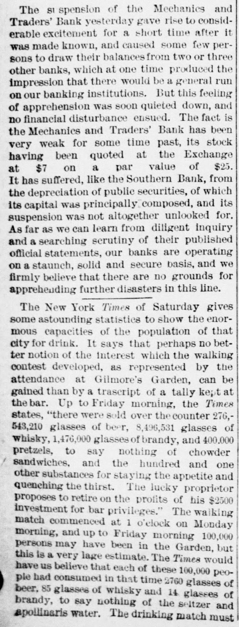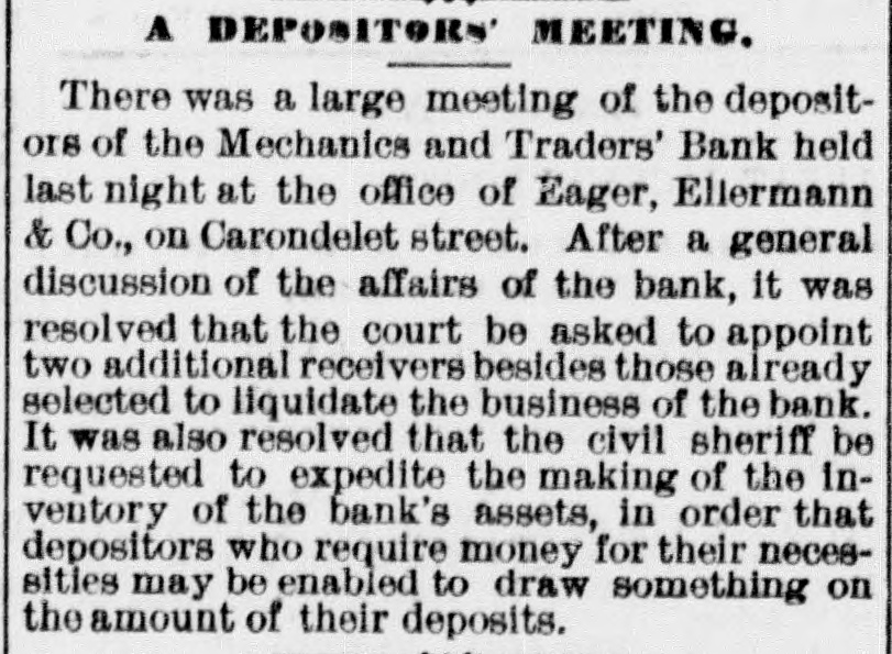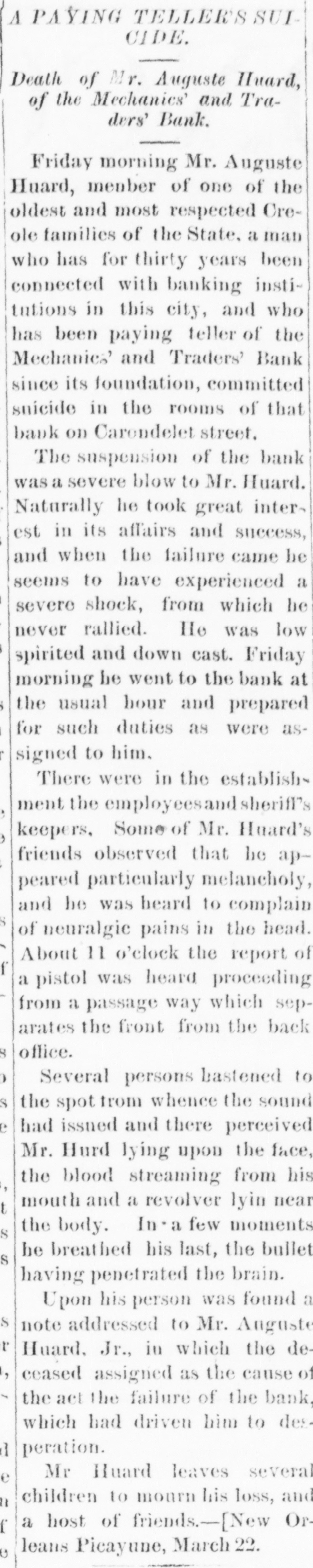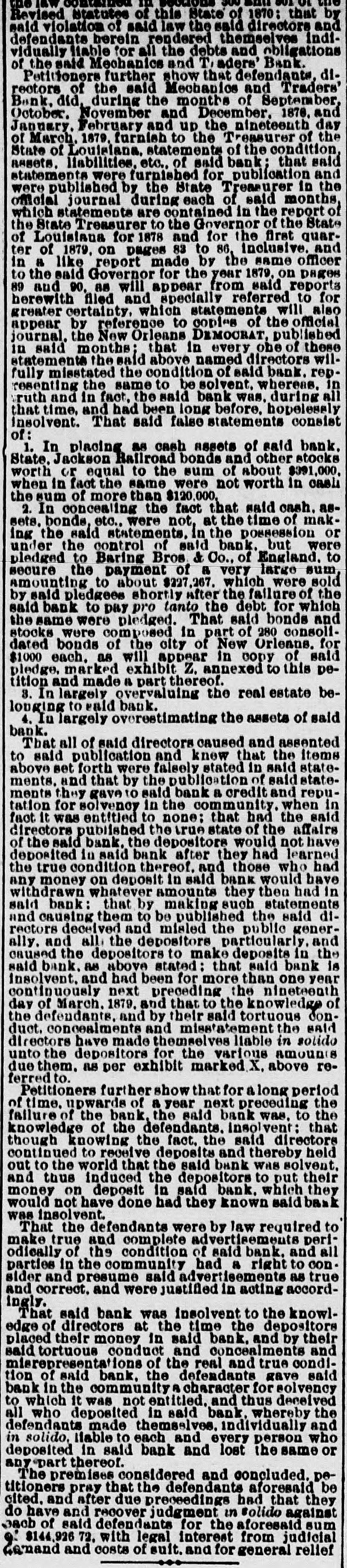 THE NEW WORLD. THE National House of Representatives was organized, on the 18th, by the election of Mr. Randall as Speaker; Mr. Adams as Clerk; Mr. Thompson as Sergeant-at-Arms; Mr. Field as Doorkeeper; Mr. Stewarta Postmaster, and Rev. Mr. Harrison as Chaplain. These were the officers of the last House. Mr. Randall received 144 votes. A SCIENTIFIC examination of the sulphur, which fell in the shower over the Lehigh Valley, the other day, proves it to be the pollen from a species of pine, caught up on the wind and carried from*the Jersey forests. THE President sent in the following message to Congress on the 19th: FELLOW-CITIZENS OF THE SENATE AND HOUSE OF REPRESENTATIVES: The failure of the last Congress to make the requisite appropriations for legislative and judicial purposes, for the expenses of the several Executive Departments of the Government, and for the support of the army, has made it necessary to call a session of the Forty-sixth Congress. The estimates of the appropriations needed, which were sent to Congress by the Secretary of the Treasury at the opening of last session, are renewed. and are herewith transmitted to both the Senate and House of Representatives. Regretting the existence of the emergency which requires a special session of Congress at a time when it is the general judgment of the country that public welfare will be best promoted by permanency in our legislation, and by peace and rest, I commend these few necessary measures to your considerate attention. RUTHERFORD B. HAYES. (Signed) WASHINGTON. March 19. 1879. A HAVANA (Cuba) dispatch of the 19th says the British steamer Bolivar had collided with the Haytien steamer Michael, in West Indian waters, and that the latter sank, and sixty persons were drowned. Two MEN were instantly killed and four seriously injured by a premature explosion of dynamite in the Pottsville (Pa.) Colliery, on the afternoon of the 19th. A TRIANGULAR shooting affray occurred at Vicksburg, Miss., on the night of the 18th, which resulted in the instant killing of Capt. W. H. Andrews and W. L. Greene, and the fatal wounding of Capt. W. F. Fitzgerald. The trouble arose over an election of officers in the Hiternian Society. REV. DR. DEKOVEN, of Racine, a distinguished Episcopal divine, died on the 19th, from apoplexy of the heart. Dr. DeKoven was once elected, by the Diocesan Convention, Bishop of the Diocese of Illinois, but the Standing Committees refused to confirm the choice. ON the 19th, Surrogate Colvin rendered a decision affirming the validity of the late Com. Vanderbilt's will. It was stated that the contestant would appeal. A HOUSE a few miles from Ponca, Nebraska, was burned a few days ago, and Mrs. Bigley, ninety years old, perished in the flames. ON the 20th, the Republicans of Rhode Island met in State Convention and renominated the present State officers. The State Convention of the Democracy was also in session and nominated Thomas W. Logan for Governor; J. D. Bailey for Lieutenant-Governor; David S. Baker, Jr., for Secretary of State, and Charles H. Page for Attorney-General. AGENERALCOURT-MARTIALhas been ordered for the trial of Col. Stanley, of the Twenty-Second Infantry and Col. Hazen, of the Sixth Infantry. The Southern Bank of New Orleans, the oldest bank in the city, failed a few days ago, and was placed in the hands of receivers. The amount of loss involved is stated to be $700,000. The Mechanics' and Traders' Bank followed suit, and, as soon as the facts became known, a panic ensued, and a run was precipitated, the objective points being the Canal, Louisiana State, Germania, Union and People's Banks. On the 20th, the Clearing House, as a measure tending to allay the excitement, passed a resolution declaring until March 29 no depositor should draw out more than $200 in one day, and that all other drafts should be paid in certified checks. The following is a list of banks whose temporary suspension was announced on the 20th: Germania National; Hibernian National; Louisfana National; Mutual National; New Orleans National; State National; Union Na. tional; Bank of La Fayette; Citizens' Bank of Louisiana: Citizens' Savings Bank; Lou-
