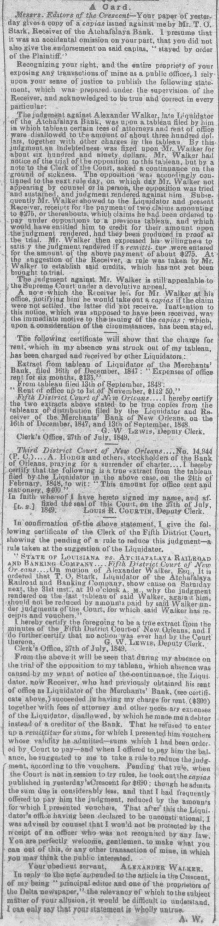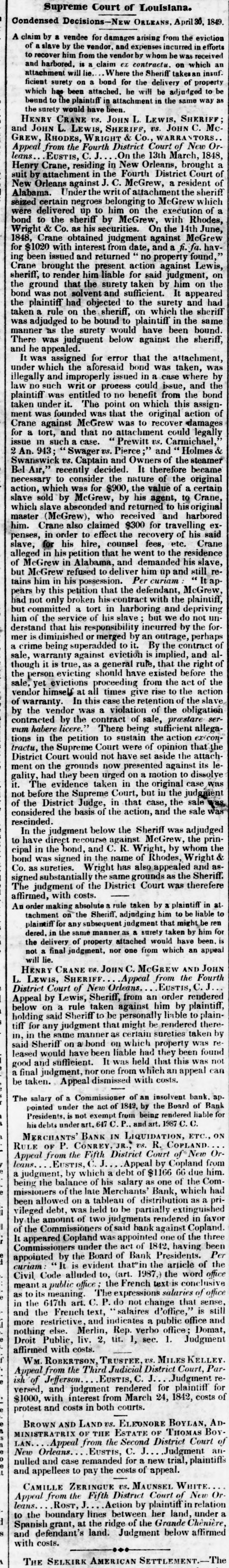 Supreme Court of Louisiana. Condensed Decisions-New ORLEANS, April 30, A claim by a vendee for damages arising from the eviction of slave by the vendor. and expenses incurred in efforts to recover him from the vendor by whom he was received and harbored, is claim ex contractu, on which an attachment will lie. Where the Sheriff takesan insuf. ficient surety on a bond for the delivery of property which has been attached. he will be adjudged to be bound to the plaintiff in attachment in the same way as the surety would have been HENRY CRANE vs. JOHN L LEWIS, SHERIFF and JOHN L. LEWIS, SHERIFF, vs JOHN C. Mc GREW, RHODES, WRIGHT & Co. WARRA TORS Appeal from the Fourth District Court of New Or leans. EUSTIS, C.J. On the 13th March, 1848, Henry Crane, residing in New Orleans, brought suit by attachment in the Fourth District Court of New Orleans against J.C. McGrew, a resident of Alabama. Under the writ of attachment the sheriff seized certain negroes belonging to McGrew which a were delivered up to him on the execution of bond to the sheriff by McGrew, with Rhodes, Wright & Co. as his securities. On the 14th June, 1848, Crane obtained judgment against McGrew for $1020 with interest from date, and a fi. fa. having been issued and returned no property found, Crane brought the present action against Lewis, sheriff, to render him liable for said judgment, on the ground that the surety taken by him on the bond was not solvent and sufficient. It appeared the plaintiff had objected to the surety and had taken a rule on the sheriff, on which the sheriff was adjudged to be bound to plaintiff in the same manner as the surety would have been bound. There was judgment below against the sheriff, and he appealed. It was assigned for error that the attachment, under which the aforesaid bond was taken, was illegally and improperly issued in a case where by law no such writ or process could issue, and the plaintiff was entitled to no benefit from the bond taken under it. The point on which this assignment was founded was that the original action of Crane against McGrew was to recover damages for a tort, and that no attachment could legally issue in such case. Prewitt vs. Carmichael An 943; Swager vs. Pierce ;" and Holmes & Swanswick vs. Captain and Owners of the steamer Air,' recently decided. It therefore became necessary to consider the nature of the original action, which was for $900, the value of a certain slave sold by McGrew, by his agent, to Crane, which slave absconded and returned to his original master (McGrew), who received and harbored him. Crane also claimed $300 for travelling expenses, in order to effect the recovery of his said slave, for his hire, counsel fees, etc. Crane alleged in his petition that he went to the residence of McGrew in Alabama, and demanded his slave, but McGrew refused to deliver him up and still retains him in his possession. Per curiam pears by this petition that the defendant, McGrew. had not only broken his contract with the plaintiff, but committed a tort in harboring and depriving him of the service of his slave but we do not un derstand that his responsibility incurred by the former is diminished or merged by an outrage, perhaps a crime being superadded to it. By the contract of sale, warranty against eviction is implied, and although it is true, as a general rule, that the right of the person evicting should have existed before the sale. yet evictions proceeding from the act of the vendor himself at all times give rise to the action of warranty. In this case the retention of the slave by the vendor was a violation of the obligation contracted by the contract of sale, prestare servum habere licere. There being sufficient allegations in the petition to sustain the action exicontractu, the Supreme Court were of opinion that the District Court would not have set aside the attachment on the grounds now presented against its legality, had they been urged on a motion to dissoly it. The evidence taken in the original case was not before the Supreme Court, but in the judgement of the District Judge, in that case, the sale considered the basis of the action, and the sale was rescinded. In the judgment below the Sheriff was adjudged to have direct recourse against McGrew, the principal in the bond, and C. R. Wright, by whom the bond was signed in the name of Rhodes, Wright & Co. as sureties. Wright has also appealed and assigned substanti lly the same grounds as the Sheriff. The judgment of the District Court was therefere affirmed, with costs. An order making absolute rule taken by a plaintiff in at tachment on the Sheriff, adjudging him to be liable to plaintiff for any subsequent judgment that might be ren dered. in the same manner as surety taken by him for the delivery of property attached would have been. is not final judgment, nor one from which an appeal will lie. HENRY CRANE vs. JOHN C. McGREW AND JOHN L. LEWIS, SHERIFF .Appeal from the Fourth District Court of New Orleans. EUSTIS, C.. Appeal by Lewis, Sheriff, from an order rendered below on a rule taken against him by plaintiff holding said Sheriff to be personally liable to plaintiff for any judgment that might be rendered therein, in the same manner as certain sureties taken by said Sheriff on bond on which property was re leased would have been liable had they been found good and sufficient. It was held that this was not a final judgment, nor one from which an appeal can be taken. Appeal dismissed with costs. The salary of a Commissioner of an insolvent bank. ap. pointed under the act of 1842, by the Board of Bank Presidents, not exempt from being rendered liable for his debts under art. 647 C. P. and art. 1987 C. C. ON MERCHANTS' BANK IN LIQUIDATION, ETC. RULE OF P. CONREY JR. vs. R. COPLAND Appeal from the Fifth District Court of New Orleans. EUSTIS, C.J Appeal by Copland from a judgment, by which a debt of $1166 66 due him. being the balance of his salary as one of the Commissioners of the late Merchants Ban