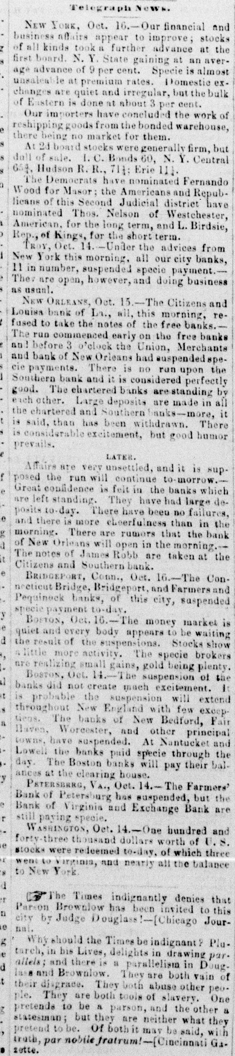THE BANKS IN NEW-ORLEANS. New-Orleans, Wednesday Oct. 14-A. M. The Union Bank has just suspended. There is & heavy run upon all the Free Banks. There is a great deal of excitement. The Branch Mint has purchased from the banks $200,000 in silver. It is paying out gold, and 80 affording some relief. SECOND DISPATCH-P. M. Affairs are yet very unsettled, and it is supposed that the run upon the banks will continue to-morrow. Great confidence is felt in all the banks now standing, and large sums were deposited in them to-day. No failures are reported to day. Appearances are more cheerful than in the morning. There are rumors that the Bank of New-Orleans will open in the morning. Its notes are taken by the Citizens' and Southern Banks and by James Robb & Co. The banking house of James Robb & Co., with others, kept open till 6 o'clock, and not & doubt is ex. pressed as to it or the Southern, the only Free Bank left standing. THIRD DISPATCH. Thursday, Oct. 15-A.M. The run on the Citizens' and Canal Banks continues heavy, but is to a less extent on the rest. There is much excitement, and business is paralyzed. FOURTH DISPATCH. The Citizens' Bank, the Bank of the State of Louisiana, the Bank of Louisiana and the Canal Bank all refused this morning to take the notes of the free banks. The run on the free banks commenced early in the day, and before 3 o'clock the Union, the Merchants' and Traders' and the Bank of New-Orleans suspended specie payments. There was no run on the Southern (free) Bank, and it is considered perfectly good. The bank of James Robb & Co. (free) is considered safe. Its circulation is distant and heavy. The Citizens' Bank held its doors open, paying specie until 6p. m. The chartered banks are standing by each other, and large deposits are being made with them and the Southern Bank. It is said the sums being deposited with them are larger than those drawn out. Although there is considerable excitement, good humor prevails. We have no failures to report to-day.