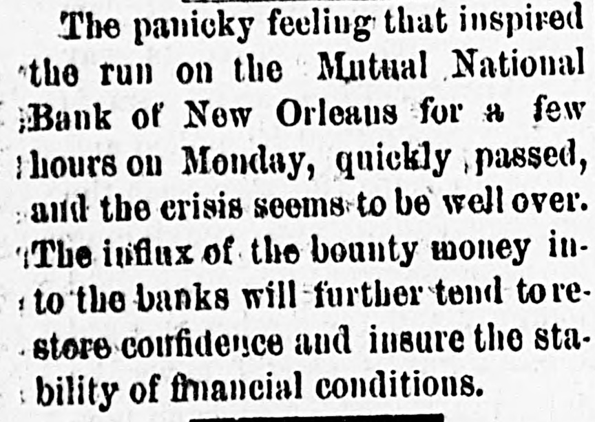 The panicky feeling that inspired the run on the Mutual National Bank of New Orleaus for a few I hours on Monday, quickly passed, and the erisis seems to be well over. : The influx of the bounty money into the banks will further tend to restore confidence and insure the sta: bility of frnancial conditions.