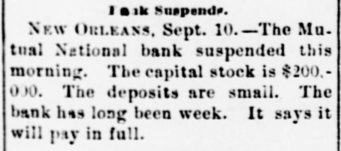 Still Another Closed. NEW ORLEANS, Sept. 10.-The Mutual National bank, 624 and 626 Canal street, closed its doors this morning, Henry Maspero, president; James Tarelteton, cashier. The capital stock of the bank was only $200,000, and its line of deposits very small. It has been regarded as weak for a long time. The bank is said to have sufficient security to liquidate its entire indebtedness. Yesterday a rumor was in circulation that the bank was about to go into liquidation, though the directors had not taken action on the subject. They have now concluded to close.
