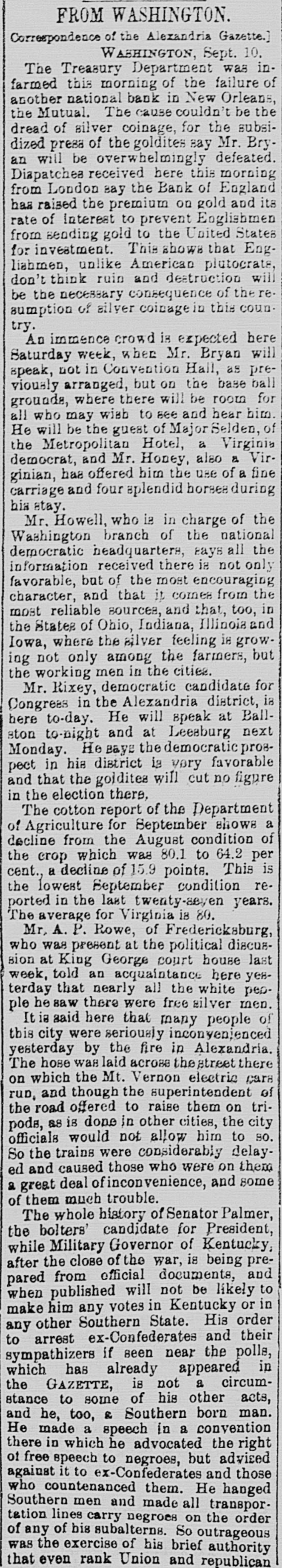FROM WASHINGTON. Correspondence of the Alexandria Gazette.] WASHINGTON, Sept. 10. The Treasury Department was infarmed this morning of the failure of another national bank in New Orleans, the Mutual. The cause couldn't be the dread of silver coinage, for the subsidized press of the goldites say Mr. Bryan will be overwhelmingly defeated. Dispatches received here this morning from London say the Bank of England has raised the premium on gold and its rate of Interest to prevent Englishmen from sending gold to the United States for investment. This shows that Englishmen, unlike American plutocrats, don't think ruin and destruction will be the necessary consequence of the resumption of silver coinagei this country. An immence crowd is expected here Saturday week, when Mr. Bryan will speak, not in Convention Hall, as previously arranged, but on the base ball grounds, where there will be room for all who may wish to see and hear him. He will be the guest of Major Selden, of the Metropolitan Hotel, a Virginia democrat, and Mr. Honey, also & Virginian, has offered him the use of a fine carriage and four splendid horsesduring his stay. Mr. Howell, who is in charge of the Washington branch of the national democratic headquarters, says all the information received there is not only favorable, but of the most encouraging character, and that it comes from the most reliable sources, and that, too, in the States of Ohio, Indiana, Illinois and Iowa, where the silver feeling is growing not only among the farmers, but the working men in the cities. Mr. Rixey, democratic candidate for Congress in the Alezandria district, is here to-day. He will speak at Ballston to-night and at Leesburg next Monday. He Bays the democratic prospect in his district is very favorable and that the goldites will cut no figure in the election there, The cotton report of the Department of Agriculture for September shows a decline from the August condition of the crop which was 80.1 to 64.2 per cent., a decline of 15.9 points. This is the lowest September condition reported in the last twenty-seven years. The average for Virginia is 80. Mr. A. P. Rowe, of Fredericksburg, who was present at the political discussion at King George court house last week, told an acquaintance here yesterday that nearly all the white pepple he saw there were free silver men. It is said here that many people of this city were seriously inconyenjenced yesterday by the fire in Alexandria. The hose was laid across the street there on which the Mt. Vernon electric cars run, and though the superintendent of the road offered to raise them on tripods, as is done in other cities, the city officials would not allow him to so. So the trains were considerably delayed and caused those who were on them a great deal of inconvenience, and some of them much trouble. The whole history of Senator Palmer, the bolters' candidate for President, while Military Governor of Kentucky, after the close of the war, is being prepared from official documents, and when published will not be likely to make him any votes in Kentucky or in any other Southern State. His order to arrest ex-Confederates and their sympathizers if seen near the polls, which has already appeared in the GAZETTE, is not a circumstance to some of his other acts, and he, too, & Southern born man. He made a speech in a convention there in which he advocated the right of free speech to negroes, but advised against it to ex-Confederates and those who countenanced them. He hanged Southern men and made all transportation lines carry negroes on the order of any of his subalterns. So outrageous was the exercise of his brief authority that even rank Union and republican