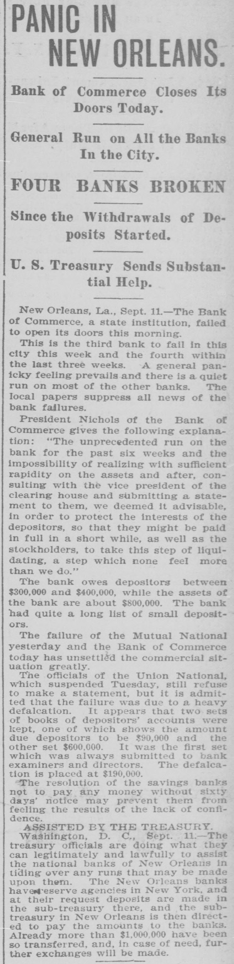 PANIC IN NEW ORLEANS. Bank of Commerce Closes Its Doors Today. General Run on All the Banks In the City. FOUR BANKS BROKEN Since the Withdrawals of Deposits Started. U.S. Treasury Sends Substantial Help. New Orleans, La., Sept. 11.-The Bank of Commerce, a state institution, failed to open its doors this morning. This is the third bank to fail in this city this week and the fourth within the last three weeks. A general panicky feeling prevails and there is a quiet run on most of the other banks. The Iocal papers suppress all news of the bank failures. President Nichols of the Bank of Commerce gives the following explanation: "The unprecedented run on the bank for the past six weeks and the impossibility of realizing with sufficient rapidity on the assets and after, consulting with the vice president of the clearing house and submitting a statement to them, we deemed it advisable, in order to protect the interests of the depositors, so that they might be paid in full in a short while, as well as the stockholders, to take this step of liquidating, a step which none feel more than we do." The bank owes depositors between $300,000 and $400,000, while the assets of the bank are about $800,000. The bank had quite a long list of small depositors. The failure of the Mutual National yesterday and the Bank of Commerce today has unsettled the commercial situation greatly. The officials of the Union National, which suspended Tuesday, still refuse to make a statement, but it is admitted that the failure was due to a heavy defalcation. It appears that two sets of books of depositors' accounts were kept, one of which shows the amount due depositors to be $90,000 and the other set $600,000. It was the first set which was always submitted to bank examiners and directors. The defalcation is placed at $190,000. The resolution of the savings banks not to pay any money without sixty days' notice may prevent them from feeling the results of the lack of confidence. ASSISTED BY THE TREASURY. Washington, D. C., Sept. 11.-The treasury officials are doing what they can legitimately and lawfully to assist the national banks of New Orleans in tiding over any runs that may be made upon them. The New Orleans banks havenreserve agencies in New York, and at their request deposits are made in the sub-treasury there, and the subtreasury in New Orleans is then directed to pay the amounts to the banks. Already more than $1,000,000 have been so transferred, and, in case of need, further exchanges will be made.