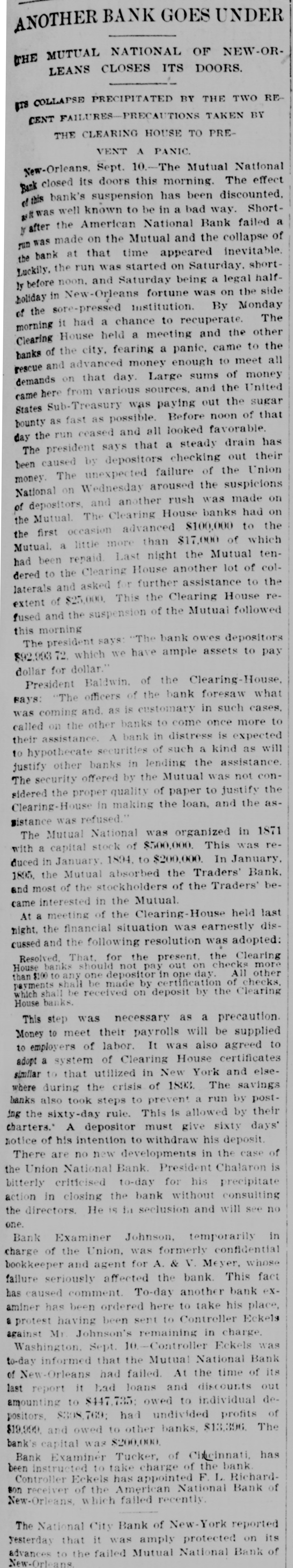 ANOTHER BANK GOES UNDER THE MUTUAL NATIONAL OF NEW-ORLEANS CLOSES ITS DOORS. ITS COLLAPSE PRECIPITATED BY THE TWO RECENT FAILURESPRECAUTIONS TAKEN BY THE CLEARING HOUSE TO PREVENT A PANIC. New-Orleans Sept. 0.-The Mutual National bank's Bank of this closed its known suspension doors this be has morning. bad been discounted. The Short- effect well to in a way. the a r after sit was American National and the Bank collapse failed of run was made on the Mutual the bank at that time appeared inevitable. the run was started on Saturday. shortby noon. and a in New-Orleans was on holiday Luckily. before Saturday fortune being By legal the half- side sore-pressed institution. it had a chance to recuperate. House held a meeting morning Clearing of the and the Monday to other The the banks of the city, fearing a panic, came rescue and advanced money enough to meet all demands on that day. Large sums of money here from various sources, and the United Sub-Treasury was sugar as fast as possible. noon bounty came States paying Before out the of that day run ceased and all says that a has The the president looked steady favorable. drain out been caused by depositors checking their money. The unexpected failure of the Union National on Wednesday aroused the suspicions of depositors, and another rush was made on the Mutual. The Clearing House banks had on the first occasion advanced $100,000 to the Mutual. a little more than $17,000 of which had been repaid. Last night the Mutual tendered to the Clearing House another lot of collaterals and asked for further assistance to the extent of $25,000. This the Clearing House refused and the suspension of the Mutual followed this morning says: "The bank owes depositors which we pay $92,993.72. The president have ample assets to dollar for dollar. President Baldwin. of the Clearing-House, says: "The officers of the bank foresaw what was coming and. as is customary in such cases, called on the other banks to come once more to their assistance. A bank in distress is expected to hypothecate securities of such a kind as will justify other banks in lending the assistance. The security offered by the Mutual was not considered the proper quality of paper to justify the Clearing-House in making the loan, and the assistance was refused." The Mutual National was organized in 1871 with a capital stock of $500,000. This was reduced in January, 1894. to $200,000. In January. 1895. the Mutual absorbed the Traders' Bank, and most of the stockholders of the Traders' became interested in the Mutual. At a meeting of the Clearing-House held last night. the financial situation was earnestly discussed and the following resolution was adopted: Resolved. That, for the present. the Clearing banks should not pay out on checks more to than $100 House any one depositor in one day. All other payments shall be made by certification of checks. which shall be received on deposit by the Clearing House banks. This step was necessary as a precaution. Money to meet their payrolls will be supplied to employers of labor. It was also agreed to adopt a system of Clearing House certificates similar to that utilized in New York and elsewhere during the crisis of 1893. The savings banks also took steps to prevent a run by posting the sixty-day rule. This is allowed by their charters. A depositor must give sixty days' notice of his intention to withdraw his deposit. There are no new developments in the case of the Union National Bank. President Chalaron is bitterly criticised to-day for his precipitate action in closing the bank without consulting the directors. He is in seclusion and will see no one. Bank Examiner Johnson, temporarily in charge of the Union, was formerly confidential bookkeeper and agent for A. & V. Meyer, whose failure seriously affected the bank. This fact has caused comment. To-day another bank examiner has been ordered here to take his place, a protest having been sent to Contreller Eckels against Mr Johnson's remaining in charge. Washington. Sept. 10.-Controller Fekels was to-day informed that the Mutual National Bank of New-Orleans had failed. At the time of its last report it had loans and discounts out amounting to $447,735 owed to individual depositors, $308,769; had undivided profits of $19,999 and owed to other banks, $13,396. The bank's capital was $200,000. Bank Examiner Tucker, of Chicinnati, has been instructed to take charge of the bank Controller Eckels has appointed F. 1. Richardson receiver of the American National Bank of New-Orleans, which failed recently The National City Bank of New-York reported yesterday that it was amply protected on its advances to the failed Mutual National Bank of New-Orleans