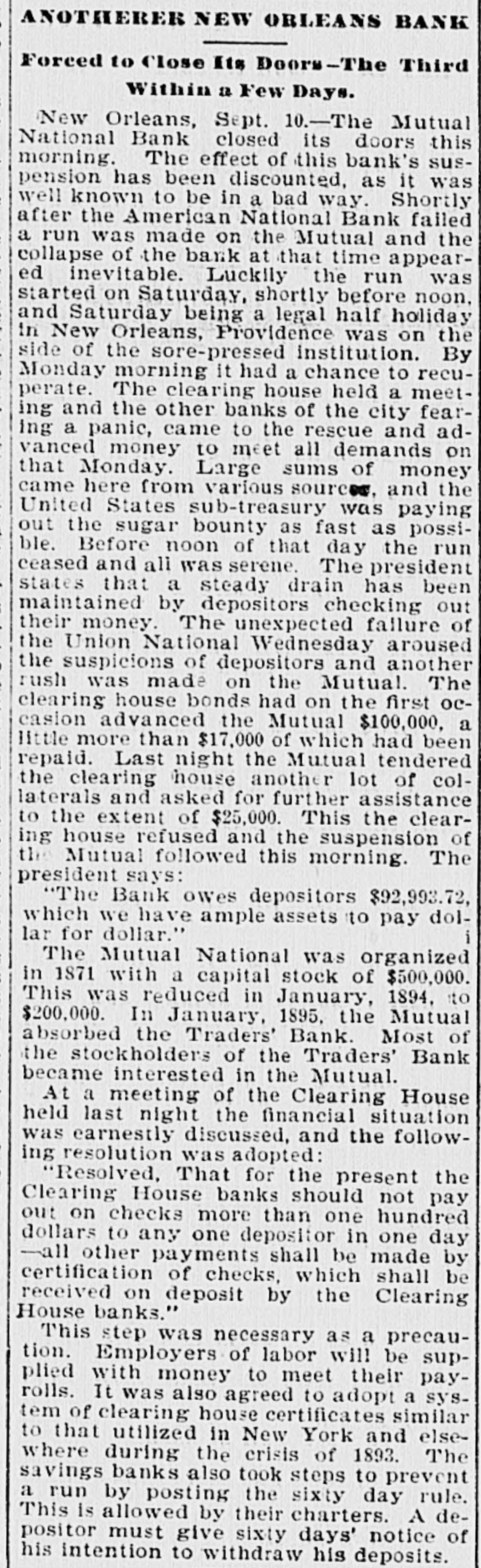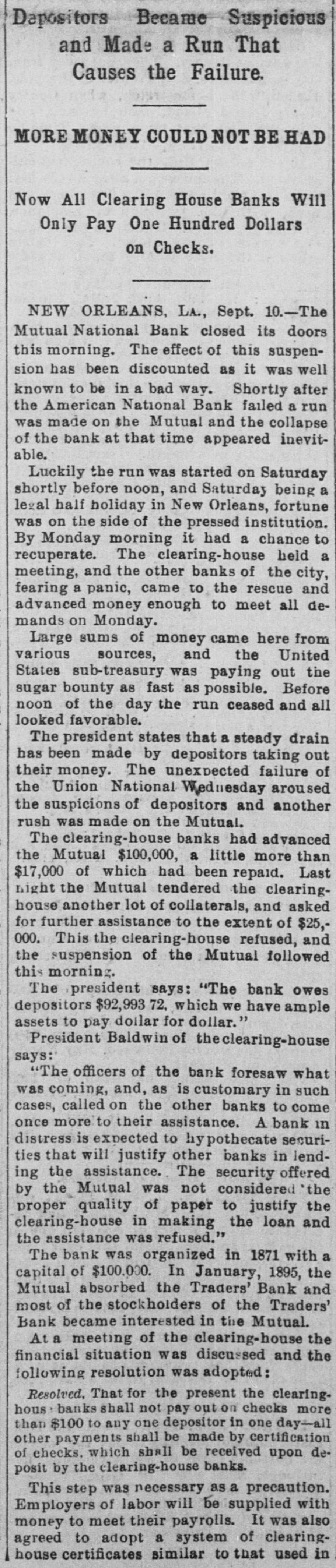 Dapositors Became Suspicious and Made a Run That Causes the Failure. MORE MONEY COULD NOT BE HAD Now All Clearing House Banks Will Only Pay One Hundred Dollars on Checks. NEW ORLEANS, LA., Sept. 10.-The Mutual National Bank closed its doors this morning. The effect of this suspension has been discounted as it was well known to be in a bad way. Shortly after the American National Bank failed a run was made on the Mutual and the collapse of the bank at that time appeared inevitable. Luckily the run was started on Saturday shortly before noon, and Saturday being a legal half holiday in New Orleans, fortune was on the side of the pressed institution. By Monday morning it had a chance to recuperate. The clearing-house held a meeting, and the other banks of the city, fearing a panic, came to the rescue and advanced money enough to meet all demands on Monday. Large sums of money came here from various sources, and the United States sub-treasury was paying out the sugar bounty as fast as possible. Before noon of the day the run ceased and all looked favorable. The president states that a steady drain has been made by depositors taking out their money. The unexpected failure of the Union National Wednesday aroused the suspicions of depositors and another rush was made on the Mutual. The clearing-house banks had advanced the Mutual $100,000, a little more than $17,000 of which had been repaid. Last night the Mutual tendered the clearinghouse another lot of collaterals, and asked for further assistance to the extent of $25,000. This the clearing-house refused, and the suspension of the Mutual followed this morning. The president says: "The bank owes depositors $92,993 72. which we have ample assets to pay dollar for dollar." President Baldwin of the clearing=house says: "The officers of the bank foresaw what was coming, and, as is customary in such cases, called on the other banks to come once more to their assistance. A bank in distress is expected to hy pothecate securities that will justify other banks in lending the assistance. The security offered by the Mutual was not considered *the proper quality of paper to justify the clearing-house in making the loan and the assistance was refused." The bank was organized in 1871 with a capital of $100.000. In January, 1895, the Mutual absorbed the Traders' Bank and most of the stockholders of the Traders' Bank became interested in the Mutual. At a meeting of the clearing-house the financial situation was discussed and the following resolution was adopted: Resolved, That for the present the clearing. hous banks shall not pay out on checks more than $100 to any one depositor in one day-all other payments shall be made by certification of checks. which shall be received upon deposit by the clearing-house banks. This step was necessary as a precaution. Employers of labor will be supplied with money to meet their payrolls. It was also agreed to adopt a system of clearinghouse certificates similar to that used in