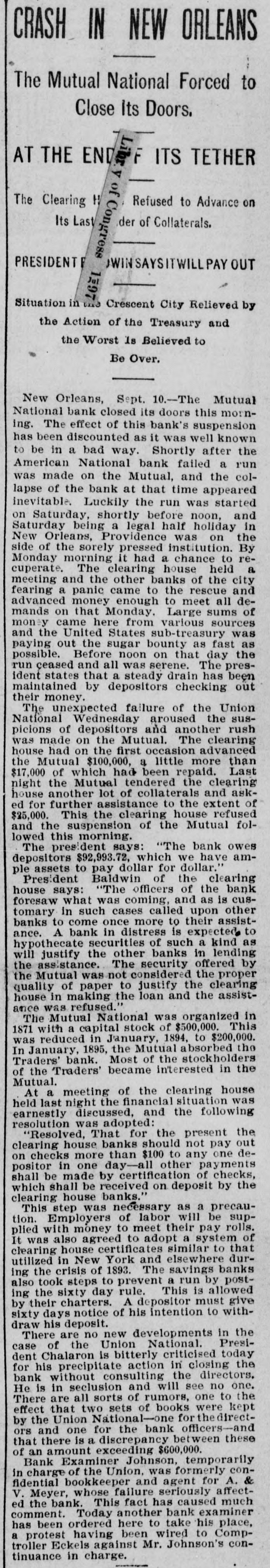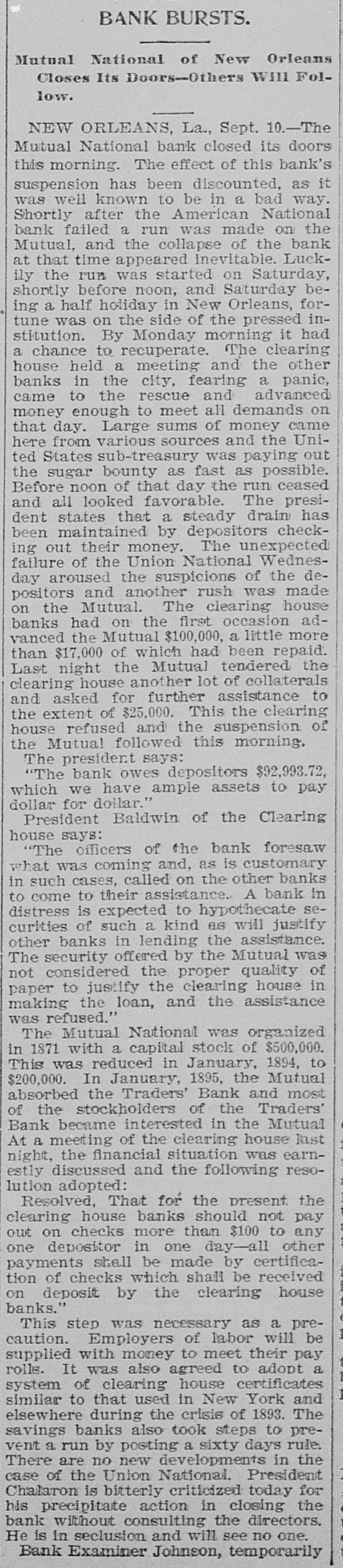 BANK BURSTS. Mutual National of New Orleans Closes Its Doors-Others Will Follow. NEW ORLEANS, La., Sept. 10.-The Mutual National bank closed its doors this morning. The effect of this bank's suspension has been discounted, as it was well known to be in a bad way. Shortly after the American National bank failed a run was made on the Mutual, and the collapse of the bank at that time appeared inevitable. Luckily the run was started on Saturday, shortly before noon, and Saturday being a half holiday in New Orleans, fortune was on the side of the pressed institution. By Monday morning it had a chance to recuperate. The clearing house held a meeting and the other banks in the city, fearing a panic, came to the rescue and advanced money enough to meet all demands on that day. Large sums of money came here from various sources and the United States sub-treasury was paying out the sugar bounty as fast as possible. Before noon of that day the run ceased and all looked favorable. The president states that a steady drain has been maintained by depositors checking out their money. The unexpected failure of the Union National Wednesday aroused the suspicions of the depositors and another rush was made on the Mutual. The clearing house banks had on the first occasion advanced the Mutual $100,000, a little more than $17,000 of which had been repaid. Last night the Mutual tendered the clearing house another lot of collaterals and asked for further assistance to the extent of $25,000. This the clearing house refused and the suspension of the Mutual followed this morning. The president says: "The bank owes depositors $92,993.72, which we have ample assets to pay dollar for dollar." President Baldwin of the Clearing house says: "The officers of the bank foresaw what was coming and, as is customary in such cases, called on the other banks to come to their assistance. A bank in distress is expected to hypothecate securities of such a kind as will justify other banks in lending the assistance. The security offered by the Mutual was not considered the proper quality of paper to justify the clearing house in making the loan, and the assistance was refused." The Mutual National was organized in 1871 with a capital stock of $500,000. This was reduced in January, 1894, to $200,000. In January, 1895, the Mutual absorbed the Traders' Bank and most of the stockholders of the Traders' Bank became interested in the Mutual At a meeting of the clearing house last night, the financial situation was earnestly discussed and the following resolution adopted: Resolved, That for the present the clearing house banks should not pay out on checks more than $100 to any one depositor in one day-all other payments shall be made by certification of checks which shall be received on deposit by the clearing house banks." This step was necessary as a precaution. Employers of labor will be supplied with money to meet their pay rolls. It was also agreed to adopt a system of clearing house certificates 1 similar to that used in New York and elsewhere during the crisis of 1893. The savings banks also took steps to prevent a run by posting a sixty days rule. There are no new developments in the case of the Union National. President Chalaron is bitterly criticized today for his precipitate action in closing the bank without consulting the directors. He is in seclusion and will see no one. Bank Examiner Johnson, temporarily