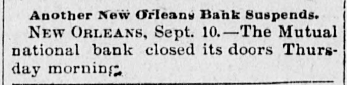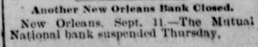 Another New Orleans Bank Suspends. NEW ORLEANS, Sept. 10.-The Mutual national bank closed its doors Thursday morning