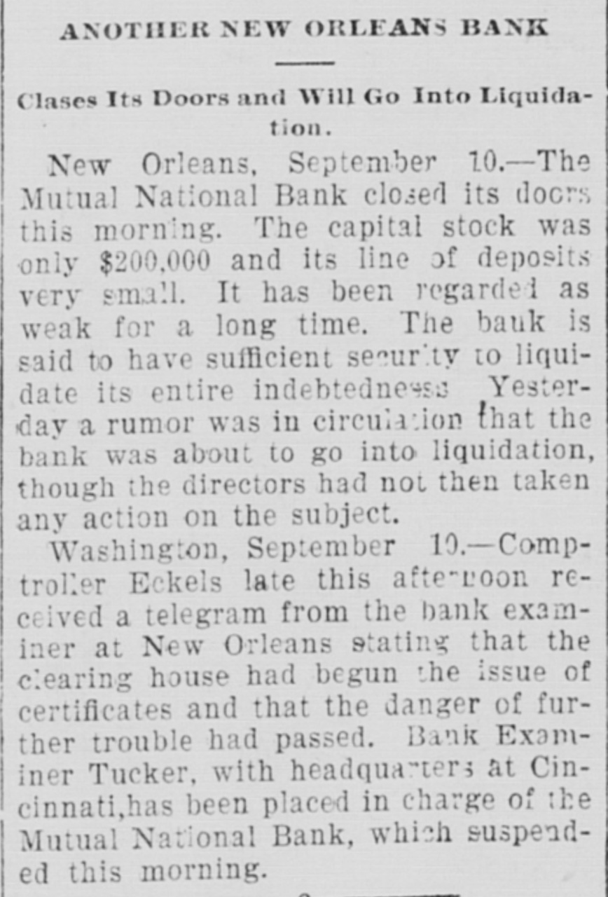 ANOTHER NEW ORLEANS BANK Clases Its Doors and Will Go Into Liquidation. New Orleans, September 10.-The Mutual National Bank closed its doors this morning. The capital stock was only $200,000 and its line of deposits very small. It has been regarded as weak for a long time. The bauk is said to have sufficient security to liquidate its entire indebtedness Yesterday a rumor was in circulation that the bank was about to go into liquidation, though the directors had not then taken any action on the subject. Washington, September 10.-Comptroller Eckels late this afterroon received a telegram from the bank examiner at New Orleans stating that the clearing house had begun the issue of certificates and that the danger of further trouble had passed. Bank Examiner Tucker, with headquarter3 at Cincinnati,has been placed in charge of the Mutual National Bank, which suspended this morning.