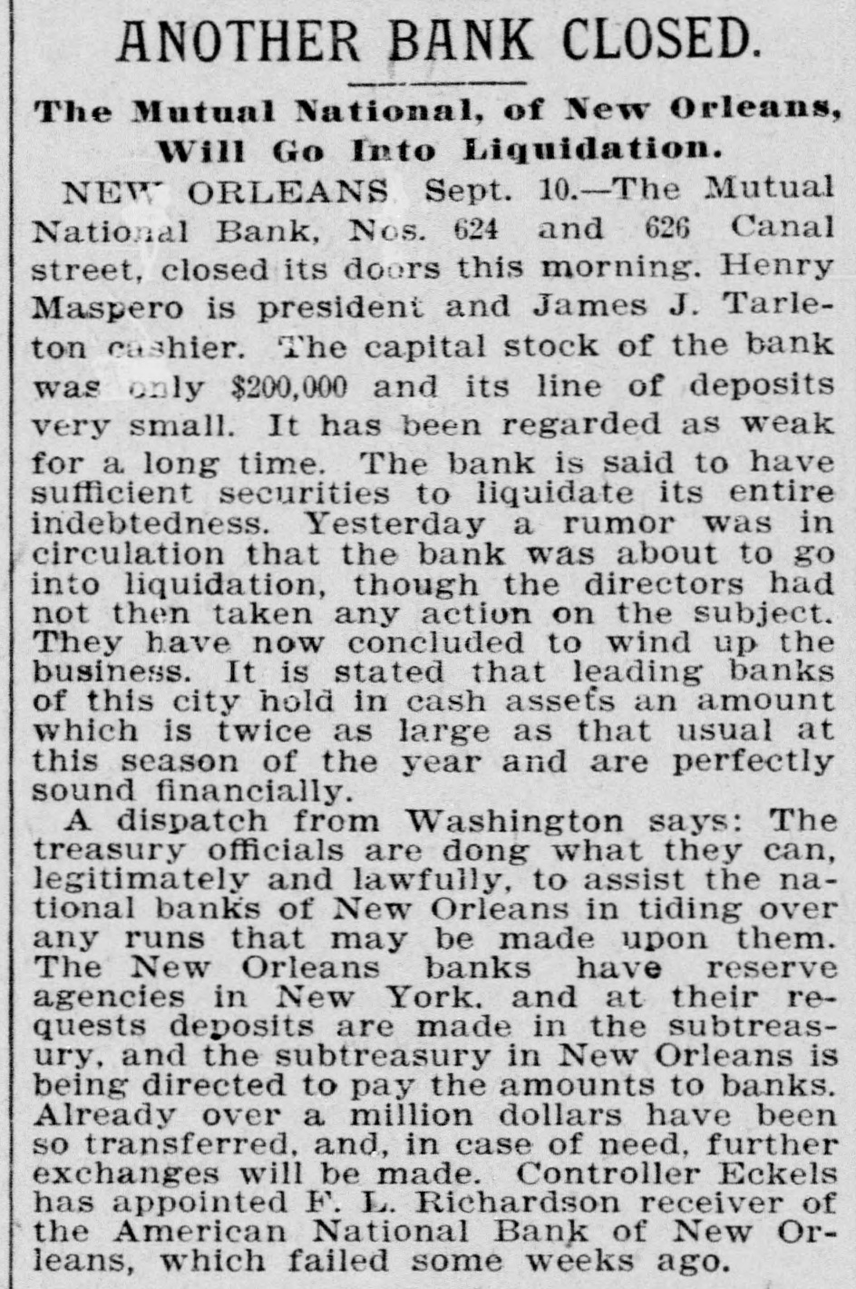 ANOTHER BANK CLOSED. The Mutual National, of New Orleans, Will Go Into Liquidation. NEW ORLEANS Sept. 10.-The Mutual National Bank, Nos. 624 and 626 Canal street, closed its doors this morning. Henry Maspero is president and James J. Tarleton cashier. The capital stock of the bank was only $200,000 and its line of deposits very small. It has been regarded as weak for a long time. The bank is said to have sufficient securities to liquidate its entire indebtedness. Yesterday a rumor was in circulation that the bank was about to go into liquidation, though the directors had not then taken any action on the subject. They have now concluded to wind up the business. It is stated that leading banks of this city hold in cash assets an amount which is twice as large as that usual at this season of the year and are perfectly sound financially. A dispatch from Washington says: The treasury officials are dong what they can, legitimately and lawfully, to assist the national banks of New Orleans in tiding over any runs that may be made upon them. The New Orleans banks have reserve agencies in New York. and at their requests deposits are made in the subtreasury, and the subtreasury in New Orleans is being directed to pay the amounts to banks. Already over a million dollars have been so transferred. and, in case of need, further exchanges will be made. Controller Eckels has appointed F. L. Richardson receiver of the American National Bank of New Orleans, which failed some weeks ago.