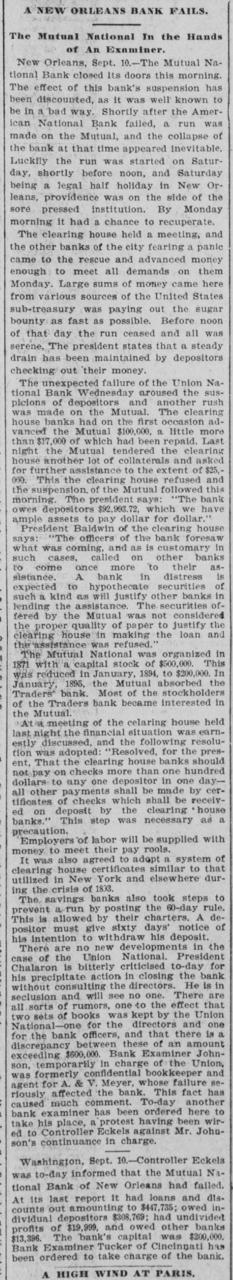 A NEW ORLEANS BANK FAILS. The Mutual National In the Hands of An Examiner. New Orleans, Sept. 10.-The Mutual National Bank closed its doors this morning. The effect of this bank's suspension has been discounted, as it was well known to be in a bad way. Shortly after the American National Bank failed, a run was made on the Mutual, and the collapse of the bank at that time appeared inevitable. Luckily the run was started on Saturday, shortly before noon, and Saturday being a legal half holiday in New Orleans, providence was on the side of the sore pressed institution. By Monday morning it had a chance to recuperate. The clearing house held a meeting, and the other banks of the city fearing a panic came to the rescue and advanced money enough to meet all demands on them Monday. Large sums of money came here from various sources of the United States sub-treasury was paying out the sugar bounty as fast as possible. Before noon of that day the run ceased and all was serene, The president states that a steady drain has been maintained by depositors checking out their money. The unexpected failure of the Union National Bank Wednesday aroused the suspicions of depositors and another rush was made on the Mutual. The clearing house banks had on the first occasion advanced the Mutual $100,000, a little more than $17,000 of which had been repaid. Last night the Mutual tendered the clearing house another lot of collaterals and asked for further assistance to the extent of $25,000. This the clearing house refused and the suspension. of the Mutual followed this morning. The president says: "The bank owes depositors $92,993.72, which we have ample assets to pay dollar for dollar." President Baldwin of the clearing house says: "The officers of the bank foresaw what was coming, and as is customary in such cases, called on other banks to come once more to their assistance. A bank in distress is expected to hypothecate securities of such a kind as will justify other banks in lending the assistance. The securities offered by the Mutual was not considered the proper quality of paper to justify the clearing house in making the loan and the assistance was refused." The Mutual National was organized in 1871 with a capital stock of $500,000. This was reduced in January, 1894, to $200,000. In January, 1895, the Mutual absorbed the Traders' bank. Most of the stockholders of the Traders bank became interested in the Mutual. At a meeting of the celaring house held last night the financial situation was earnestly discussed, and the following resolution was adopted: "Resolved, for the present, That the clearing house banks should not pay on checks more than one hundred dollars to any one depositor in one dayall other payments shall be made by certificates of checks which shall be received on deposit by the clearing house banks." This step was necessary as a precaution. Employers of labor will be supplied with money to meet their pay rools. It was also agreed to adopt a system of clearing house certificates similar to that utilized in New York and elsewhere during the crisis of 1833. The savings banks also took steps to prevent a run by posting the 60-day rule. This is allowed by their charters. A depositor must give sixty days' notice of his intention to withdraw his deposit. There are no new developments in the case of the Union National. President Chalaron is bitterly criticised to-day for his precipitate action in closing the bank without consulting the directors. He is in seclusion and will see no one. There are all sorts of rumors, one to the effect that two sets of books was kept by the Union National-one for the directors and one for the bank officers, and that there is a discrepancy between these of an amount exceeding $600,000. Bank Examiner Johnson, temporarily in charge of the Union, was formerly confidential bookkeeper and agent for A. & V. Meyer, whose failure seriously affected the bank. This fact has caused much comment. To-day another bank examiner has been ordered here to take his place, a protest having been wired to Controller Eckels against Mr. Johnson's continuance in charge. Washington, Sept. 10.-Controller Eckels was to-day informed that the Mutual National Bank of New Orleans had failed. At its last report it had loans and discounts out amounting to $447,735; owed individual depositors $308,769; had undivided profits of $19,999, and owed other banks $13,396. The bank's capital was $200,000. Bank Examiner Tucker of Cincinnati has been ordered to take charge of the bank. A HIGH WIND AT PARIS.