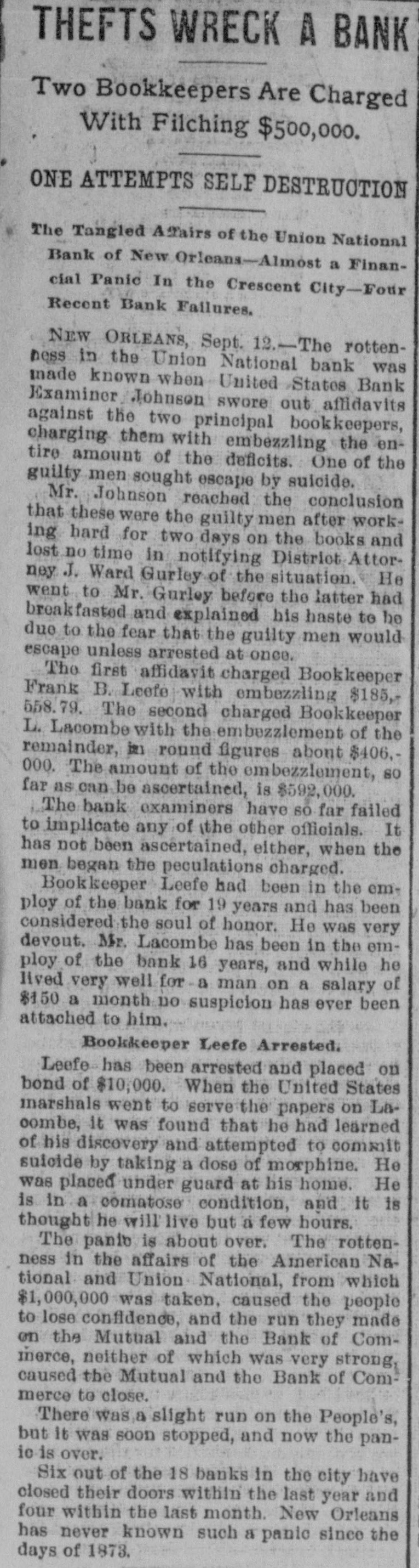 THEFTS WRECK A BANK Two Bookkeepers Are Charged With Filching $500,000. ONE ATTEMPTS SELF DESTRUCTION The Tangled Afairs of the Union National Bank of New Orleans-Almost a Financial Panic In the Crescent City-Four Recent Bank Failures. NEW ORLEANS, Sept. 12.-The rottenness in the Union National bank was made known when United States Bank Examiner Johnson swore out affidavits against the two principal bookkeepers, charging them with embezzling the entire amount of the deficits. One of the guilty men sought escape by suicide. Mr. Johnson reached the conclusion that these were the guilty men after working hard for two days on the books and lost no time in notifying District Attorney J. Ward Gurley of the situation. He went to Mr. Gurley before the latter had breakfasted and explained his haste to he due to the fear that the guilty men would escape unless arrested at once, The first affidavit charged Bookkeeper Frank B. Leefe with embezzing $185, 558.79. The second charged Bookkeeper L. Lacombe with the embezzlement of the remainder, in round figures about $406,000. The amount of the embezzlement, so far as can be ascertained, is $592,000. The bank examiners have 60 far failed to implicate any of the other officials. It has not been ascertained, either, when the men began the peculations charged. Bookkeeper Leefe had been in the employ of the bank for 19 years and has been considered the soul of honor. He was very devout. Mr. Lacombe has been in the employ of the bank 16 years, and while he lived very well for a man on a salary of $150 a month no suspicion has ever been attached to him. Bookkeeper Leefe Arrested. Leefe has been arrested and placed on bond of $10,000. When the United States marshals went to serve the papers on Laoombe, it was found that he had learned of his discovery and attempted to commit suicide by taking a dose of morphine. He was placed under guard at his home. He is in a comatose condition, and it is thought he will live but a few hours. The panic is about over. The rottenness in the affairs of the American Na. tional and Union National, from which $1,000,000 was taken, caused the people to lose confidence, and the run they made on the Mutual and the Bank of Commerce, neither of which was very strong, caused the Mutual and the Bank of Commerce to close. There was a slight run on the People's, but It was soon stopped, and now the panio is over. Six out of the 18 banks in the city have closed their doors within the last year and four within the last month. New Orleans has never known such a panic since the days of 1873.