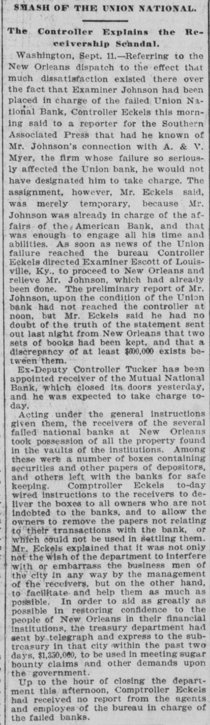 SMASH OF THE UNION NATIONAL. The Controller Explains the Receivership Scandal. Washington, Sept. 11.-Referring to the New Orleans dispatch to the effect that much dissatisfaction existed there over the fact that Examiner Johnson had been placed in charge of the failed Union National Bank, Controller Eckels this morning said to a reporter for the Southern Associated Press that had he known of Mr. Johnson's connection with A. & V. Myer, the firm whose failure so seriously affected the Union bank, he would not have designated him to take charge. The assignment, however, Mr. Eckels said, was merely temporary, because Mr. Johnson was already in charge of the affairs of the American Bank, and that was enough to engage all his time and abilities. As soon as news of the Union failure reached the bureau Controller Eckels directed Examiner Escott of Louisville, Ky., to proceed to New Orleans and relieve Mr. Johnson, which had already been done. The preliminary report of Mr. Johnson, upon the condition of the Union bank had not reached the controller at noon, but Mr. Eckels said he had no doubt of the truth of the statement sent out last night from New Orleans that two sets of books had been kept, and that a discrepancy of at least $600,000 exists between them. Ex-Deputy Controller Tucker has been appointed receiver of the Mutual National Bank, which closed its doors yesterday, and he was expected to take charge today. Acting under the general instructions given them, the receivers of the several failed national banks at New Orleans took possession of all the property found in the vaults of the institutions. Among these were a number of boxes containing securities and other papers of depositors, and others left with the banks for safe keeping. Comptroller Eckels to-day wired instructions to the receivers to deliver the boxes to all owners who are not indebted to the banks, and to allow the owners to remove the papers not relating to their transactions with the bank, or which could not be used in settling them. Mr. Eckels explained that it was not only not the wish of the department to interfere with or embarrass the business men of the city in any way by the management of the receivers, but on the other hand, to facilitate and help them as much as possible. In order to aid as greatly as possible in restoring confidence to the people of New Orleans in their financial institutions, the treasury department had sent by telegraph and express to the subtreasury in that city within the past two days, $1,350,000, to be used in meeting sugar bounty claims and other demands upon the government. Up to the hour of closing the department this afternoon, Comptroller Eckels had received no report from the agents and employes of the bureau in charge of the failed banks.