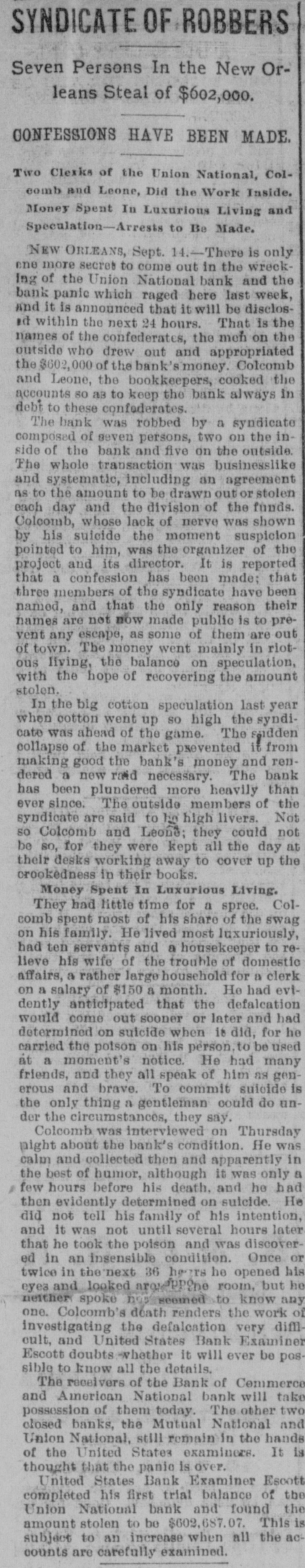 SYNDICATE OF ROBBERS Seven Persons In the New Orleans Steal of $602,000. CONFESSIONS HAVE BEEN MADE. Two Clerks of the Union National, Colcomb and Leone, Did the Work Inside. Money Spent In Luxurious Living and Speculation-Arrests to Be Made. NEW ORLEANS, Sept. 14.-There is only one more secret to come out in the wreckIng of the Union National bank and the bank panic which raged here last week, and it is announced that it will be disclosed within the next 24 hours. That is the names of the confederates, the men on the outside who drew out and appropriated the $602,000 of the bank's money. Colcomb and Leone, the bookkeepers, cooked the accounts so as to keep the bank always in debt to these confederates. The bank was robbed by a syndicate composed of seven persons, two on the inside of the bank and five on the outside. The whole transaction was businesslike and systematic, including an agreement as to the amount to be drawn out or stolen each day and the division of the funds. Colcomb, whose lack of nerve was shown by his suicide the moment suspicion pointed to him, was the organizer of the project and its director. It is reported that a confession has been made: that three members of the syndicate have been named, and that the only reason their names are not now made public is to prevent any escape, as some of them are out of town. The money went mainly in riotous living, the balance on speculation, with the hope of recovering the amount stolen. In the big cotton speculation last year when cotton went up so high the syndicate was ahead of the game. The sadden collapse of the market prevented it from making good the bank's money and rendered a new raid necessary. The bank has been plundered more heavily than ever since. The outside members of the syndicate are said to lie high livers. Not so Colcomb and Leone; they could not be so, for they were kept all the day at their desks working away to cover up the crookedness in their books. Money Spent In Luxurious Living. They had little time for a spree. Colcomb spent most of his share of the swag on his family. He lived most luxuriously, had ten servants and a housekeeper to relieve his wife of the trouble of domestic affairs, a rather large household for a clerk on a salary of $150 a month. He had evidently anticipated that the defalcation would come out sooner or later and had determined on suicide when 18 did, for he carried the poison on his person. to be used at a moment's notice. He had many friends, and they all speak of him as generous and brave. To commit suicide is the only thing a gentleman could do under the circumstances, they say. Colcomb was interviewed on Thursday night about the bank's condition. He was calm and collected then and apparently in the best of humor, although it was only a few hours before his death. and he had then evidently determined on suicide. He did not tell his family of his intention, and it was not until several hours later that he took the poison and was discovered in an insensible condition. Once or twice in the next 36 he rrs he opened his eyes and looked argePPine room, but he neither spoke nos seemed to know any one. Colcomb's death renders the work of investigating the defalcation very difflcult, and United States Bank Examiner Escott doubts whether it will ever be pos. sible to know all the details. The receivers of the Bank of Commerce and American National bank will take possession of them today. The other two closed banks, the Mutual National and Union National, still remain in the hands of the United States examiners. It is thought that the panic is over. United States Bank Examiner Escott completed his first trial balance of the Union National bank and found the amount stolen to be $602,687.07. This is subject to an increase when all the accounts are carefully examined.