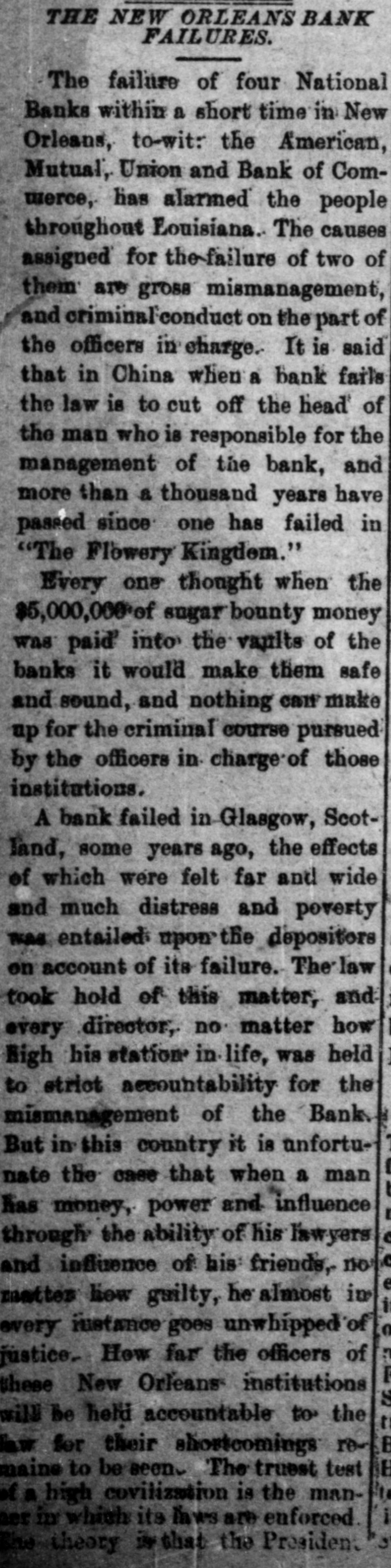 THE NEW ORLEANS BANK FAILURES. The failure of four National Banks within a short time in New Orleans, to-wit: the American, Mutual, Union and Bank of Comшегсе, has alarmed the people throughout Eouisiana. The causes assigned for the-failure of two of them are gross mismanagement, and criminal conduct on the part of the officers in charge.. It is said that in China when a bank fails the law is to cut off the head of the man who is responsible for the management of the bank, and more than a thousand years have passed since one has failed in "The Flowery Kingdom." Every one thought when the $5,000,000 of sugar bounty money was paid into the vaults of the banks it would make them safe and sound, and nothing can make up for the criminal course pursued by the officers in charge of those institutions. A bank failed in Glasgow, Scotland, some years ago, the effects of which were felt far and wide and much distress and poverty was entailed upon the depositors on account of its failure. The law took hold of this matter, and every director, no matter how High his station in life, was held to strict accountability for the mismanagement of the Bank. But in this country it is unfortunate the case that when a man has money, power and influence through the ability of his law yers and influence of his friends,- no matter how guilty, he almost in every instance goes unwhipped of justice- How far the officers of these New Orleans institutions will be held accountable to the law for their shortcomings remaine to be seen- The truest test of a high covilization is the manthem enfureed