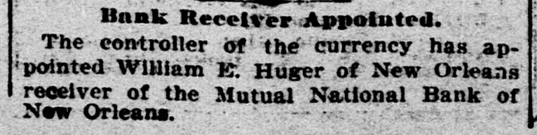 Bank Receiver Appointed. The controller of the currency has appointed William E. Huger of New Orleans receiver of the Mutual National Bank of New Orleans.