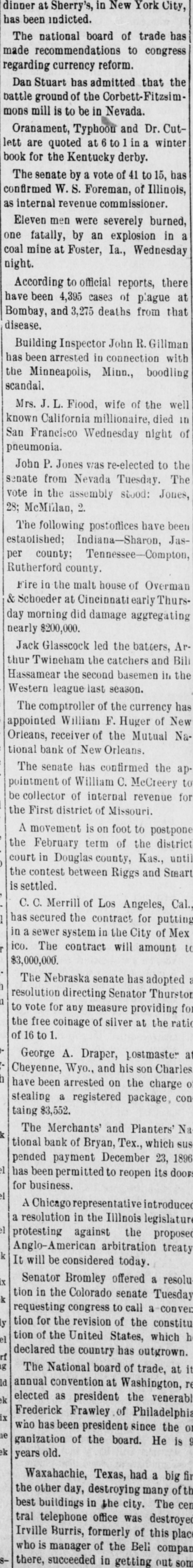 Dan Stuart has admitted that the attle ground of the Corbett-Fitzsimnons mill is to be in Nevada. Oranament, Typhoon and Dr. Cutett are quoted at 6 to 1 in a winter ook for the Kentucky derby. The senate by a vote of 41 to 15, has confirmed W.S. Foreman, of Illinois, internal revenue commissioner. Eleven men were severely burned, fatally, by an explosion in a coal mine at Foster, Ia., Wednesday night. According to official reports, there have been 4,395 cases of plague at Bombay, and 3,275 deaths from that disease. Building Inspector John R. Gillman has been arrested in connection with the Minneapolis, Minn., boodling scandal. Mrs. J. L. Flood, wife of the well known California millionaire, died in San Francisco Wednesday night of pneumonia. John P. Jones was re-elected to the senate from Nevada Tuesday. The vote in the assembly stood: Jones, 28; McMillan, 2. The following postoffices have been established; Indiana-Sharon, Jasper county; Tennessee-Compton, Rutherford county. Fire in the malt house of Overman & Schoeder at Cincinnati early Thursday morning did damage aggregating nearly $200,000. Jack Glasscock led the batters, Arthur Twineham the catchers and Bill Hassamear the second basemen in the Western league last season. The comptroller of the currency has appointed William F. Huger of New Orleans, receiver of the Mutual National bank of New Orleans. The senate has confirmed the ap pointment of William C. McCreery to be collector of internal revenue for the First district of Missouri. A movement is on foot to postpone the February term of the district court in Douglas county, Kas., until the contest between Riggs and Smart is settled. C. C. Merrill of Los Angeles, Cal. has secured the contract for putting in a sewer system in the City of Mex ico. The contract will amount to $3,000,000. The Nebraska senate has adopted : resolution directing Senator Thursto to vote for any measure providing fo the free coinage of silver at the rati of 16 to 1.