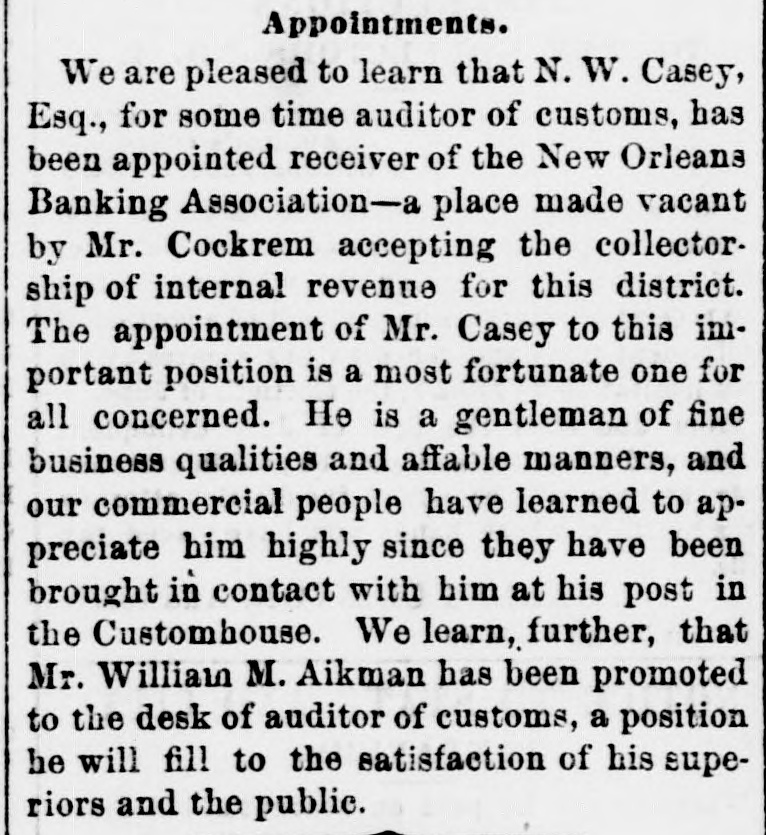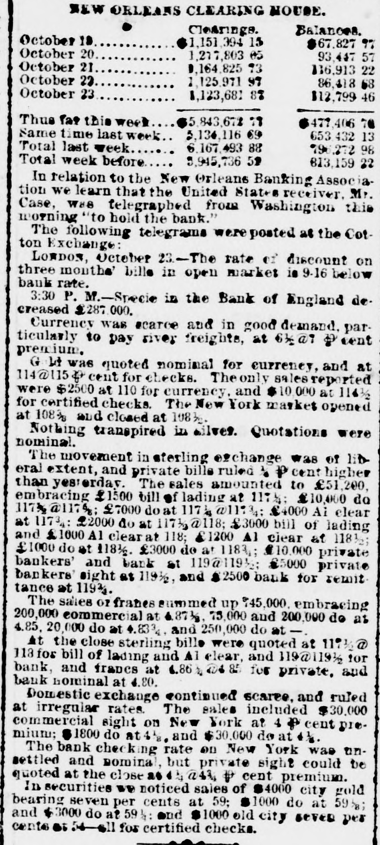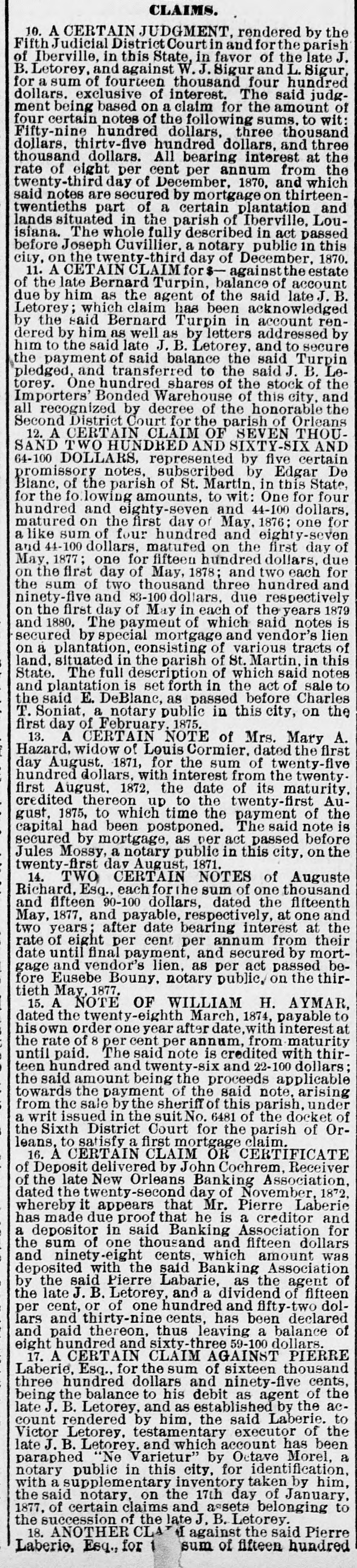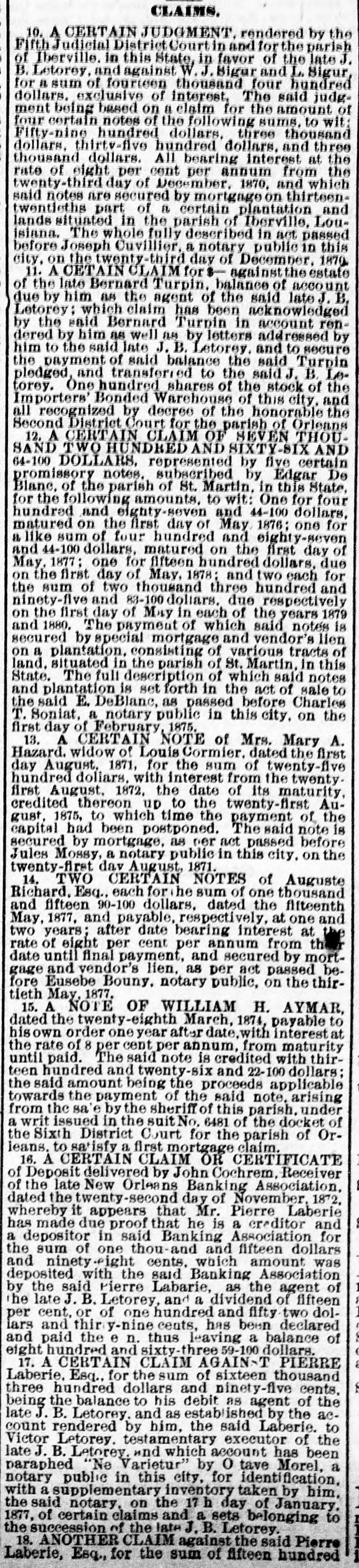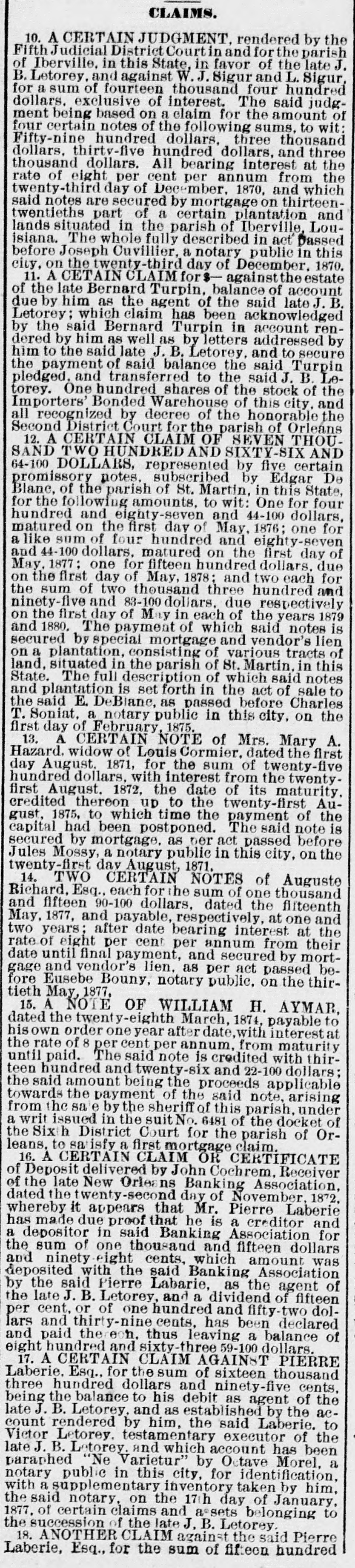 CLAIMS. CERTAIN JUDGMENT, rendered the parish by the 10. A Judicial District Court in and for of the late J. of Fifth Iberville, and in this against State, W. in J. Sigur favor and L. hundred Sigur, for B. Letorey, a sum of fourteen interest. thousand The four said judgdollars. exclusive based on of a claim for the amount wit: of ment being notes of the following sums. thousand to four certain hundred dollars, three and three Fifty-nine thirtv-flv hundred dollars, at the dollars, dollars. All bearing interest from the thousand eight per cent per annum and which rate of day of December, 1870, thirteensaid twenty-third notes are secured by mortgage plantation on and twentieths part in of the a parish certain of Iberville, Loulands situated The whole fully described in act passed in this isiana. Cuvillier, a notary public 1870. before Joseph the twenty-t day of December, estate city, on CETAIN CLAIM for $ against account 11. A Bernard Turpin, balance of late J. B. of the late the agent of the said due by him which as claim has been acknowledged account renLetorey; the said Bernard Turpin in addressed by by dered by him said as late well J. as B. by Letorey. letters and to Turpin secure the him payment to the and of transferred said balance to the the said said J. B. of Le- the pledged, One hundred shares of the this stock city, and Importers' torey. Bonded by decree Warehouse of the of honorable Orleans the all recognized District Court for the parish of THOUSecond CERTAIN CLAIM OF SEVEN AND 12. A TWO HUNDRED AND SIXTY-SIX five certain SAND DOLLARS, represented by Edgar De 64-100 notes, subscribed by this State, promissory the parish of St. Martin. in for four Blanc, of fo lowing amounts, to wit: One dollars, for the and eighty-seven and 44-100 one for hundred the first day of May. 1876; matured sum on of four hundred and eighty-seven first day of a like dollars, matured on the due and 41-100 one for fifteen hundred dollars, each for May. 1877; day of May, 1878; and hundred two and on the first two thousand three the sum of and 83-100 dollars. due the respectively years 1879 ninety-five first day of May in each of said notes is on the The payment of which vendor's lien secured and 1880. by special mortgage and various tracts of plantation, consisting of in this on a situated in the parish of St. Martin, said notes land, The full description of which of sale to State. plantation is set forth in the before act Charles and E. DeBlanc, as passed the the T. Soniat, said a notary public in this city, on first day of CERTAIN February, NOTE 1875. of Mrs. Mary first A. 13. A widow of Louis Cormier. dated the Hazard, August. 1871, for the sum of twenty-five twenty day dollars, with interest from the hundred 1872, the date of its maturity. Aufirst August. thereon up to the twenty-first of the credited to which time the payment said note is capital gust, 1875, had been postponed. act The passed before secured Jules Mossy, by mortgage, a notary public as per in this city, on the twenty- first day CERTAIN NOTES of Auguste 14. each for the sum of one fliteenth TWO Esq., August, 1871. thousand Richard, 90-100 dollars, dated the and and fifteen and payable, respectively, at one at the May, 1877, after date bearing interest from their two years; eight per cent per annum by mortrate of until final payment, and secured passed bedate vendor's lien, as per act the thirtieth gage fore Eusebe and Bouny, notary public, on OF WILLIAM H. to 15. A March, 1874, at dated May, the NOTE twenty-eighth 1877. after date, with payable interest AYMAR, hisown order of 8 per one cent year per annum, from with maturity thirthe rate The said note is credited dollars; until hundred paid. and twenty-six and 22-100 applicable teen amount being the proceeds arising the said the payment of the said note, under towards sale by the sheriff of this parish, docket of from issued in the suit No. 6481 of the of Ora writ District Court for the parish Sixth the claim, the to satisfy a first mortgage CERTIFICATE leans, CERTAIN CLAIM OR Receiver 16. A delivered by John Cochrem, Association, of Deposit late New Orleans Banking 1872, of the the twenty-second day of November, Laberie dated it appears that Mr. Pierre creditor and whereby due proof that he is a for has made in said Banking Association dollars a depositor of one thousand and fifteen was the sum eight cents, which amount Association and ninety with the said Banking agent of deposited said Pierre Labarie, as the fifteen by the J. B. Letorey, and a dividend of dolthe late of one hundred and fifty-two declared per cent, or thirty-nine cents, has been balance of lars and thereon, thus leaving a dollars. and paid and sixty-three 59-100 eight hundred CERTAIN CLAIM AGAINST thousand PIERRE Laberie, 17. A hundred Esq., for dollars the sum and of sixteen ninety-five of cents, the three the balance to his debit as agent by the acbeing Letorey. and as established Laberie. to late J. B. rendered by him, the said of the count testamentary executor has been late Victor J.B. Letorey, Letorey. and which by account Oetave Morel, a paraphed 'No Varietur" this city, for identification, notary supplementary public in inventory taken of January, by him, with a on the 17th day to the said claims and assets of the late J. B. 1877, the succession of certain notary, Letorey. belonging said Pierre ANOTHER CLA against the hundred Laberie, 18. Esq., for 1 sum of fifteen