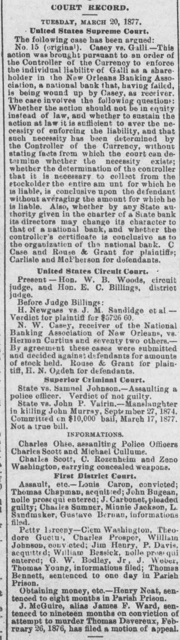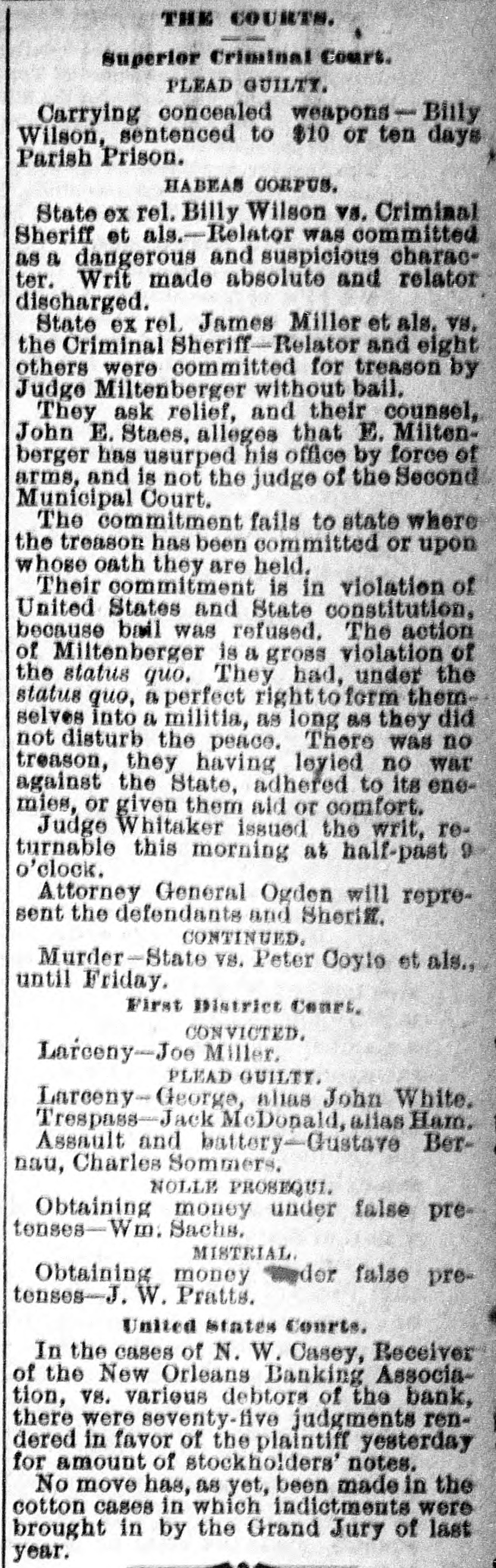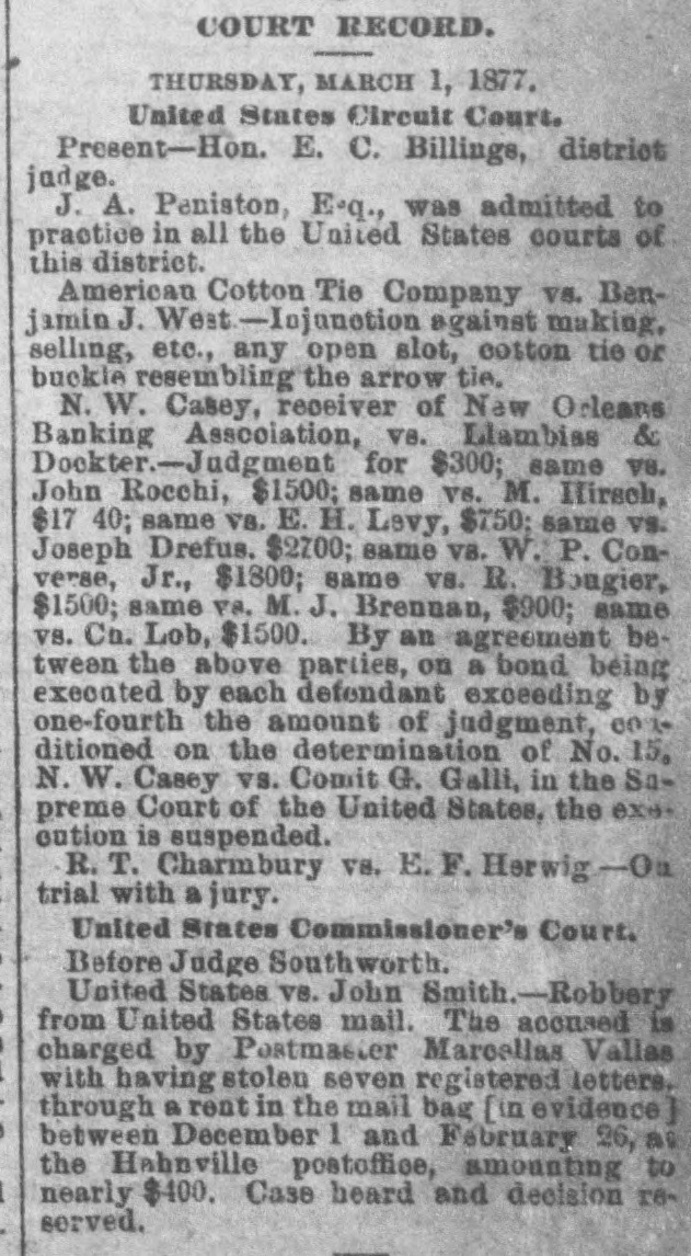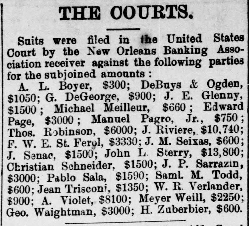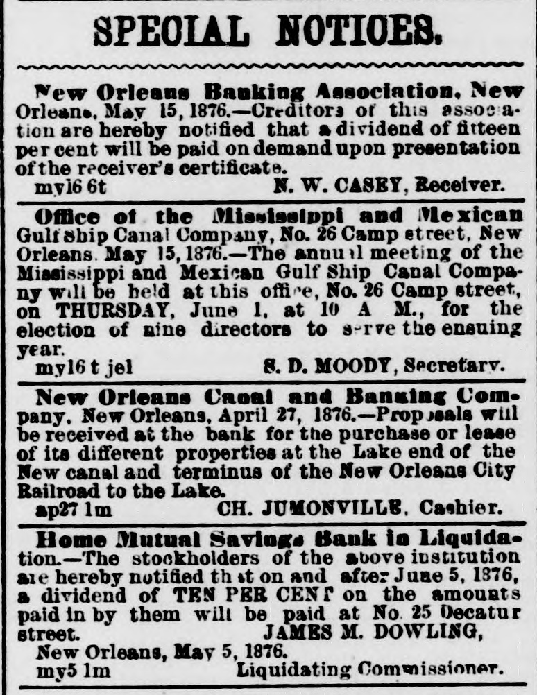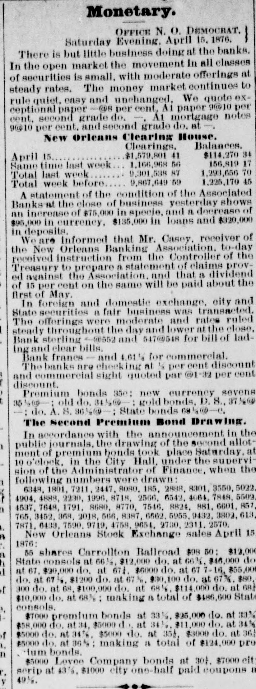 Monetary. OFFICE N. O. DEMOCRAT. Saturday Evening, April 15. 1876. There is but little business doing at the banks. In the open market the movement In all classes of securities is small, with moderate offerings at steady rates. The money market continues to rule quiet, easy and unchanged, We quote exceptional paper @8 per cent, A1 paper 9@10 por cent. second grade do. At mortgage notes 9@10 per cent. and second grade do. at New Orleans Clearing House. Balances. Clearings. $114,270 34 $1,579,801 41 April 15 156,819 17 1,166,968 56 Same time last week 1,293,656 70 9,301,538 87 Total last week 1,225,170 45 9,867,649 59 Total week before A statement of the condition of the Associated Banks at the close of business yesterday shows an increase of $75,000 in specie, and a decrease of $95,000 in currency, $135,000 in loans and $320,000 in deposits, We are informed that Mr. Casey. receiver of the New Orleans Banking Association. to-day received instruction from the Controller of the Treasury to prepare a statement of claims proved against the Association, and that a dividend of 15 per cent on the same will be paid about the first of May. In foreign and domestic exchange, city and State securities a fair business was transacted. The offerings were moderate and rates ruled steady throughout the day and lower at the close, Bank sterling -@552 and 547@548 for bill of ladingand clear bills. Bank franes - and 4.61 4 for commercial. The banks are cheeking at in per cent discount and commercial sight quoted par @1-32 per cent discount. Premium bonds 35c: new currency sevens old do. 34% gold bonds, D. 8., 37% -: do. A. S. 36 1 @ : State bonds The Second Premium Bond Drawing. In accordance with the announcement in the 1 public journals, the drawing of the second allot ment of premium bonds took place Saturday. at 10 o'clock, in the City Hall, under the supervi sion of the Administrator of Finance. when the I following numbers were drawn: , 6348, 1801, 7211, 2447, 8080, 185, 2888, 8301, 3550, 5022 f 4904, 4888, 2230, 1996, 8718, 2566, 6542, 4064, 7848. 5503 n 4537, 7648, 1791, 8680, 8770, 7546, 8824. 881, 6601, 851 765, 3452, 368, 2018, 566, 8387, 6662. 5955. 9432, 3802. 613 . 7871, 6433, 7590. 9719, 4758, 9654. 9730, 2311. 2570. n New Orleans Stock Exchange sales April 15 1876: : n 55 shares Carrollton Ballroad $98 50: $12,000 h State consols at 66 % $12,000 do. at 60 1/4, $16,000 do I at 67, $20,000 do. at 671. $6000 do. at 67 7-16, $55,000 do. at 67 % $1200 do. at 67% $30,100 do. at 67% $80. f 300 do. at 68, $100,000 do. at 68% $114,000 do. at 68 $10,000 do. at 68% making a total of $486,600 State consols. 1. $7000 premium bonds at 33 %, $25,000 do. at 33% $58,000 do. at 34, $5000 de at 34 1/2. $11,000 do. at 34% f $5000 do. at 34% $5000 do. at 351, $3000 do. at 36 1, #5000 do. at 36% making a total of $124,000 pro Hum bonds. n $5000 Levee Company bonds at 301. $7000 cit r. scrip at 43% $1000 city one-half paid coupons a 49% y