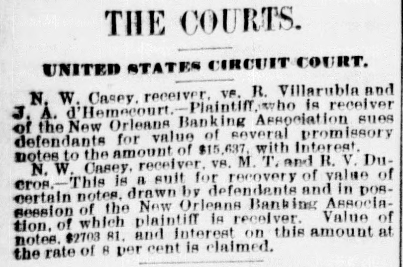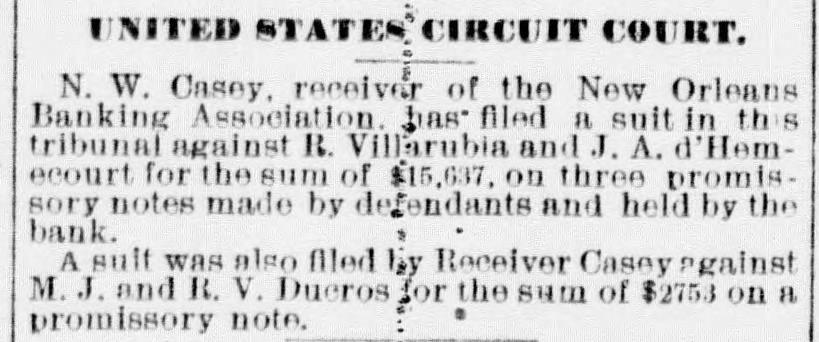 N. W. Casey, receiver of the New Orleans Banking Association, has filed a suit in this tribunal against R. Villarubia and J. A. d'Heme-court for the sum of $15,637, on three promissory notes made by defendants and held by the bank.