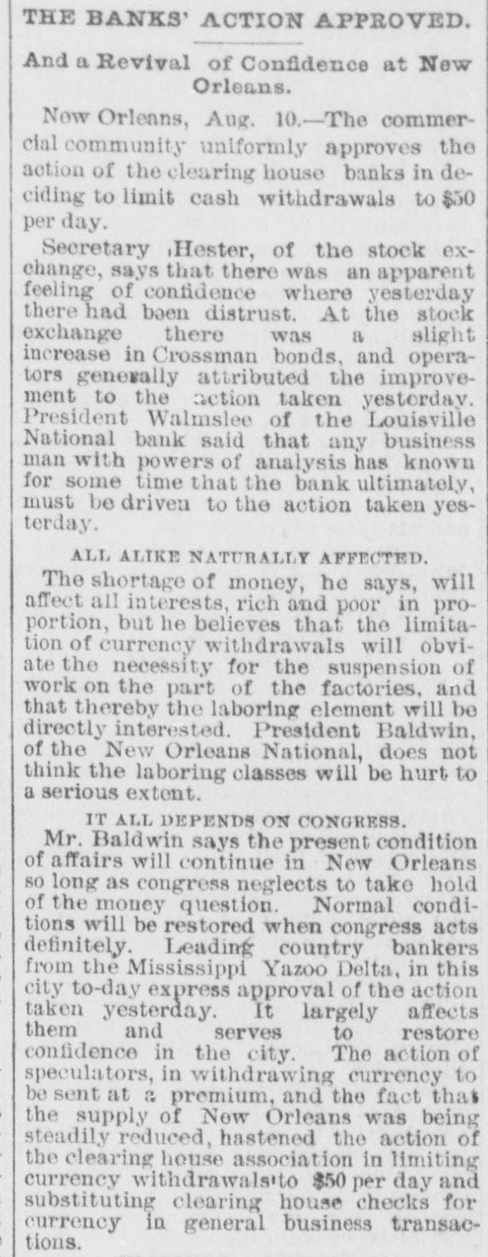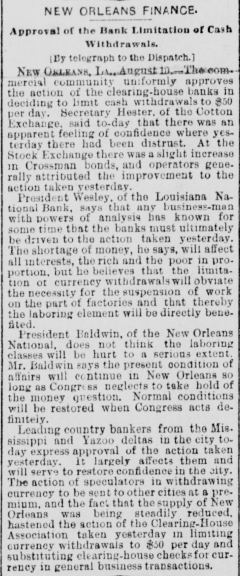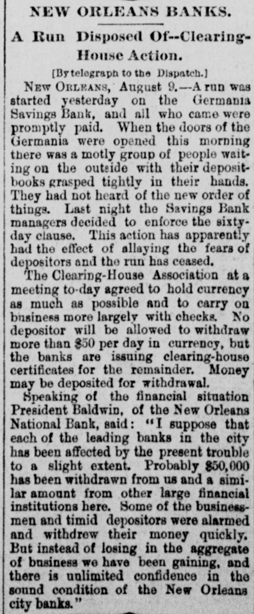 NEW ORLEANS BANKS. A Run Disposed Of--ClearingHouse Action. [Bytelegraph to the Dispatch.] NEW ORLEANS, August 9.-A run was started yesterday on the Germania Savings Bank, and all who came were promptly paid. When the doors of the Germania were opened this morning there was a motly group of people waiting on the outside with their depositbooks grasped tightly in their hands. They had not heard of the new order of things. Last night the Savings Bank managers decided to enforce the sixtyday clause. This action has apparently had the effect of allaying the fears of depositors and the run has ceased. The Clearing-House Association at a meeting to-day agreed to hold currency as much as possible and to carry on business more largely with checks. No depositor will be allowed to withdraw more than $50 per day in currency, but the banks are issuing clearing-house certificates for the remainder. Money may be deposited for withdrawal. Speaking of the financial situation President Baldwin, of the New Orleans National Bank, said: "I suppose that each of the leading banks in the city has been affected by the present trouble to a slight extent. Probably $50,000 has been withdrawn from us and a similar amount from other large financial institutions here. Some of the businessmen and timid depositors were alarmed and withdrew their money quickly. But instead of losing in the aggregate of business we have been gaining, and there is unlimited confidence in the sound condition of the New Orleans city banks."
