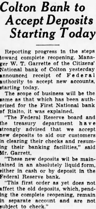 Colton to Accept Deposits Starting Today Reporting progress in the steps toward complete ManaGarrette the Citizens' National bank of Colton yesterday announced receipt of authority accept new accounts, starting today. The scope business will be the same that which been authorized for the First National bank of Rialto, explained. Federal Reserve board and the treasury department strongly advised that accept deposits aid our customers clearing their checks and resumtheir banking facilities," said Garrett. "These new deposits will be maintained in an absolutely liquid either cash by deposit in the Federal Reserve bank. first order does not affect the old deposits, which, ing the remain and are not subject to check.'