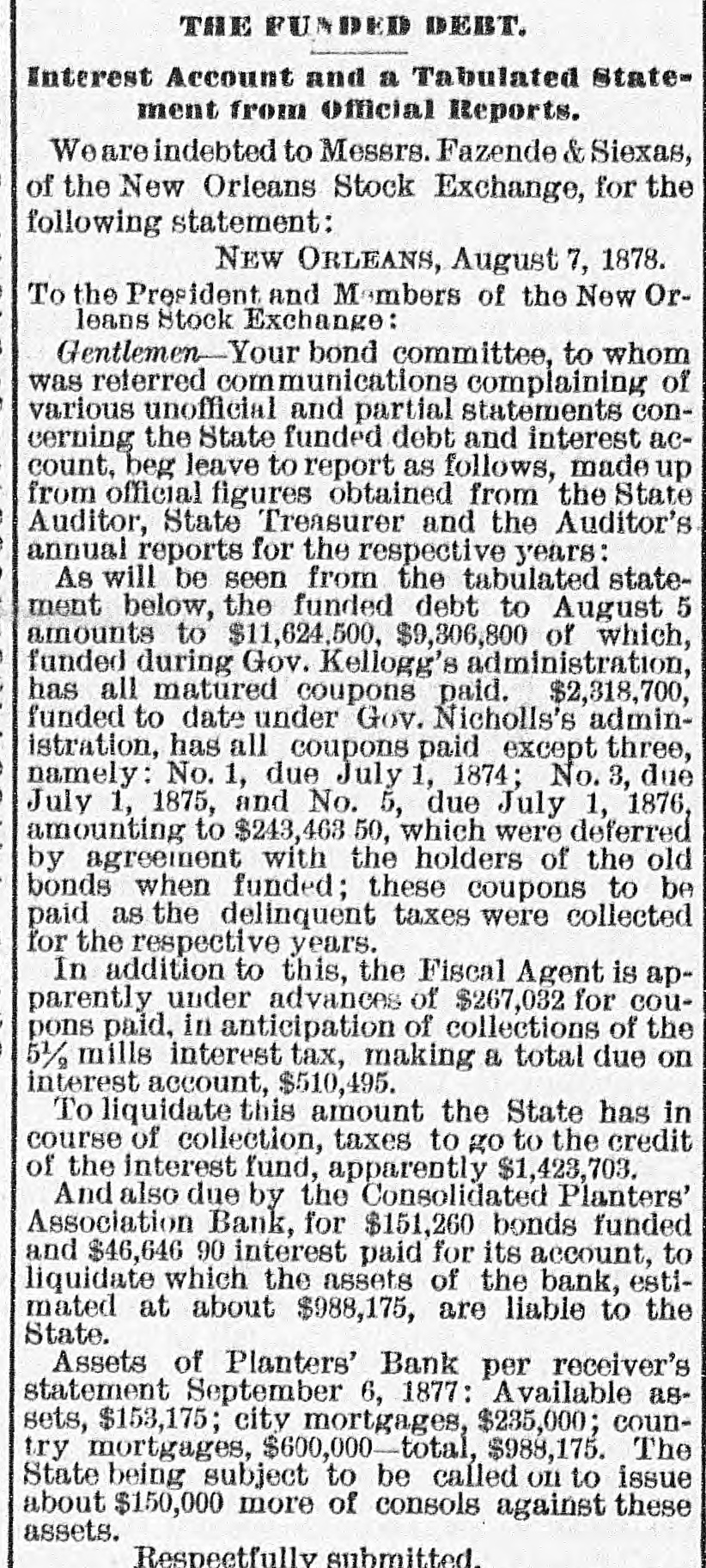 THE FUNDED DEBT. Interest Account and a Tabulated Statement from Official Reports. Weare indebted to Messrs. Fazende & Siexas, of the New Orleans Stock Exchange, for the following statement: NEW ORLEANS, August 7, 1878. To the President and Members of the New Orleans Stock Exchange: Gentlemen-Your bond committee, to whom was reterred communications complaining of various unofficial and partial statements concerning the State funded debt and interest account, beg leave to report as follows, made up from official figures obtained from the State Auditor, State Treasurer and the Auditor's annual reports for the respective years: As will be seen from the tabulated statement below, the funded debt to August 5 amounts to $11,624,500, $9,306,800 of which, funded during Gov. Kellogg's administration, has all matured coupons paid. $2,318,700, funded to date under Gov. Nicholls's administration, has all coupons paid except three, namely: No. 1, due July 1, 1874; No. 3, due July 1, 1875, and No. 5, due July 1, 1876, amounting to $243,463 50, which were deferred by agreement with the holders of the old bonds when funded; these coupons to be paid as the delinquent taxes were collected for the respective years. In addition to this, the Fiscal Agent is apparently under advances of $267,032 for coupons paid, in anticipation of collections of the 5½ mills interest tax, making a total due on interest account, $510,495. To liquidate this amount the State has in course of collection, taxes to go to the credit of the interest fund, apparently $1,423,703. And also due by the Consolidated Planters' Association Bank, for $151,260 bonds funded and $46,646 90 interest paid for its account, to liquidate which the assets of the bank, estimated at about $988,175, are liable to the State. Assets of Planters' Bank per receiver's statement September 6, 1877: Available assets, $153,175; city mortgages, $235,000; country mortgages, $600,000-total, $988,175. The State being subject to be called on to issue about $150,000 more of consols against these assets. Respectfully submitted.