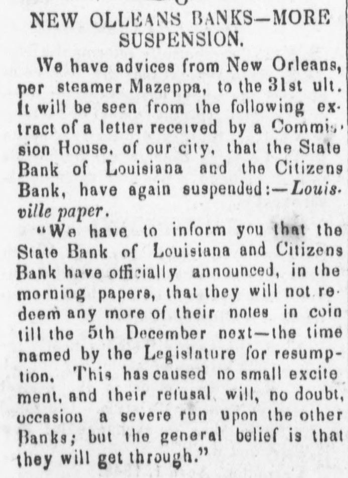 NEW OLLEANS BANKS-MORE SUSPENSION. We have advices from New Orleans, per steamer Mazeppa, to the 31st ult. It will be seen from the following ex. tract of a letter received by a Commis sion House. of our city, that the State Bank of Louisiana and the Citizens Bank, have again suspended:- Louis. ville paper. "We have to inform you that the State Bank of Louisiana and Citizens Bank have officially announced, in the morning papers, that they will not re. deem any more of their notes in coin till the 5th December next-the time named by the Legislature for resumption. This has caused no small excite ment. and their refusal will, no doubt, occasion a severe run upon the other Banks; but the general belief is that they will get through."