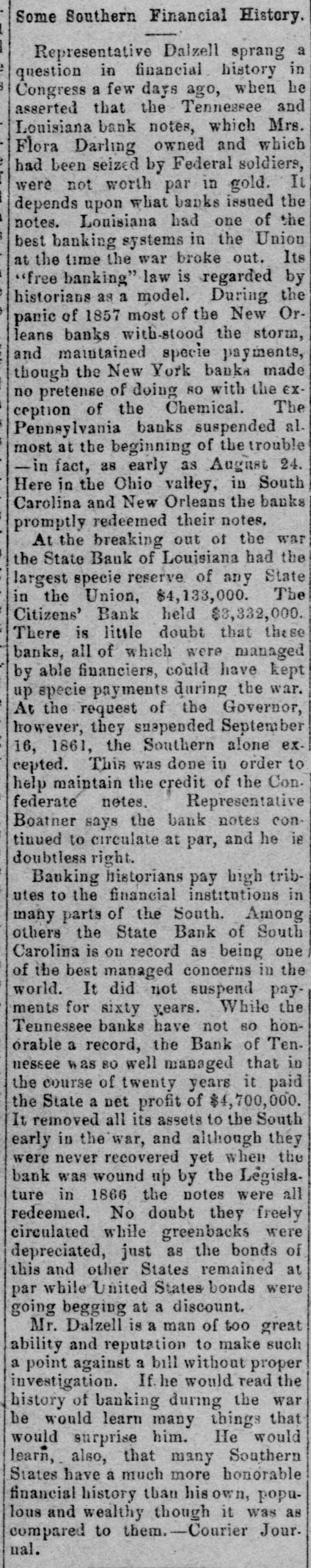 Some Southern Financial History. Representative Dalzell sprang a question in financial history in Congress a few days ago, when he asserted that the Tennessee and Louisiana bank notes, which Mrs. Flora Darling owned and which had been seized by Federal soldiers, were not worth par in gold. It depends upon what banks issued the notes. Louisiana had one of the best banking systems in the Union at the time the war broke out. Its "free banking" law is regarded by historians as a model. During the panic of 1857 most of the New Orleans banks with-stood the storm, and maintained specie payments, though the New York banks made no pretense of doing 80 with the EXception of the Chemical. The Pennsylvania banks suspended al. most at the beginning of the trouble -in fact, as early as August 24. Here in the Ohio valley, in South Carolina and New Orleans the banks promptly redeemed their notes. At the breaking out of the war the State Bank of Louisiana had the largest specie reserve of any State in the Union, $4,133,000. The Citizens' Bank held $3,332,000. There is little doubt that these banks, all of which were managed by able financiers, could have kept up specie payments during the war. At the request of the Governor, however, they suspended September 16, 1861, the Southern alone excepted. This was done in order to help maintain the credit of the Con. federate notes. Representative Boatner says the bank notes continued to circulate at par, and he is doubtless right. Banking historians pay high tributes to the financial institutions in many parts of the South. Among others the State Bank of South Carolina is on record as being one of the best managed concerns in the world. It did not suspend payments for sixty years. While the Tennessee banks have not 60 honorable a record, the Bank of Tennessee was 80 well managed that in the course of twenty years it paid the State a net profit of $4,700,000. It removed all its assets to the South early in the war, and although they were never recovered yet when the bank was wound up by the Legislature in 1866 the notes were all redeemed. No doubt they freely circulated while greenbacks were depreciated, just as the bonds of this and other States remained at par while United States bonds were going begging at a discount. Mr. Dalzell is a man of too great ability and reputation to make such a point against a bill without proper investigation. If he would read the history of banking during the war be would learn many things that would surprise him. He would learn, also, that many Southern States have a much more honorable financial history than his own, populous and wealthy though it was as compared to them.-Courier Jour. nal.