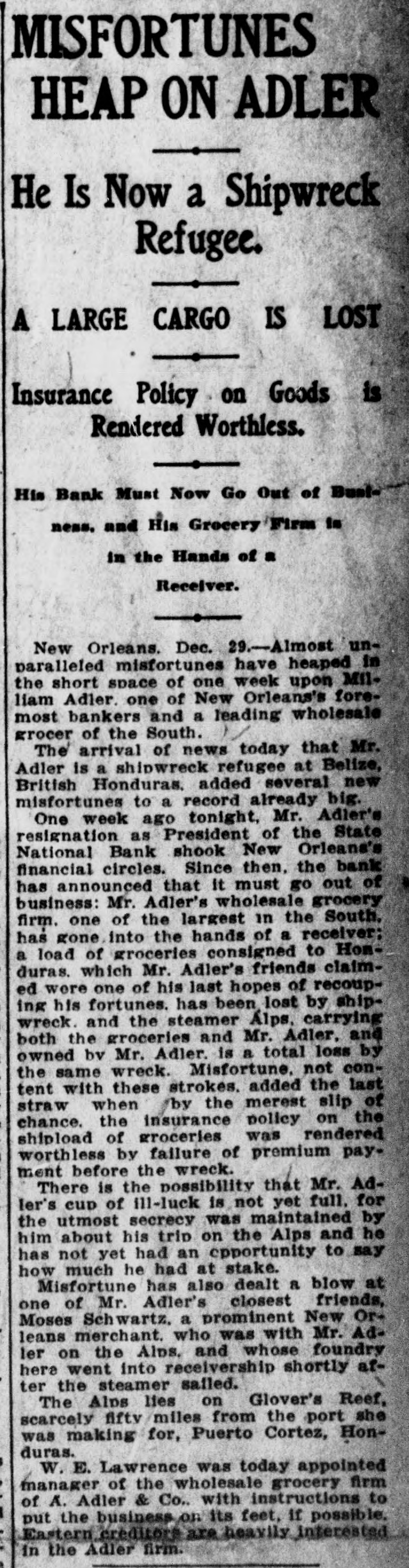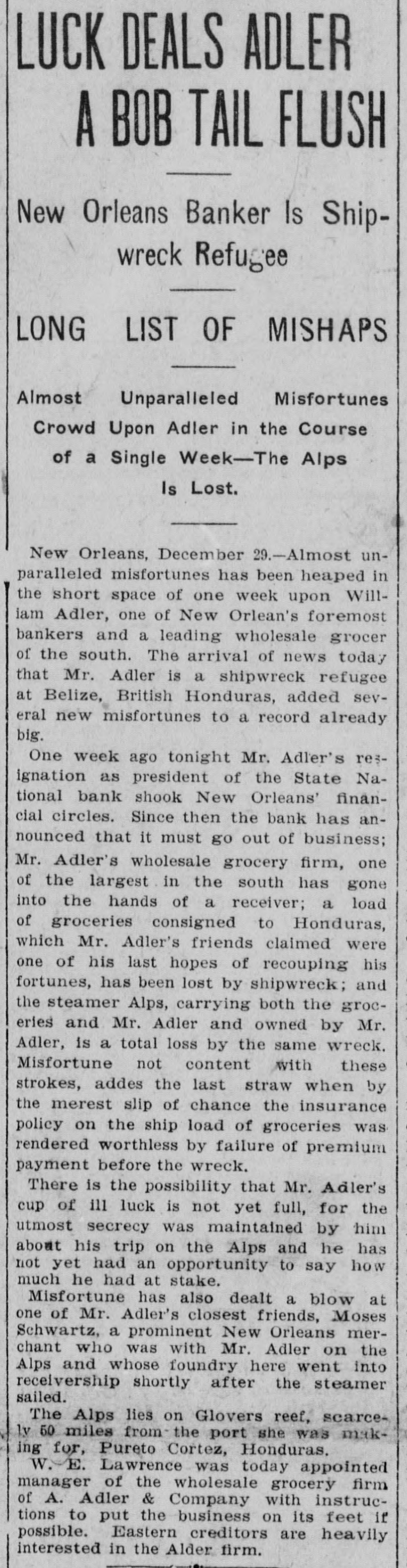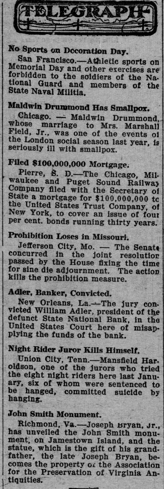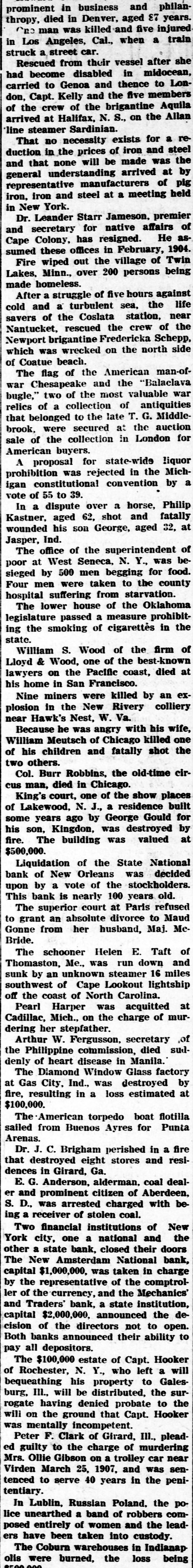 prominent in business and philan thropy, died in Denver, aged 87 years. one man was killed and five injured in Los Angeles, Cal., when a train struck a, street car. Rescued from their vessel after she had become disabled in midocean, carried to Genoa and thence to London, Capt. Kelly and the five members of the crew of the brigantine Aquila arrived at Halifax, N. S., on the Allan line steamer Sardinian. That no necessity exists for a reduction in the prices of iron and steel and that none will be made was the general understanding arrived at by representative manufacturers of pig iron, iron and steel at a meeting held in New York. Dr. Leander Starr Jameson, premier and secretary for native affairs of Cape Colony, has resigned. He assumed these offices in February, 1904. Fire wiped out the village of Twin Lakes. Minn., over 200 persons being made homeless. After a struggle of five hours against cold and a turbulent sea, the life savers of the Coslata station, near Nantucket, rescued the crew of the Newport brigantine Fredericka Schepp, which was wrecked on the north side of Coatue beach. The flag of the American man-ofwar Chesapeake and the "Balaclava bugle," two of the most valuable war relics of a collection of antiquities that belonged to the late T. G. Middlebrook, were secured at the auction sale of the collection in London for American buyers. A proposal for state-wide liquor prohibition was rejected in the Michigan constitutional convention by a vote of 55 to 39. In a dispute over a horse, Philip Kastner. aged 62, shot and fatally wounded his son George, aged 32, at Jasper, Ind. The office of the superintendent of poor at West Seneca, N. Y., was besieged by 500 men begging for food. Four men were taken to the county hospital suffering from starvation. The lower house of the Oklahoma legislature passed a measure prohibiting the smoking of cigarettes in the state. William S. Wood of the firm of Lloyd & Wood, one of the best-known lawyers on the Pacific coast, died at his home in San Francisco. Nine miners were killed by an explosion in the New Rivery colliery near Hawk's Nest, W. Va. Because he was angry with his wife, William Meutsch of Chicago killed one of his children and fatally shot the two others. Col. Burr Robbins, the old-time circus man, died in Chicago. King's court, one of the show places of Lakewood, N. J., a residence built some years ago by George Gould for his son, Kingdon, was destroyed by fire. The building was valued at $500,000. Liquidation of the State National bank of New Orleans was decided upon by a vote of the stockholders. This bank is nearly 100 years old. The superior court at Paris refused to grant an absolute divorce to Maud Gonne from her husband, Maj. McBride. The schooner Helen E. Taft of Thomaston, Me., was run down and sunk by an unknown steamer 16 miles southwest of Cape Lookout lightship off the coast of North Carolina. Pearl Harper was acquitted at Cadillac, Mich., on the charge of murdering her stepfather. Arthur W. Fergusson, secretary of the Philippine commission, died suddenly of heart disease in Manila. The Diamond Window Glass factory at Gas City, Ind., was destroyed by fire, resulting in a loss estimated at $100,000. The American torpedo boat flotilla sailed from Buenos Ayres for Punta Arenas. Dr. J. C. Brigham perished in a fire that destroyed eight stores and residences in Girard, Ga. E. G. Anderson, alderman. coal dealer and prominent citizen of Aberdeen, S. D., was arrested charged with being a receiver of stolen coal. Two financial institutions of New York city, one a national and the other a state bank, closed their doors The New Amsterdam National bank, capital $1,000,000, was taken in charge by the representative of the comptroller of the currency, and the Mechanics' and Traders' bank, a state institution, capital $2,000,000, announced the decision of the directors not to open. Both banks announced their ability to pay all depositors. The $100,000 estate of Capt. Hooker of Rochester, N. Y., who left a will bequeathing his property to Galesburg, III., will be distributed, the surrogate having denied probate to the will on the ground that Capt. Hooker was mentally incompetent. Peter F. Clark of Girard, III., pleaded guilty to the charge of murdering Mrs. Ollie Gibson on a trolley car near Virden March 25, 1907, and was sentenced to serve 40 years in the penitentiary. In Lublin, Russian Poland, the police unearthed a band of robbers composed entirely of women and the leaders have been taken into custody. The Coburn warehouses in Indianap olis were burned, the loss being