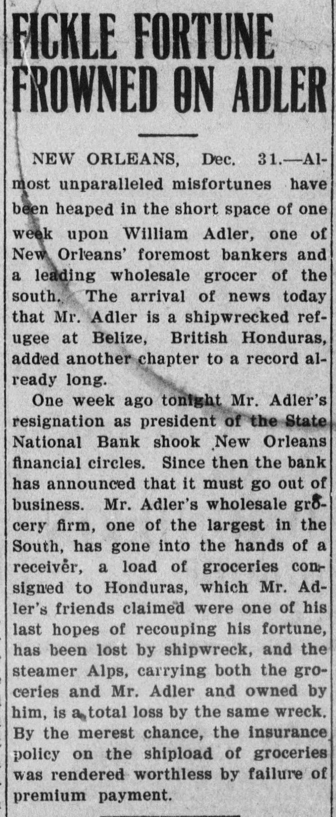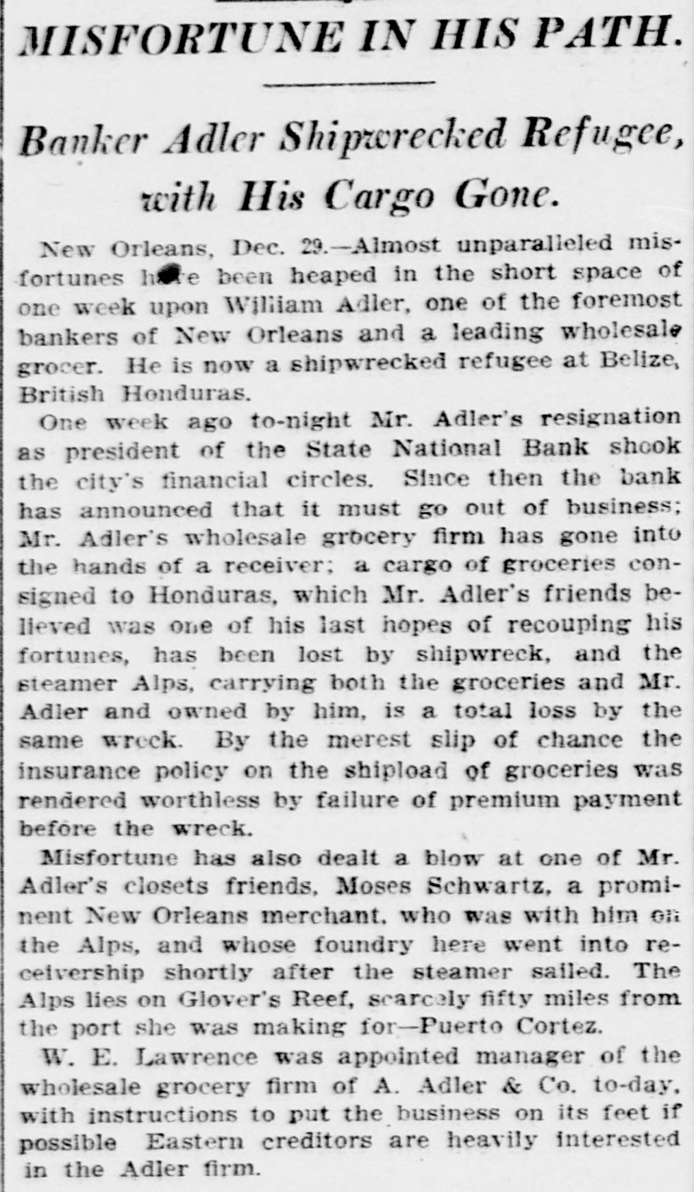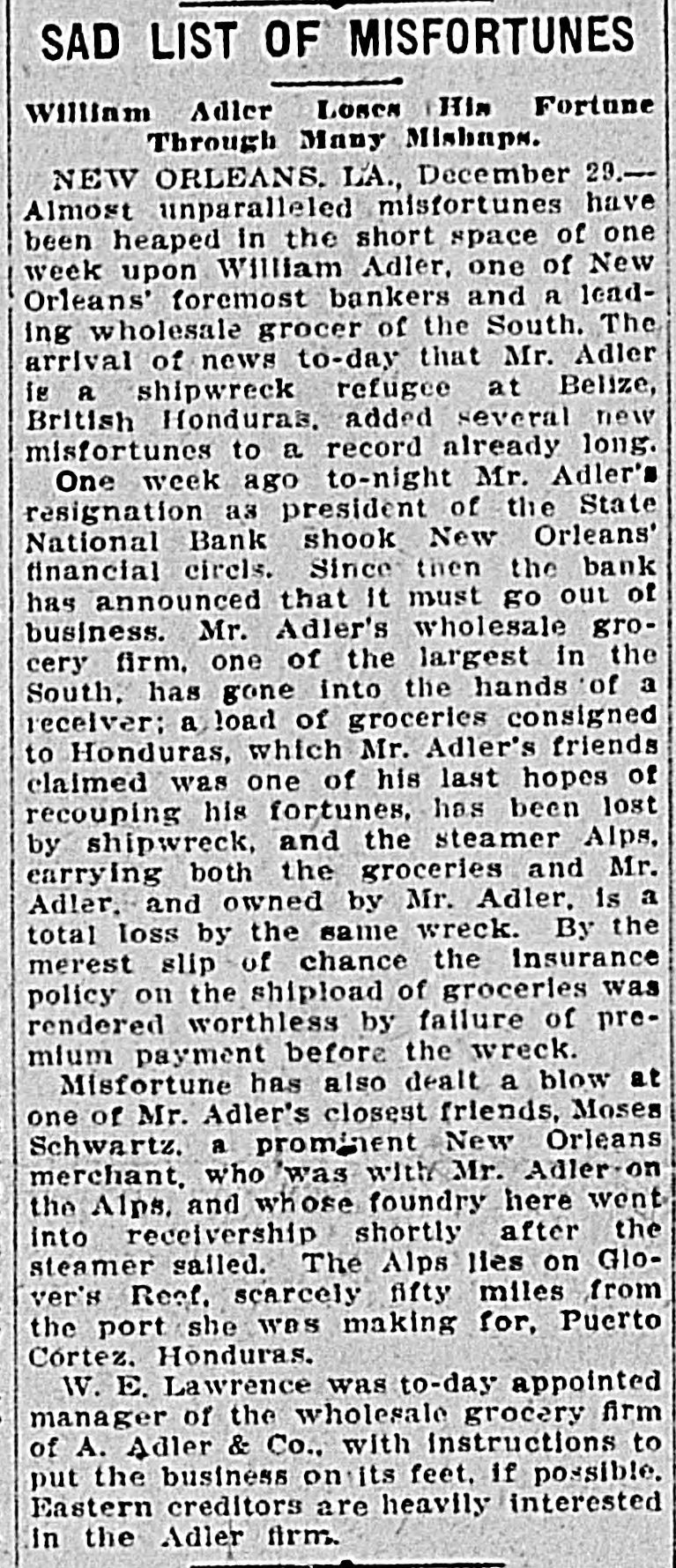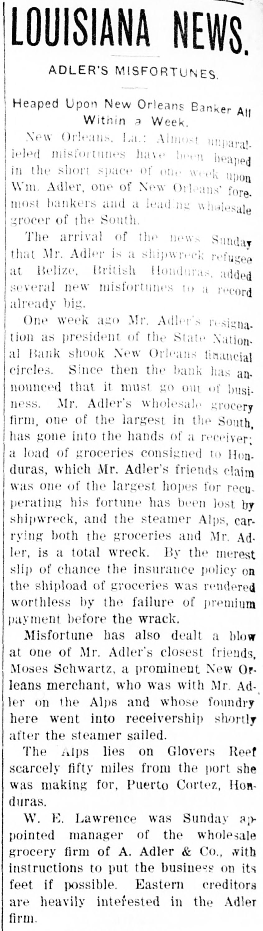 prominent in business and philan thropy, died in Denver, aged 87 years. one man was killed and five injured in Los Angeles, Cal., when a train struck a, street car. Rescued from their vessel after she had become disabled in midocean, carried to Genoa and thence to London, Capt. Kelly and the five members of the crew of the brigantine Aquila arrived at Halifax, N. S., on the Allan line steamer Sardinian. That no necessity exists for a reduction in the prices of iron and steel and that none will be made was the general understanding arrived at by representative manufacturers of pig iron, iron and steel at a meeting held in New York. Dr. Leander Starr Jameson, premier and secretary for native affairs of Cape Colony, has resigned. He assumed these offices in February, 1904. Fire wiped out the village of Twin Lakes. Minn., over 200 persons being made homeless. After a struggle of five hours against cold and a turbulent sea, the life savers of the Coslata station, near Nantucket, rescued the crew of the Newport brigantine Fredericka Schepp, which was wrecked on the north side of Coatue beach. The flag of the American man-ofwar Chesapeake and the "Balaclava bugle," two of the most valuable war relics of a collection of antiquities that belonged to the late T. G. Middlebrook, were secured at the auction sale of the collection in London for American buyers. A proposal for state-wide liquor prohibition was rejected in the Michigan constitutional convention by a vote of 55 to 39. In a dispute over a horse, Philip Kastner. aged 62, shot and fatally wounded his son George, aged 32, at Jasper, Ind. The office of the superintendent of poor at West Seneca, N. Y., was besieged by 500 men begging for food. Four men were taken to the county hospital suffering from starvation. The lower house of the Oklahoma legislature passed a measure prohibiting the smoking of cigarettes in the state. William S. Wood of the firm of Lloyd & Wood, one of the best-known lawyers on the Pacific coast, died at his home in San Francisco. Nine miners were killed by an explosion in the New Rivery colliery near Hawk's Nest, W. Va. Because he was angry with his wife, William Meutsch of Chicago killed one of his children and fatally shot the two others. Col. Burr Robbins, the old-time circus man, died in Chicago. King's court, one of the show places of Lakewood, N. J., a residence built some years ago by George Gould for his son, Kingdon, was destroyed by fire. The building was valued at $500,000. Liquidation of the State National bank of New Orleans was decided upon by a vote of the stockholders. This bank is nearly 100 years old. The superior court at Paris refused to grant an absolute divorce to Maud Gonne from her husband, Maj. McBride. The schooner Helen E. Taft of Thomaston, Me., was run down and sunk by an unknown steamer 16 miles southwest of Cape Lookout lightship off the coast of North Carolina. Pearl Harper was acquitted at Cadillac, Mich., on the charge of murdering her stepfather. Arthur W. Fergusson, secretary of the Philippine commission, died suddenly of heart disease in Manila. The Diamond Window Glass factory at Gas City, Ind., was destroyed by fire, resulting in a loss estimated at $100,000. The American torpedo boat flotilla sailed from Buenos Ayres for Punta Arenas. Dr. J. C. Brigham perished in a fire that destroyed eight stores and residences in Girard, Ga. E. G. Anderson, alderman. coal dealer and prominent citizen of Aberdeen, S. D., was arrested charged with being a receiver of stolen coal. Two financial institutions of New York city, one a national and the other a state bank, closed their doors The New Amsterdam National bank, capital $1,000,000, was taken in charge by the representative of the comptroller of the currency, and the Mechanics' and Traders' bank, a state institution, capital $2,000,000, announced the decision of the directors not to open. Both banks announced their ability to pay all depositors. The $100,000 estate of Capt. Hooker of Rochester, N. Y., who left a will bequeathing his property to Galesburg, III., will be distributed, the surrogate having denied probate to the will on the ground that Capt. Hooker was mentally incompetent. Peter F. Clark of Girard, III., pleaded guilty to the charge of murdering Mrs. Ollie Gibson on a trolley car near Virden March 25, 1907, and was sentenced to serve 40 years in the penitentiary. In Lublin, Russian Poland, the police unearthed a band of robbers composed entirely of women and the leaders have been taken into custody. The Coburn warehouses in Indianap olis were burned, the loss being
