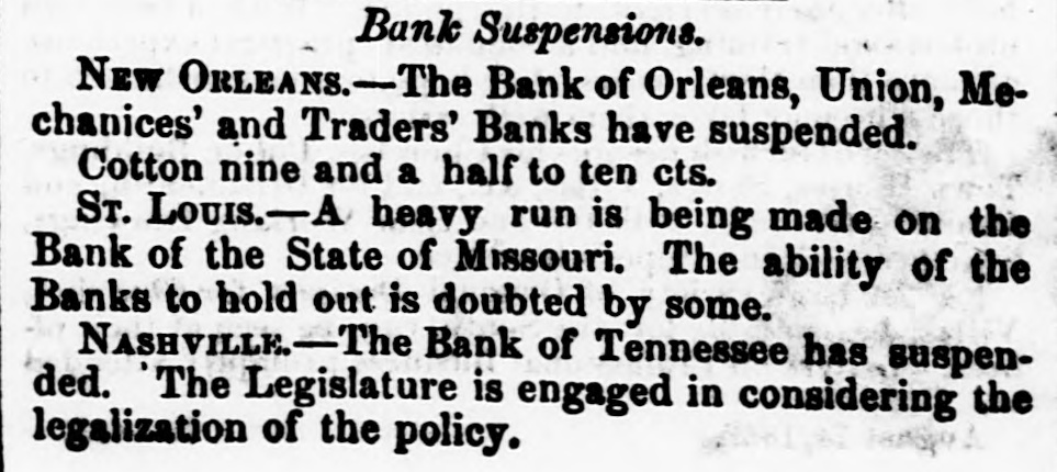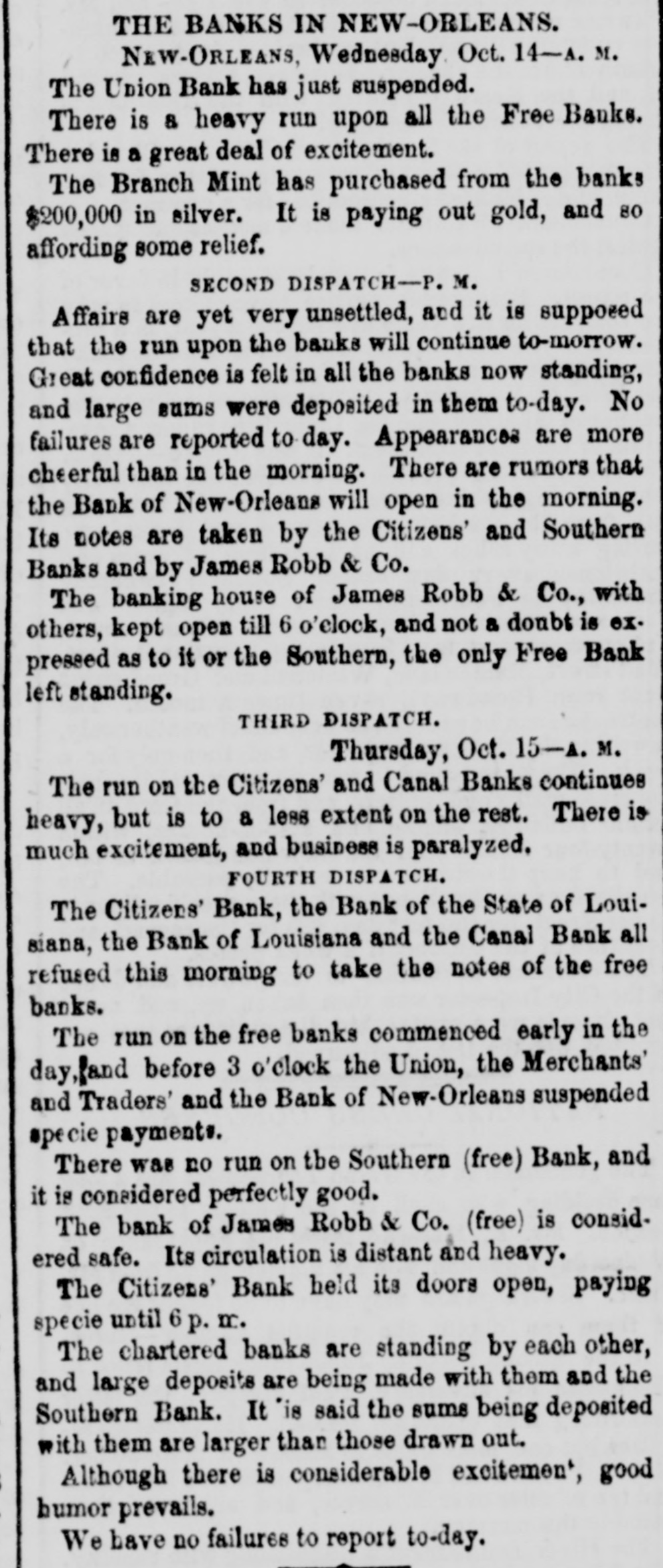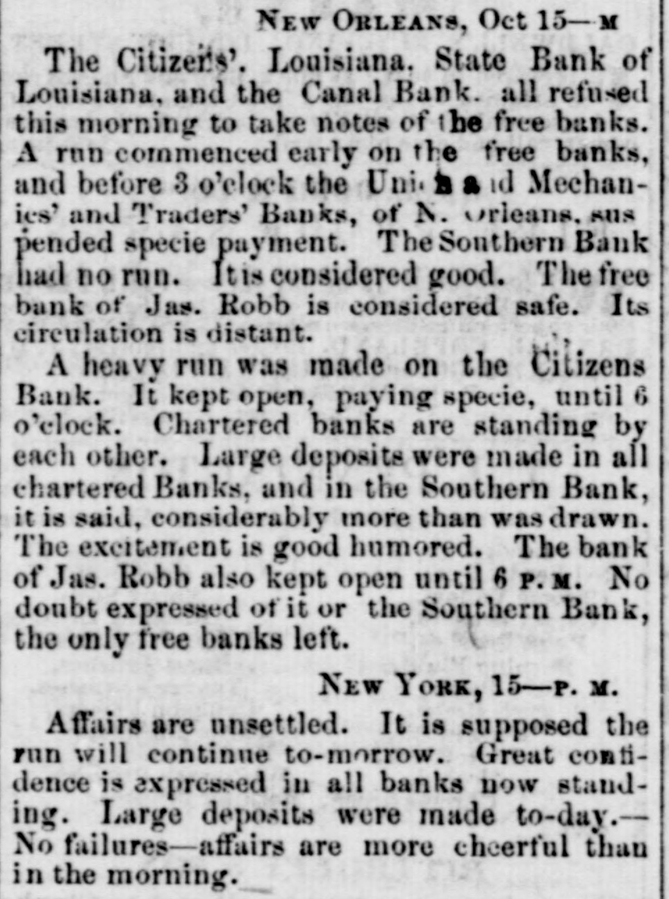 TELEGRAPHIC 1 TELEGRAPHED EXCLUSIVELY TO THE EVANSVILLEDAILY JOURNAL Financial. BOSTON, Oct 15-P M At an adjourned meeting to-day for the purpose of arranging plans for facilitating business at the Clearing House, it was pro posed to discount liberally on undoubted pa per, so as to turnish relief to business men who are beginning to bend beneath the pressure. Little, Alden & Co. have not suspended. and ask an extension only on behalf of several mills of which they are the agents. Philadelphia, Oct 15-P M The disposition manifested by the banks. not to accept the provisions of the late act of the Legislature. has cast additional gloom upon the business community. Nashville, Tenn., Oct 15 The Bank of Tennessée has suspended.The Legislature is considering the propriety of legalizing a general suspension. The Planters' and Union banks will hold out to the last, unless authorized to suspend. CINCINNATI, Oct 16-P M Money matters quite unsettled in consequence of the news from New York and elsewhere. Some Banking Honses refuse to take notes of suspended banks. Others take notes of all good banks. Exchange on New York is nominal; rates called 5 to 7 per cent premium. It is thought Kentucky, Indiana. and Ohio State Banks will not suspend at present! NEW ORLEANS, Oct 15-M The Citizens'. Louisiana. State Bank of Louisiana, and the Canal Bank. all refused this morning to take notes of the free banks. A run commenced early on the free banks, and before 3 o'elock the Unio h a id Mechanies' and Traders' Banks, of N. Orleans, sus pended specie payment. The Southern Bank had no run. Itis considered good. The free bank of Jas. Robb is considered safe. Its circulation is distant. A heavy run was made on the Citizens Bank. It kept open, paying specie, until 6 o'clock. Chartered banks are standing by each other. Large deposits were made in all chartered Banks, and in the Southern Bank, it is said, considerably more than was drawn. The excitement is good humored. The bank of Jas. Robb also kept open until 6 P.M. No doubt expressed of it or the Southern Bank, the only free banks left. NEW YORK, 15-p. M. Affairs are unsettled. It is supposed the run will continue to-morrow. Great contidence is expressed in all banks now standing. Large deposits were made to-day.No failures-affairs are more cheerful than in the morning.