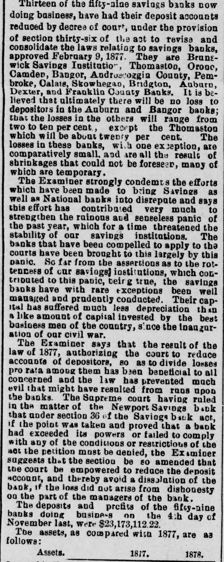 THIRTEEN OF THE FIFTY-NINE SAVINGS BANKS NOW Thirteen of the fifty-nine savings banks now doing business, have had their deposit accounts reduced by decree of court, under the provision of section thirty-six of the act to revise and consolidate the laws relating to savings banks, approved February 9, 1877. They are Brunswick Savings Institution, Thomaston, Orone, Camden, Bangor, Androscoggin County, Pembroke, Calais, Skowhegan, Bridgton, Auburn, Dexter, and Franklin County Banks. It is believed that ultimately there will be no loss to depositors in the Auburn and Bangor banks; that the losses in the others will range from two to ten per cent., except the Thomaston which will be about twenty per cent. The losses in these banks, with one exception, are comparatively small, and are all the result of shrinkages that could not be foreseen, many of which are temporary. The Examiner strongly condemns the efforts which have been made to bring Savings as well as National banks into disrepute and says this effort has contributed very much to strengthen the ruinous and senseless panic of the past year, which for a time threatened the stability of our savings institutions. The banks that have been compelled to apply to the courts have been brought to this largely by this panic. So far from the assertions as to the rottenness of our savings institutions, which contributed to this panic, being true, the savings banks have with rare exceptions been well managed and prudently conducted. Their capital has suffered much less depreciation than a like amount of capital invested by the best business men of the country, since the inauguration of our civil war. The Examiner says that the result of the law of 1877, authorizing the court to reduce accounts of depositors, so as to divide losses pro rata among them has been beneficial to all concerned and the law has prevented much evil that might have resulted from runs upon the banks. The Supreme court having ruled in the matter of the Newport Savings bank that under section 36 of the Savings bank act, if the point was taken and proved that a bank had exceeded its powers or failed to comply with any of the conditions or restrictions of the act the petition must be denied, the Examiner suggests that the section be so amended that the court be empowered to reduce the deposit account, and thereby avoid a dissolution of the bank, if the loss did not arise from dishonesty on the part of the managers of the bank. The deposits and profits of the fifty-nine banks doing business on the 4th day of November last, were $23,173,112.22. The assets, as compared with 1877, are as follows: Assets. 1817. 1878.