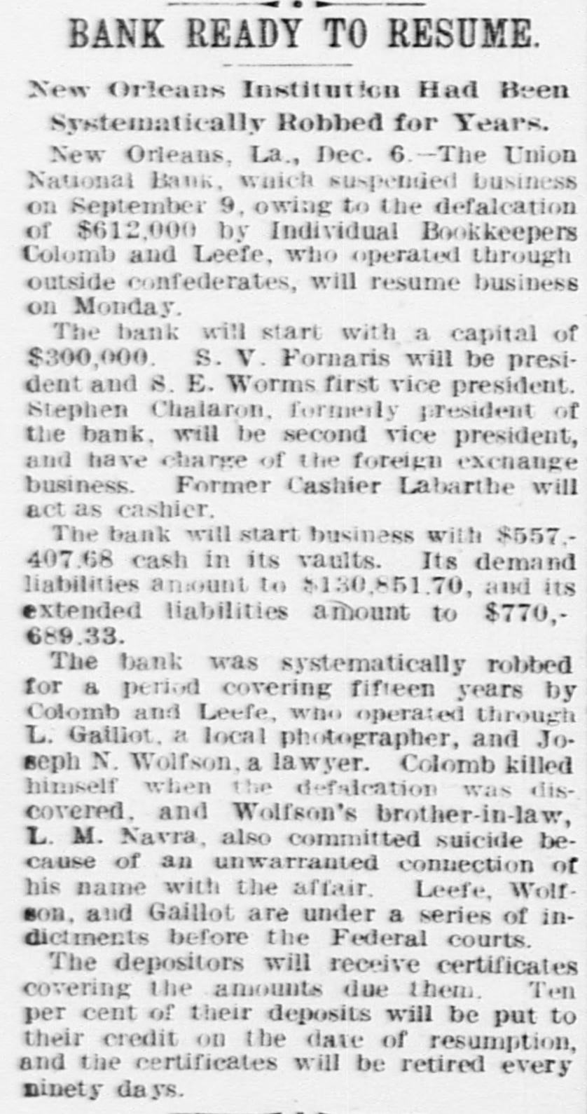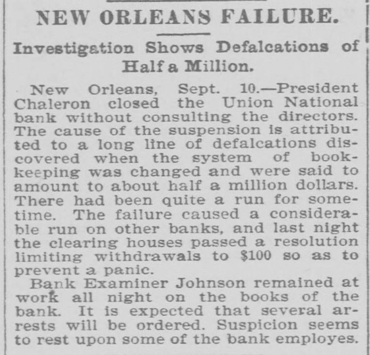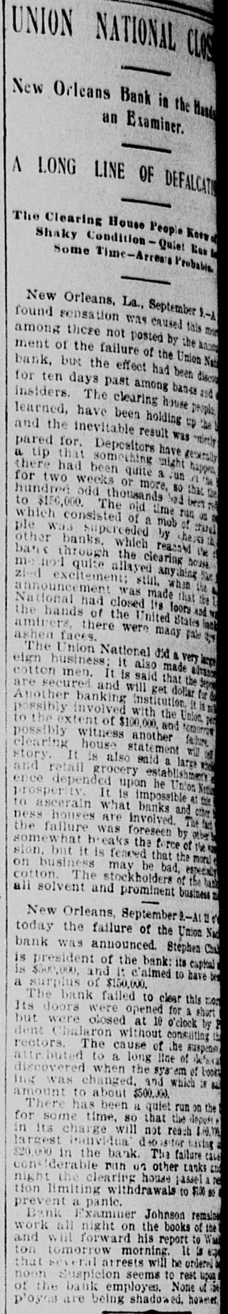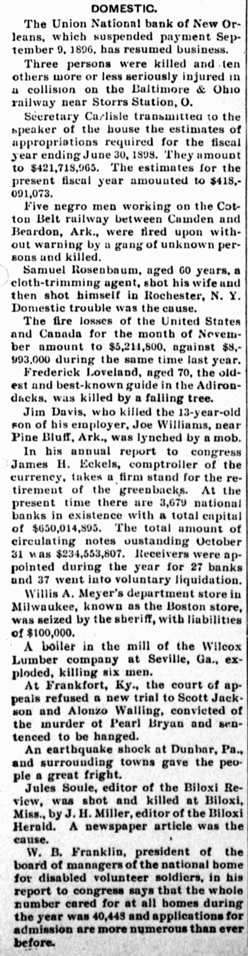 LATE NEWS NOTES. Seven cows were killed by lightning near Leavenworth. Miss Willard has issued an appeal to the W. C. T. U. for the Armenians. Jules A. Barron, brother-in-law of ex-Governor Lubbock of Texas, was killed by a trolley car at Galveston. Germany and Russia are endeavoring to uniform extradition laws in all Europe. with relation to Anarchists. The American representatives have finished their examination of English archives upon the Venezuelan boundary question. The Venezuela Commission will report to the President early in De. cember. Examiner Escott says that the liabilities of the Union National Bank of New Orleans are $1,635,700. C. L. Grimes was acquitted of the charge of murdering his son-in-law, Luther Whitmore, at Moberly, Mo. Two swell robbers held up five men in a Chicago office, got $1,600, shot a milkman and escaped in his wagon. President Nicholls and Cashier De Beane have been arrested at New Or. leans for receiving deposits in the Bank of Commerce after it became insolvent. It is report d that England, Russia and France will act together as regards Turkey. A cloudburst struck the town of San Marcos, Texas, and washed away a large portion of the town. Treasurer George S. Morrison of Rensselaer county, N. Y., is a defaulter for $250,000. An anti-Masonic congress is in session at Trent, Southern Tyrol, with delegates from all European countries and Canada. Banks of Greeley and Argonia have failed. Mrs. Julia Lamb of Worth county has been convicted in the federal court at St. Joseph of pension frauds and fined $1,000 and costs of suit. Edward H. Mohnken, who resided near Sedalia, died from blood poisoning, the result of an accident wherein his ankle was fractured. John W. Wicks of Topeka, who was married in St. Joseph last week, now mourns the loss not only of his wife but of $300 with which she skipped out. Four murderers were executed in New Mexico in one day. Bessie Bellwood, the well known music hall singer, is dead. Her death was due to syncope. Eugene C. Gregory, a Yale student, committed suicide in his home in New York by inhaling illuminating gas. Al Ruhman, the husband of Zella Nicolaus, has been sent to the Chicago bridewell on a fine of $100 for vagrancy. Harry M. Conway of Chicago was shot and killed by his 18-year-old wife, who then sent a bullet into her own heart. Li Hung Chang has sent a message to the secretary of state thanking the United States government for the many courtesies shown him on his visit to this country. I A convention of delegates from the 0 several states will be held at Asheville, N. C., October 21-23 to petition Congress to adopt a "national flower of America," the convention to select the flower. D. D. Breckinridge of Watertown, N. Y., en route to Amesville, Ohio, to be married to Miss Ethel Gould, had his leg broken in a rail way wreck at Athens. Miss Gould, on hearing of the accident, went to Athens, and the B wedding took place at the appointed time. Callias Bey. the Arabian who married the widow of P. T. Barnum, is dead. & Carnegie armor plate making secrets were learned by Russia through a small contract placed at Homestead. A Russian was present for eight months by stipulation in the contract, and learned the whole business. Carnegies were very accommodating, expecting new orders from Russia. James J. Joy of Detroit, famous railroad builder and financier, is dead. Burpee, Ramsey & Co., shoe manufacturers, of Lynn, Mass., have failed. They did d business of $1,000,000 a year. Because he slapped a 5-year-old white child James Hawkins was lynched and Alexander and Arthur S Green shot dead near Gretna, La. All were colored. James A. Keaton has been appointed P associate justice of the Oklahoma Supreme court. The lumber and mills of the Cascade Iowa, Lumber company were det stroyed by fire. The loss is $105,000. A disastrous gale visited Great Britain. Much damage was done in London. Frank H. Johnson, a Chicago grain broker, killed himself in Lincoln park because of losses. National Sporting club, London, will not allow Corbett on the premises, but will welcome Fitzsimmons. Allied Silver forces of Topeka will run C. K. Holliday for the Legislature against E. D. McKeever, Republican. A great locomotive on the Eig Four railroad blew up at Pekin, ILL, killing the fireman and wrecking a factory near by. Cattle Thief Kittrell, under arrest in Mexico and wanted in Indian Terretory. can not be extradited, his case not being covered by treaty. A. D. Powers, a Cuban worker in Chicago is missing.