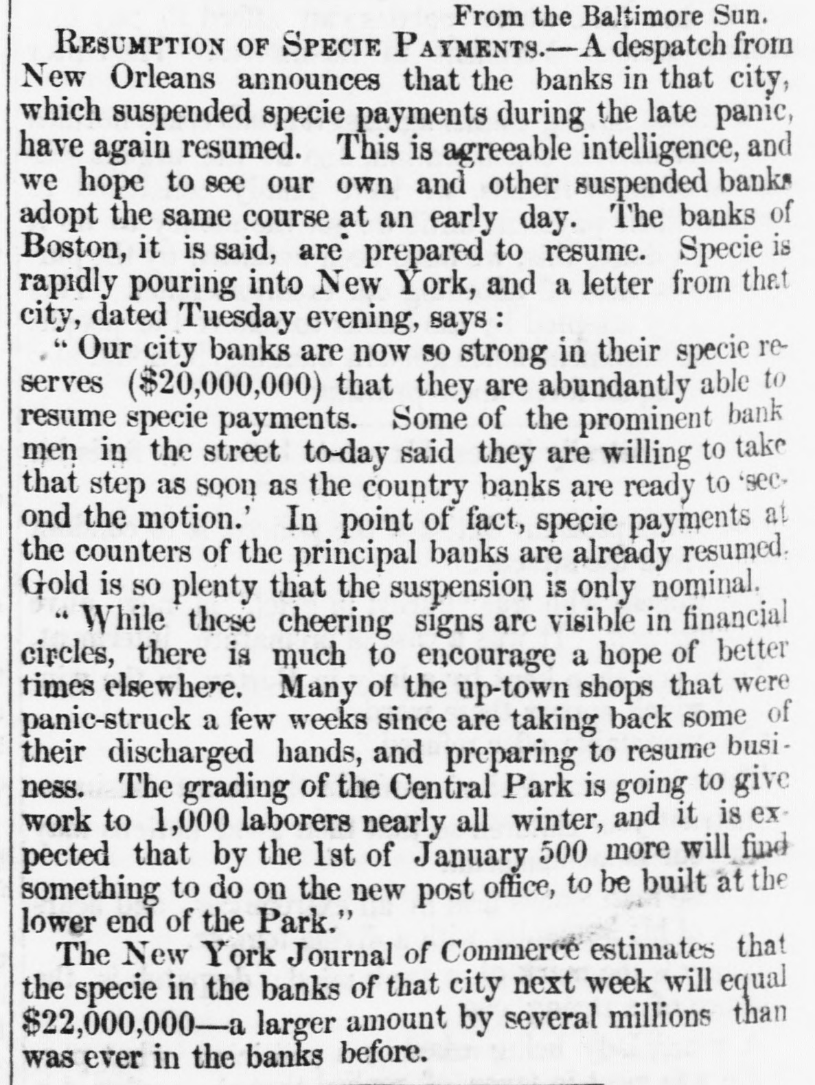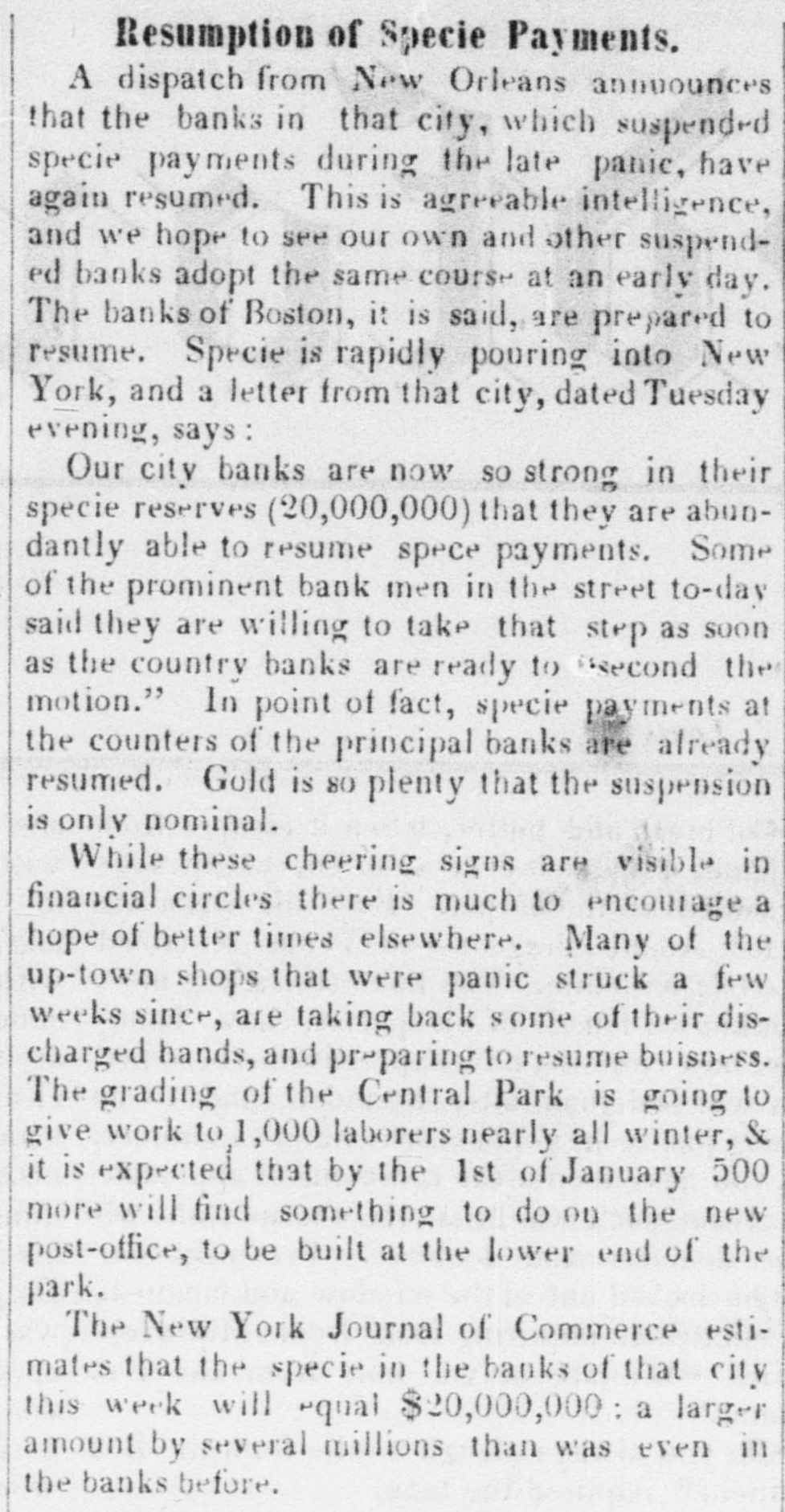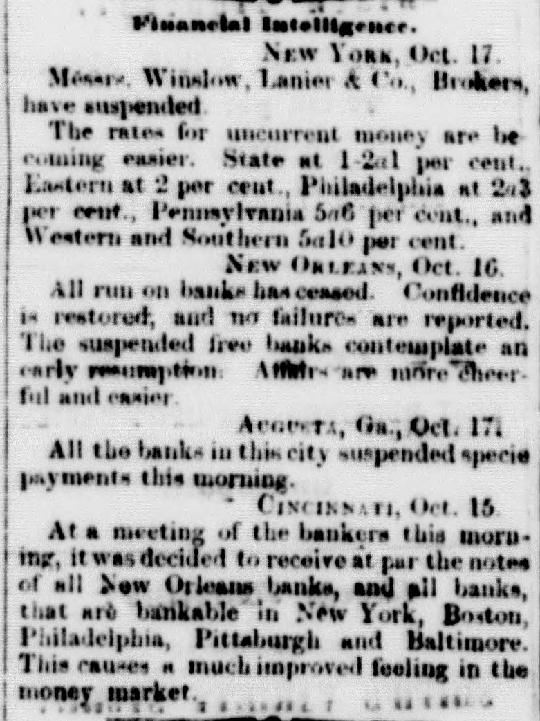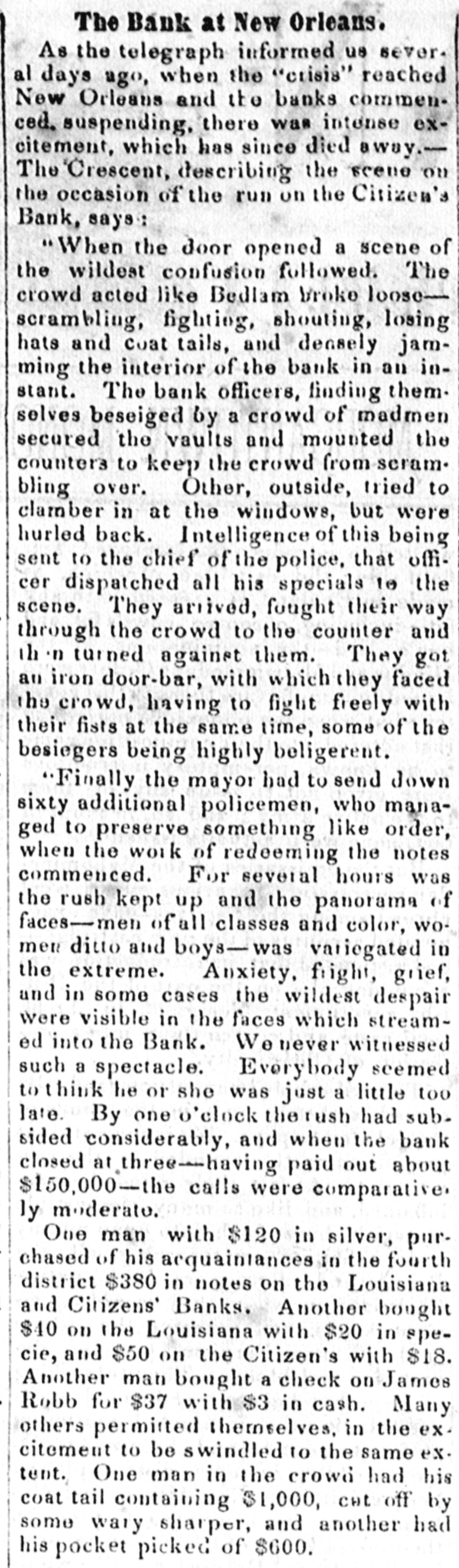The Bank at New Orleans. As the telegraph informed us sever. al days ago, when the "crisis" reached New Orleans and the banks commenced. suspending, there was intense excitement, which has since died away.The Crescent, describing the scene on the occasion of the run on the Citizen's Bank, says: "When the door opened a scene of the wildest confusion followed. The crowd acted like Bedlam broke loose— scrambling, fighting, shouting, losing hats and coat tails, and deasely jamming the interior of the bank in an instant. The bank officers, finding themselves beseiged by a crowd of madmen secured the vaults and mounted the counters to keep the crowd from seram. bling over. Other, outside, tried to clamber in at the windows, but were hurled back. Intelligence of this being sent to the chief of the police, that officer dispatched all his specials to the scene. They arrived, fought their way through the crowd to the counter and th n turned against them. They got an iron door-bar, with which they faced the crowd, having to fight freely with their fists at the same time, some of the besiegers being highly beligerent. "Finally the mayor had to send down sixty additional policemen, who managed to preserve something like order, when the work of redeeming the notes commenced. For several hours was the rush kept up and the panorama of faces—men of all classes and color, women ditto and boys-was variegated in the extreme. Anxiety, fright, grief, and in some cases the wildest despair were visible in the faces which streamed into the Bank. We never witnessed such a spectacle. Everybody seemed to think he or she was just a little too late. By one 'clock the rush had subsided considerably, and when the bank closed at three-having paid out about $150,000-the calls were comparative. ly moderato. One man with $120 in silver, purchased of his acquaintances in the fourth district $380 in notes on the Louisiana and Citizens' Banks. Another bought $40 on the Louisiana with $20 in specie, and $50 on the Citizen's with $18. Another man bought a check on James Robb for $37 with $3 in cash. Many others permitted themselves, in the excitement to be swindled to the same ex. tent. One man in the crowd had his coat tail containing $1,000, cut off by some wary sharper, and another had his pocket picked of $600.