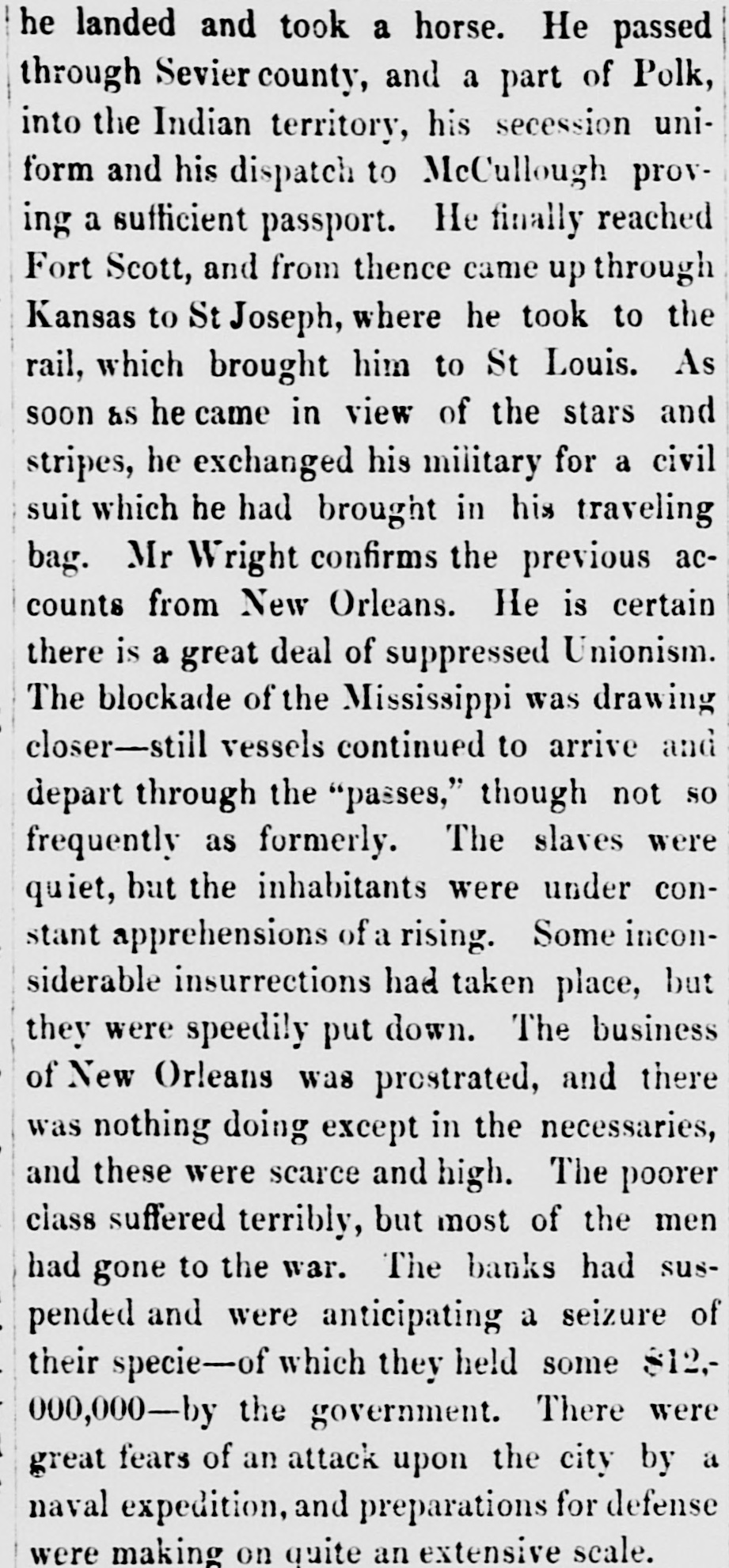 he landed and took a horse. He passed through Sevier county, and a part of Polk, into the Indian territory, his secession uniform and his dispatch to McCullough proving a sufficient passport. He finally reached Fort Scott, and from thence came up through Kansas to St Joseph, where he took to the rail, which brought him to St Louis. As soon as he came in view of the stars and stripes, he exchanged his military for a civil suit which he had brought in his traveling bag. Mr Wright confirms the previous accounts from New Orleans. He is certain there is a great deal of suppressed Unionism. The blockade of the Mississippi was drawing closer-still vessels continued to arrive and depart through the "passes," though not so frequently as formerly. The slaves were quiet, but the inhabitants were under constant apprehensions of a rising. Some inconsiderable insurrections had taken place, but they were speedily put down. The business of New Orleans was prostrated, and there was nothing doing except in the necessaries, and these were scarce and high. The poorer class suffered terribly, but most of the men had gone to the war. The banks had suspended and were anticipating a seizure of their specie-of which they held some $12,000,000-by the government. There were great fears of an attack upon the city by a naval expedition, and preparations for defense were making on quite an extensive scale.