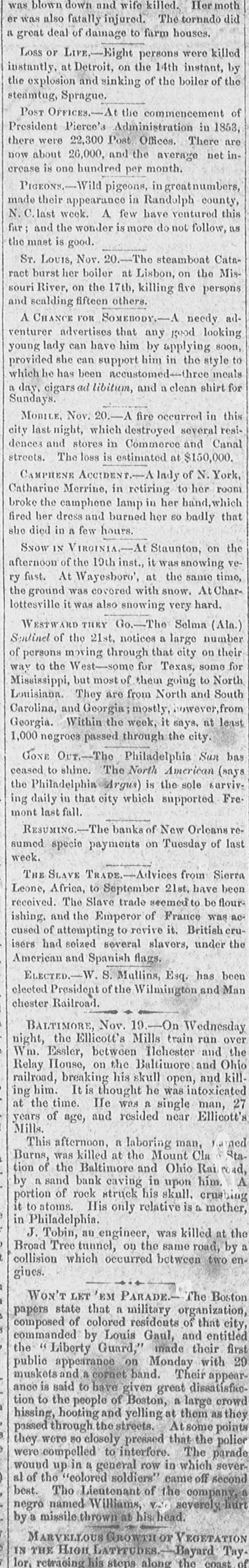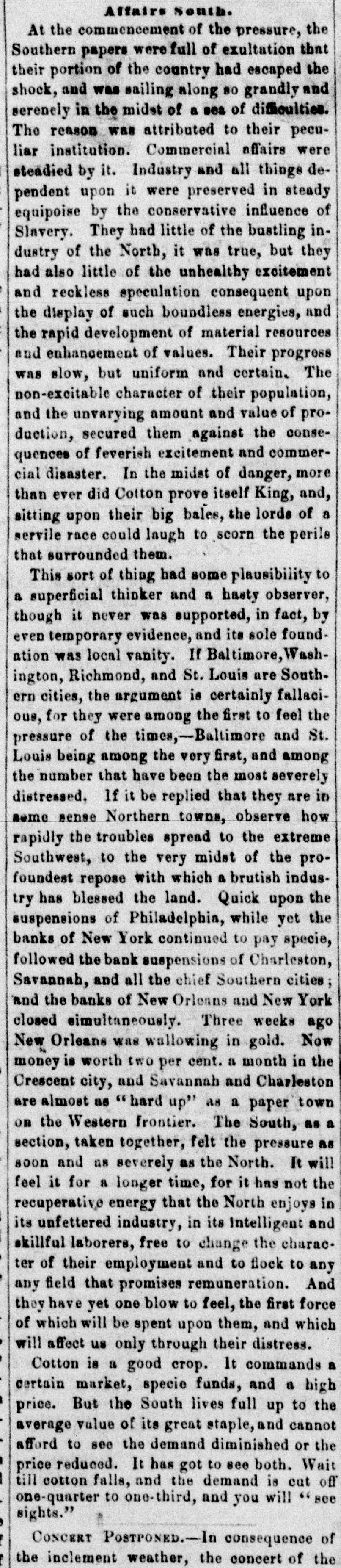 Affairs South. At the commencement of the pressure, the Southern papers werefull of exultation that their portion of the country had escaped the shock, and was sailing along 80 grandly and serenely in the midst of a sea of difficulties. The reason was attributed to their peculiar institution. Commercial affairs were steadied by it. Industry and all things dependent upon it were preserved in steady equipoise by the conservative influence of Slavery. They had little of the bustling industry of the North, it was true, but they had also little of the unhealthy excitement and reckless speculation consequent upon the display of such boundless energies, and the rapid development of material resources and enhancement of values. Their progress was slow, but uniform and certain, The non-excitable character of their population, and the unvarying amount and value of production, secured them against the consequences of feverish excitement and commercial disaster. In the midst of danger, more than ever did Cotton prove itself King, and, sitting upon their big bales, the lords of a servile race could laugh to scorn the perils that surrounded them. This sort of thing had some plausibility to a superficial thinker and a hasty observer, though it never was supported, in fact, by even temporary evidence, and its sole foundation was local vanity. If Baltimore, Washington, Richmond, and St. Louis are Southern cities, the argument is certainly fallacious, for they were among the first to feel the pressure of the times,-Baltimore and St. Louis being among the very first, and among the number that have been the most severely distressed. If it be replied that they are in some sense Northern towns, observe how rapidly the troubles spread to the extreme Southwest, to the very midst of the profoundest repose with which a brutish industry has blessed the land. Quick upon the suspensions of Philadelphia, while yet the banks of New York continued to pay specie, followed the bank suspensions of Charleston, Savannah, and all the chief Southern cities; and the banks of New Orleans and New York closed simultaneously. Three weeks ago New Orleans was wallowing in gold. Now money is worth two per cent. a month in the Crescent city, and Savannah and Charleston are almost as "hard up" as a paper town OR the Western frontier. The South, as a section, taken together, felt the pressure as soon and as severely as the North. It will feel it for a longer time, for it has not the recuperative energy that the North enjoys in its unfettered industry, in its Intelligent and skillful laborers, free to change the charaeter of their employment and to flock to any any field that promises remuneration. And they have yet one blow to feel, the first force of which will be spent upon them, and which will affect us only through their distress. Cotton is a good crop. It commands a certain market, specie funds, and a high price. But the South lives full up to the average value of its great staple, and cannot afford to see the demand diminished or the price reduced. It has got to see both. Wait till cotton falls, and the demand is cut off one-quarter to one-third, and you will see sights." CONCERT POSTPONED.-In consequence of the inclement weather, the concert of the