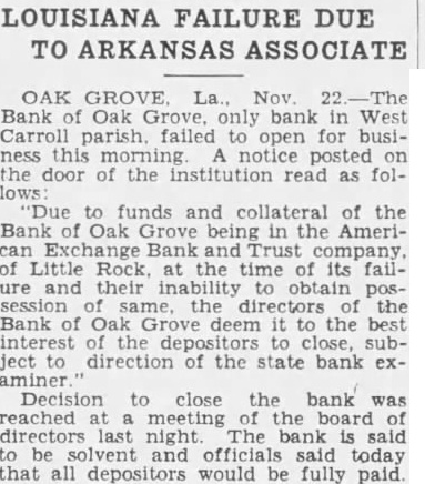 LOUISIANA FAILURE DUE TO ARKANSAS ASSOCIATE OAK GROVE La Nov The Bank of Oak only bank in West Carroll parish. failed to open for business this morning notice posted on the door of the institution read as follows 'Due to funds and collateral of the Bank of Oak Grove being in the American Exchange Bank and Trust company. of Little Rock, at the time of its failure and their inability to obtain possession of same, the directors of the Bank of Oak Grove deem it to the best interest of the depositors to close, subject to direction of the state bank examiner Decision to close the bank was reached meeting of the board directors last night The bank is said to be solvent and officials said today that all depositors would be fully paid