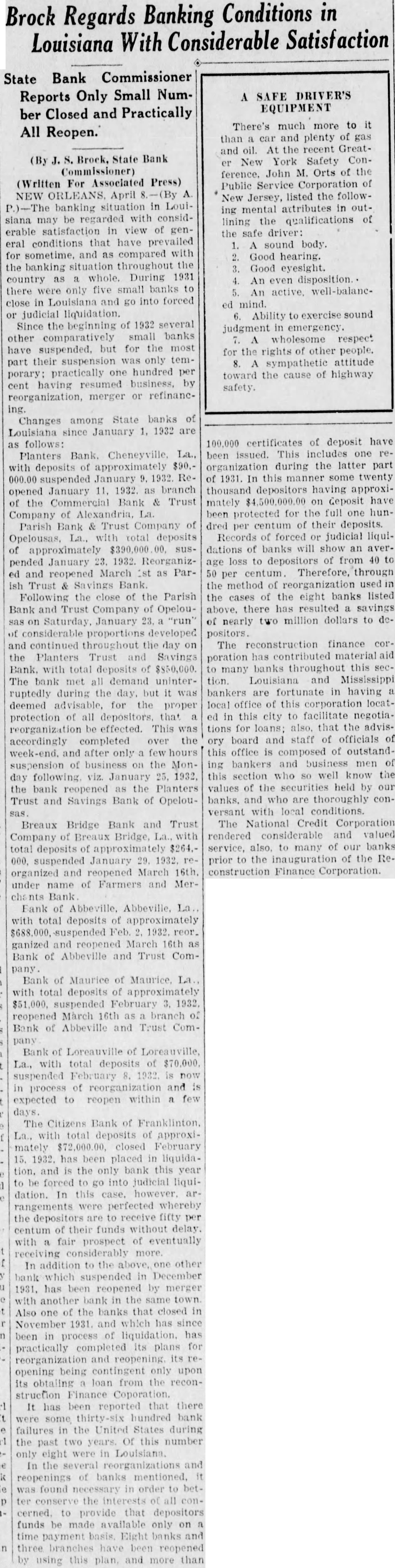 Brock Regards Banking Conditions in Louisiana With Considerable Satisfaction State Bank Commissioner Only Small NumReports ber Closed and Practically All Reopen. (By Brock, Bank Commissioner) Associated Press) NEW April banking Louisiana considview of genprevailed for sometime, as compared with banking situation throughout the whole. During 1931 country five small banks Louisiana and go forced judicial beginning of 1932 several small banks other but for part only temporary: practically hundred cent resumed business, by reorganization, merger or refinancing. Changes among State banks Louisiana since January 1932 are follows: Planters Bank. Cheneyville, deposits approximately suspended January 1932. opened January 11. 1932. branch Commercial Bank Trust Company Alexandria, Parish Bank Trust Company Opelousas, deposits approximately $390,000 pended January and reopened ParTrust Savings Following the close the Parish Bank and Trust Company of OpelouSaturday January and continued day on the Planters Trust Savings The bank demand ruptedly during day but deemed proper reorganization effected. This accordingly completed business the Monday following January 1932. the bank reopened the Planters Trust and Savings Bank of OpelouBreaux Bridge Bank Trust Company Bridge deposits $264.000. January 1932. organized and reopened March 16th under name of Farmers and MerBank total deposits approximately ganized March 16th Bank of Abbeville Trust ComBank Maurice Maurice deposits February March branch Bank and Trust ComBank Loreauville Loreauville with deposits and expected within Citizens deposits February has placed liquida and the this judicial dation. this however perfected the receive per with fair prospect eventually addition the suspended December 1931, has been reopened by merger another bank the one the banks closed November been process of practically plans reorganization and opening being contingent only its loan from the struction Finance Coporation. there hundred failures United during years. this number reorganizations and cerned, depositors payment reopened more certificates of deposit have issued This includes organization during the latter part of 1931. some twenty thousand depositors having approximately deposit protected for full per their deposits. Records forced judicial liquidations banks will age depositors from Therefore, method reorganization the cases the eight banks listed above. there resulted savings nearly million dollars to The reconstruction finance poration contributed many banks this Louisiana Mississippi bankers are fortunate in having this corporation in city facilitate negotiations for the board and officials office composed ing bankers business men section know the values by our banks. are thoroughly conversant with conditions. Credit Corporation rendered considerable valued many our banks inauguration of the construction Finance Corporation.