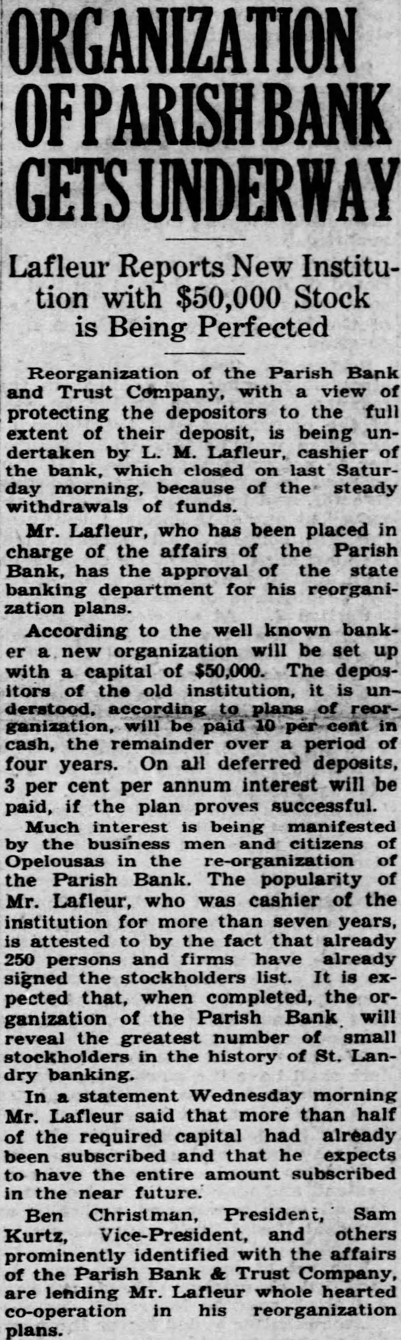 ORGANIZATION Lafleur Reports New Institution with Stock is Being Perfected of the Parish Bank and Trust Company, with view protecting the depositors to the full extent their deposit, being undertaken by Lafleur, cashier the bank, closed last Saturmorning, because of the steady withdrawals funds. Mr. Lafleur, who has been placed in charge of the affairs of the Parish Bank, has the approval of the state department for his reorganization plans. According to the well known banknew organization will be set up with capital of $50,000. The depositors of the old institution, it is will cash, the over period four years. On all deferred deposits, per cent per annum interest will be paid, if the plan proves successful. Much interest being manifested business men citizens Opelousas the the Parish Bank. The popularity Mr. Lafleur, who was cashier of the institution for more than seven years, attested to by the fact that already and firms have already signed the stockholders list. pected that, when completed, the organization of the Parish Bank will reveal greatest number of small stockholders in the history Landry banking. In statement Wednesday morning Mr. Lafleur said that more than half of the required capital had already and that he expects the entire amount subscribed in the near future. Ben Christman, President, Sam Kurtz, and others prominently identified with the affairs the Parish Bank Trust Company, lending Lafleur whole hearted co-operation in his reorganization plans.