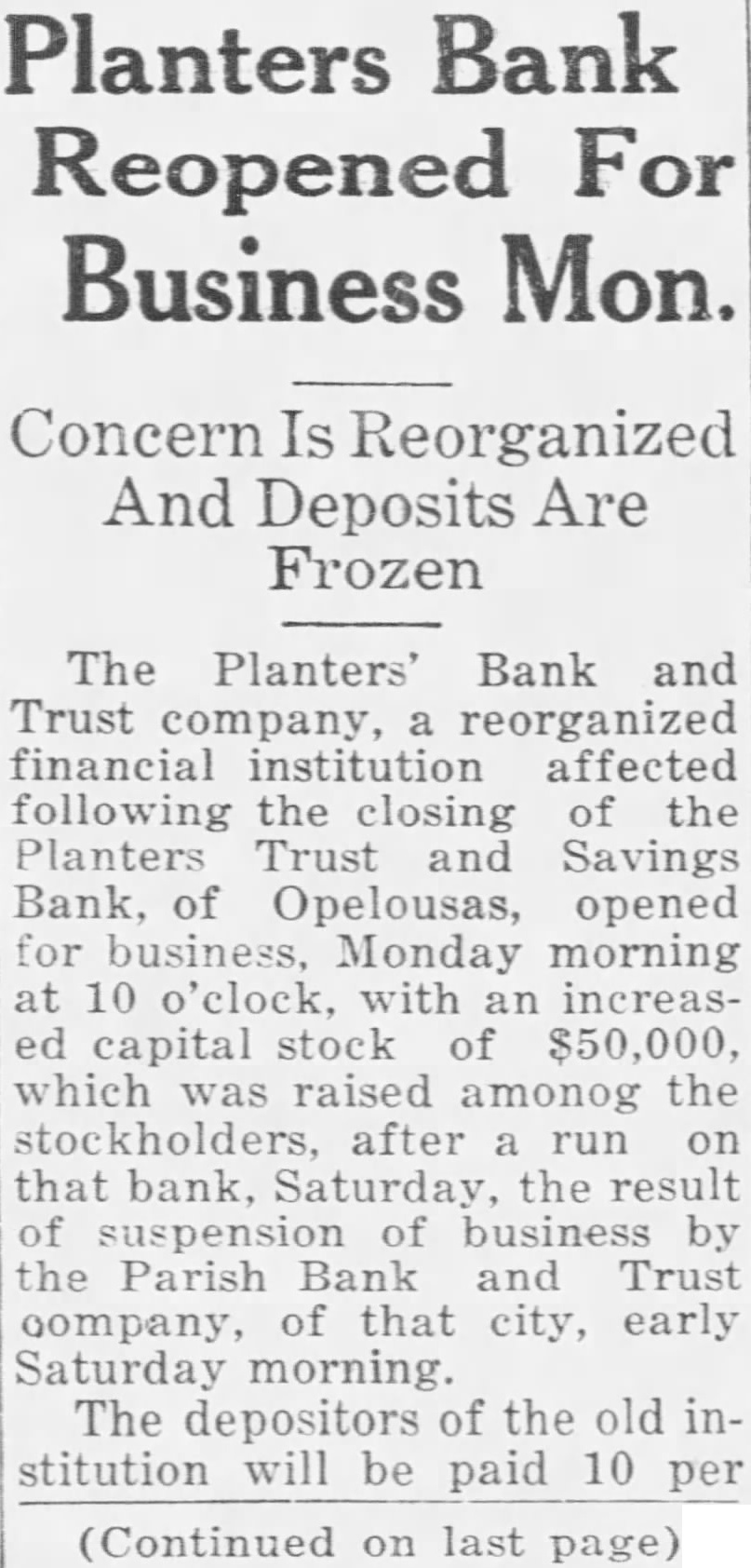 Planters Bank Reopened For Business Mon. Concern Is Reorganized And Deposits Are Frozen The Planters' Bank and Trust company, a reorganized financial institution affected following the closing of the Planters Trust and Savings Bank, of Opelousas, opened for business, Monday morning at 10 o'clock, with an increased capital stock of $50,000, which was raised amonog the stockholders, after a run on that bank, Saturday, the result of suspension of business by the Parish Bank and Trust company, of that city, early Saturday morning. The depositors of the old institution will be paid 10 per (Continued on last page)