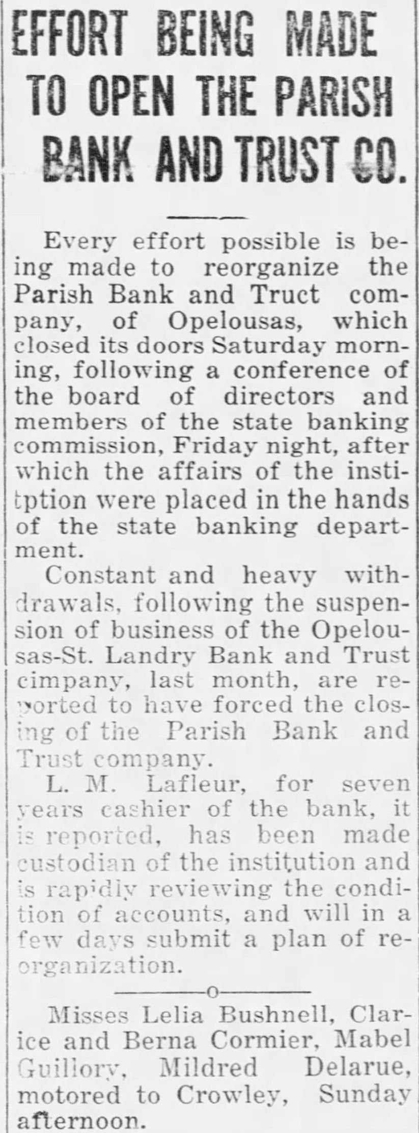 EFFORT BEING MADE TO OPEN THE PARISH BANK AND TRUST CO. Every effort possible is being made to reorganize the Parish Bank and Truct company, of Opelousas, which closed its doors Saturday morning, following a conference of the board of directors and members of the state banking commission, Friday night, after which the affairs of the institption were placed in the hands of the state banking department. Constant and heavy withdrawals, following the suspension of business of the Opelousas-St. Landry Bank and Trust cimpany, last month, are recorted to have forced the closing of the Parish Bank and Trust company. L. M. Lafleur, for seven years cashier of the bank, it is reported, has been made custodian of the institution and is rapidly reviewing the condition of accounts, and will in a few days submit a plan of reorganization. Misses Lelia Bushnell, Clarice and Berna Cormier, Mabel Guillory, Mildred Delarue, motored to Crowley, Sunday afternoon.