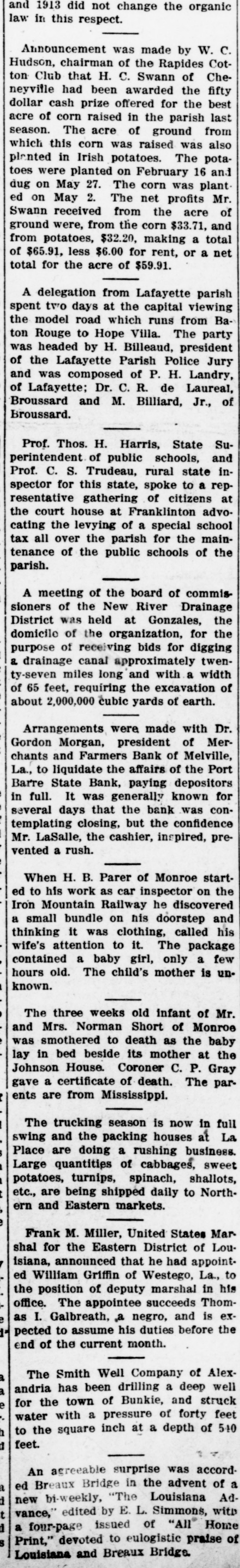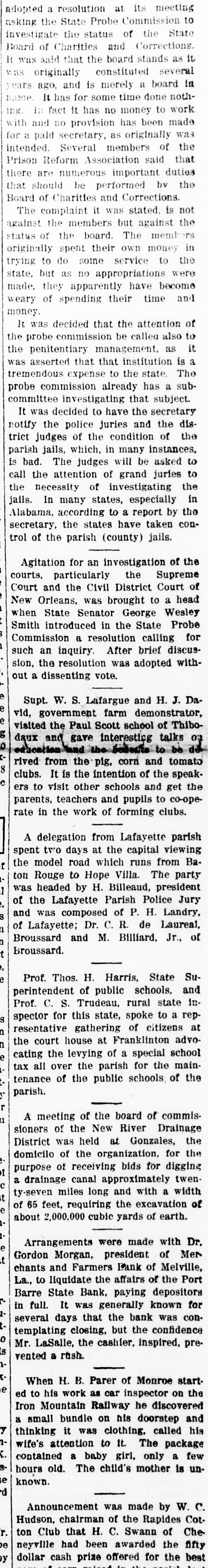 maue, they apparently have become weary of spending their time and money. It was decided that the attention of the probe commission be called also to the penitentiary management, as it was asserted that that institution is a tremendous expense to the state. The probe commission already has a subcommittee investigating that subject. It was decided to have the secretary notify the police juries and the district judges of the condition of the parish jails, which, in many instances, is bad. The judges will be asked to call the attention of grand juries to the necessity of investigating the jails. In many states, especially in Alabama, according to a report by the secretary, the states have taken control of the parish (county) jails. Agitation for an investigation of the courts, particularly the Supreme Court and the Civil District Court of New Orleans, was brought to a head when State Senator George Wesley Smith introduced in the State Probe Commission a resolution calling for such an inquiry. After brief discussion, the resolution was adopted without a dissenting vote. a Supt. W. S. Lafargue and H. J. Daa vid, government farm demonstrator, a visited the Paul Scott school of Thibo3 daux and gave interesting talks 03 o education land the benefits to be de rived from the pig, corn and tomato 8 clubs. It is the intention of the speak0 ers to visit other schools and get the parents, teachers and pupils to co-operate in the work of forming clubs. A delegation from Lafayette parish spent two days at the capital viewing I the model road which runs from Baton Rouge to Hope Villa. The party Il was headed by H. Billeaud, president ai of the Lafayette Parish Police Jury S and was composed of P. H. Landry, U of Lafayette; Dr. C. R. de Laureal, Broussard and M. Billiard, Jr., of Broussard. 7 in a Prof. Thos. H. Harris, State Superintendent of public schools, and Prof. C. S. Trudeau, rural state inS spector for this state, spoke to a repu resentative gathering of citizens at = the court house at Franklinton advoa cating the levying of a special school tax all over the parish for the maintenance of the public schools of the parish. :J II A meeting of the board of commissioners of the New River Drainage District was held at Gonzales, the domicilo of the organization, for the I purpose of receiving bids for digging a drainage canal approximately twen0 ty-seven miles long and with a width 11 a of 65 feet, requiring the excavation of about 2,000,000 cubic yards of earth. a Arrangements were made with Dr. Gordon Morgan, president of Mer 11 chants and Farmers Bank of Melville, La., to liquidate the affairs of the Port Barre State Bank, paying depositors 2 in full. It was generally known for several days that the bank was conis templating closing, but the confidence 0 Mr. LaSalle, the cashier, inspired, preS) vented a rush. -is When H. B. Parer of Monroe start. a ed to his work as car inspector on the Iron Mountain Railway he discovered a small bundle on his doorstep and & thinking it was clothing, called his wife's attention to It. The package is contained a baby girl, only a few in hours old. The child's mother is unas known.