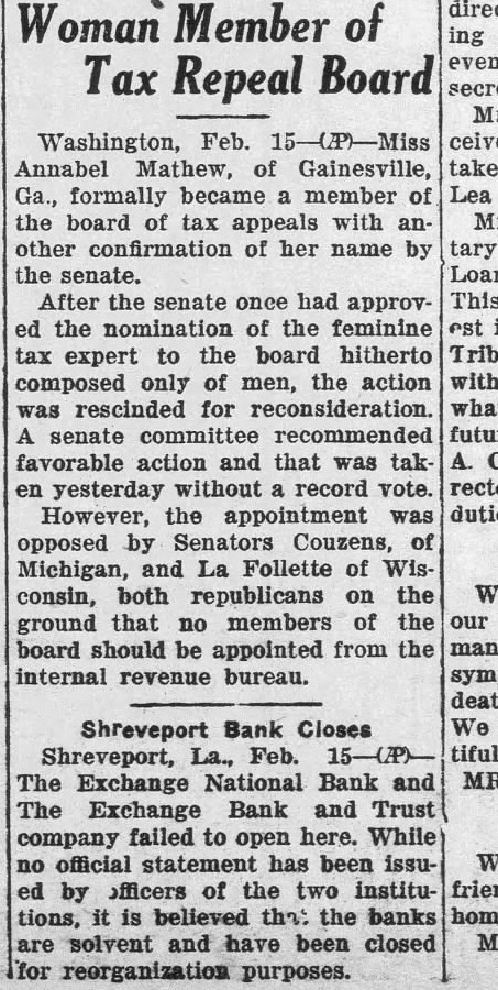 Washington, Feb. Annabel Mathew, of Gainesville, Ga., formally became member the board of tax appeals with another confirmation of her name by the senate. After the senate once had approved the nomination of the feminine tax expert to the board hitherto composed only of men, the action was rescinded for reconsideration. senate committee recommended favorable action and that was tak yesterday without record vote. However, the appointment opposed by Couzens, of Michigan, and La Follette of Wis consin, both republicans on the ground that no members of the board should be appointed from the internal revenue bureau.